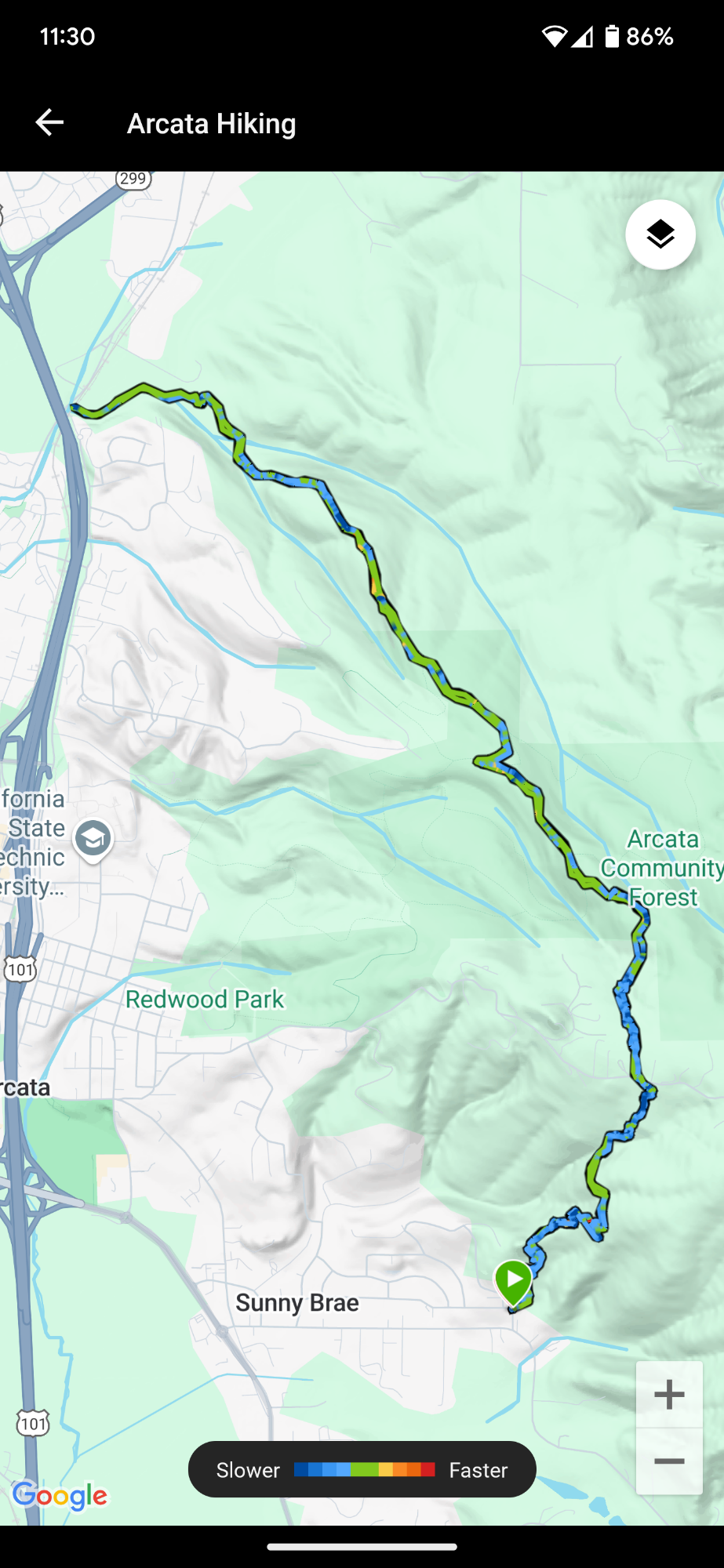 Hey, what if we yo-yo the Arcata Ridge Trail (ART) and what if it could qualify as a Fastest Known Time (FKT) route? Regardless, we’re always up for a forest hike! We march up the Sunny Brae Forest from the Margaret Lane trailhead topping out at, and crossing Fickle Hill Road. The ART meanders slightly through the Arcata Community Forest for about 3 miles before bottoming out at the West End Road trailhead. We take a standing break to consume snacks and water before treading back over our footsteps. We see members of the community and say hi. Total elapsed time is 3h 6m 14s with 1,971 ft. of elevation gain and it’s the first FKT for the newly created route! It’s a quick trip even with backpacks and we’re ready to go faster next time!