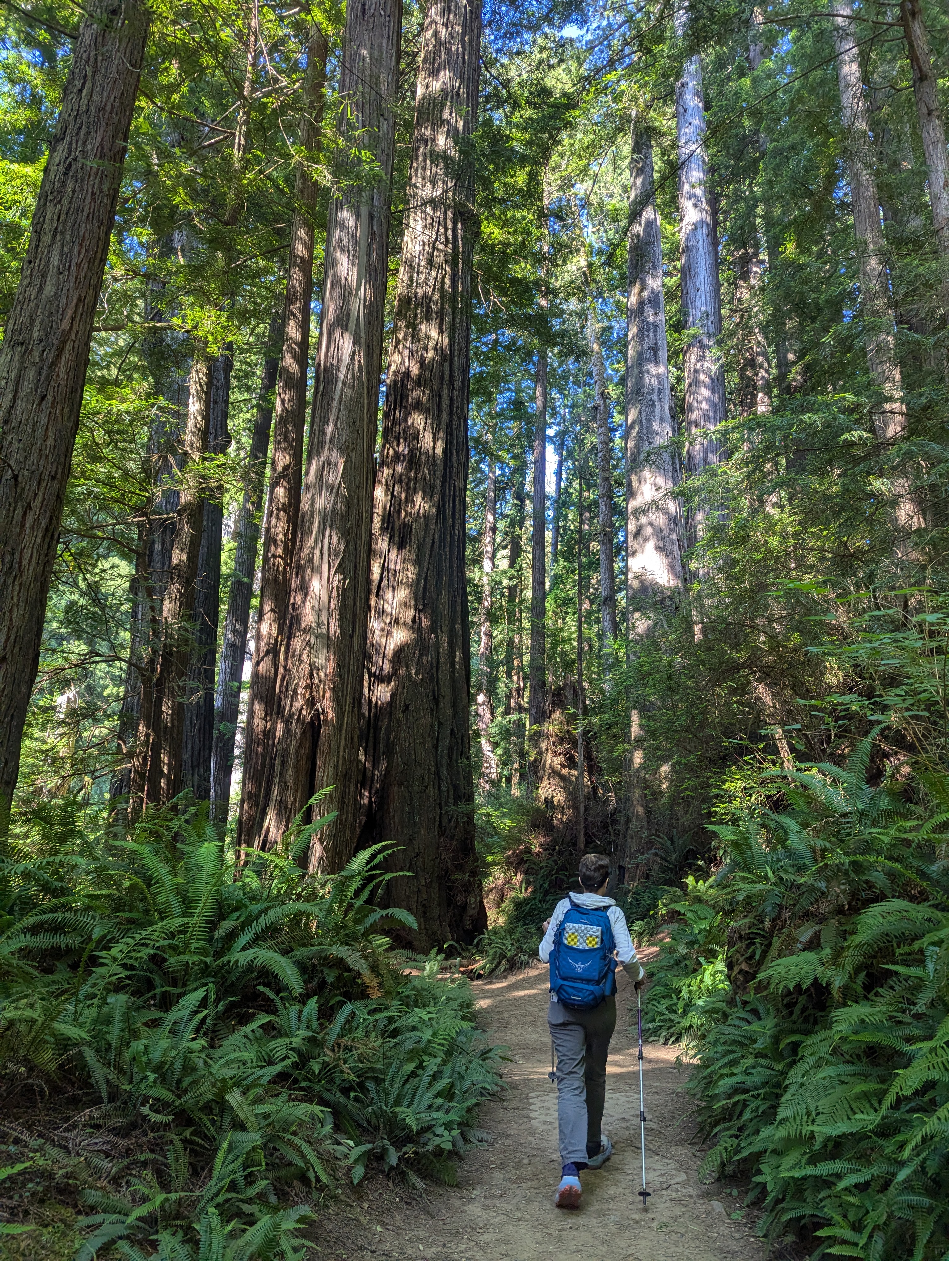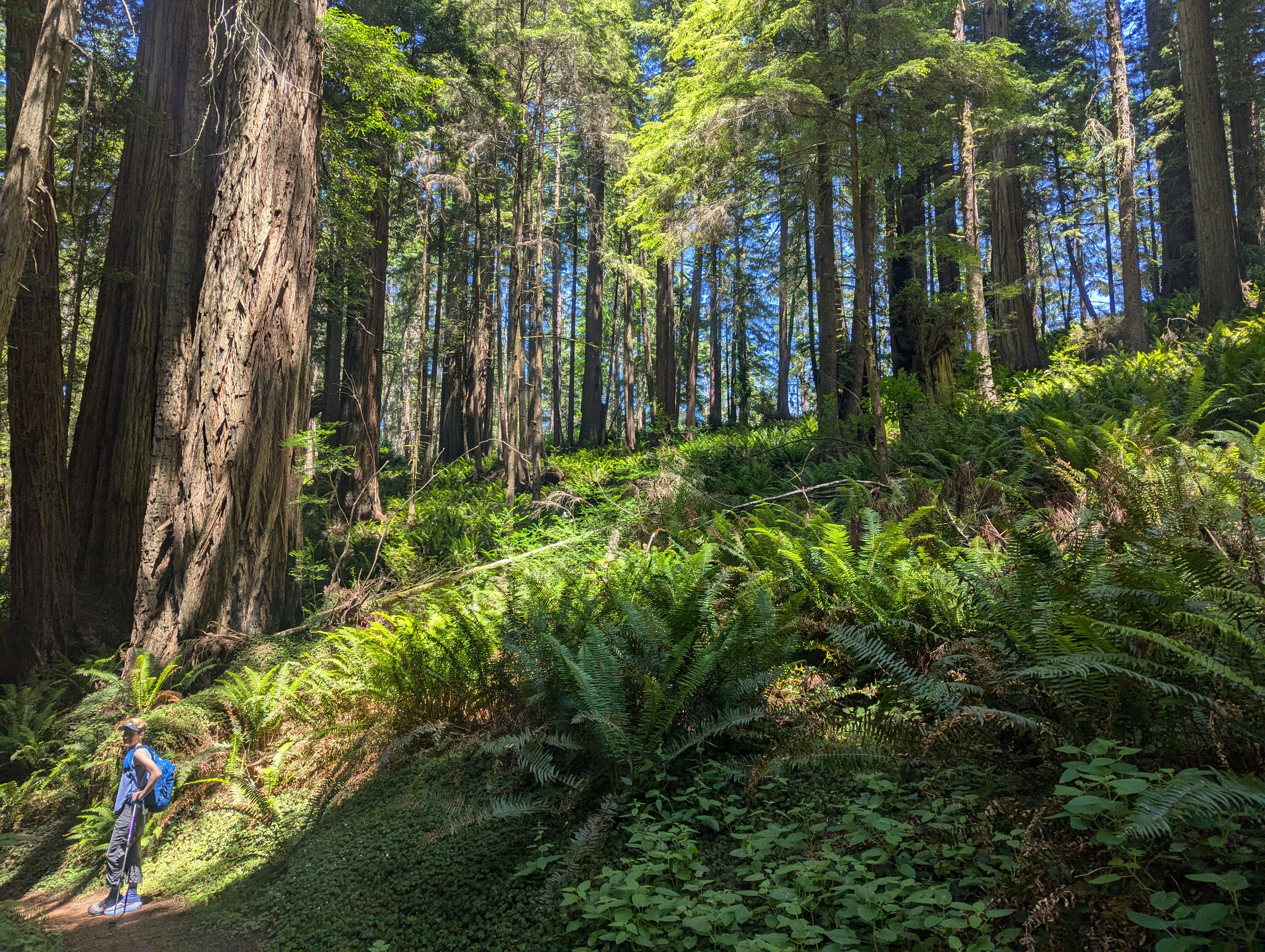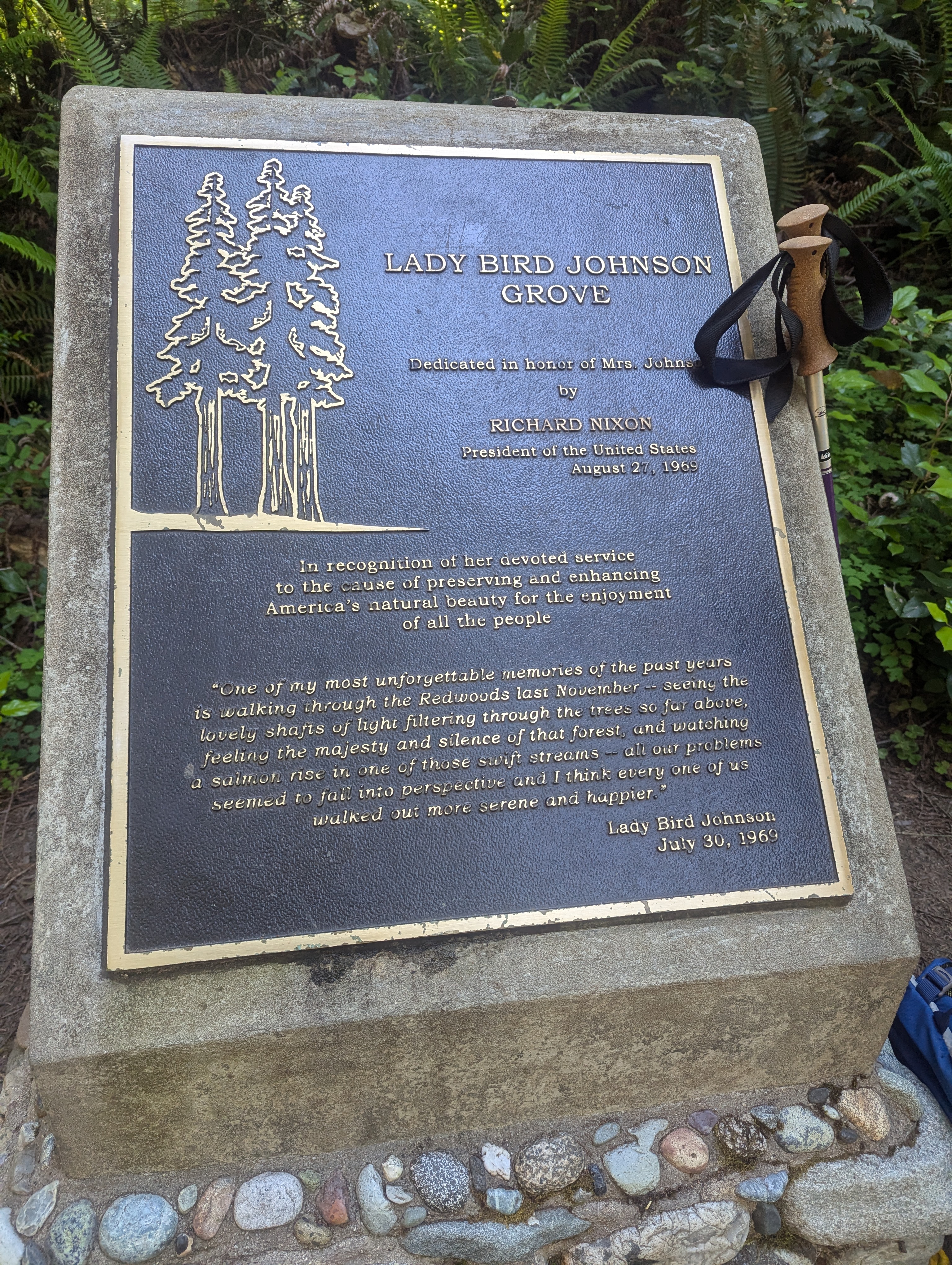 We frogger across Hwy 101 before starting the long, hot ascent to Lady Bird Johnson Grove. I guess three miles isn’t that long but it seems to drag on forever. On the plus side, no one is out here and we have the forest to ourselves. We take several breaks during the hour+, 1,400 ft. climb. When we hit the junction with the trail around the Lady Bird Johnson Grove, there are people everywhere. We loop around and use the restrooms at the trailhead parking lot. It’s grand central as people jockey for parking spots and don all their “gear” for the Lady Bird stroll.