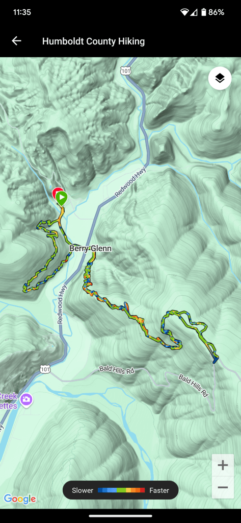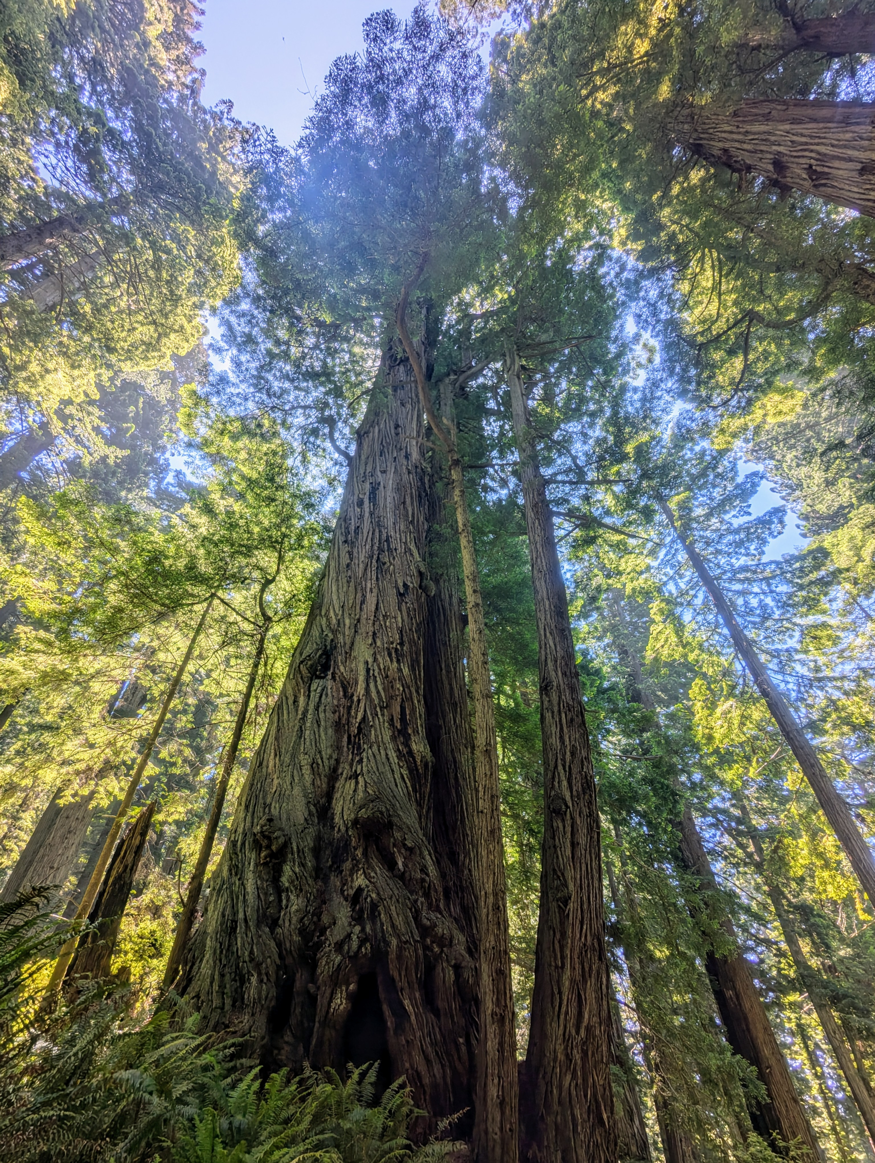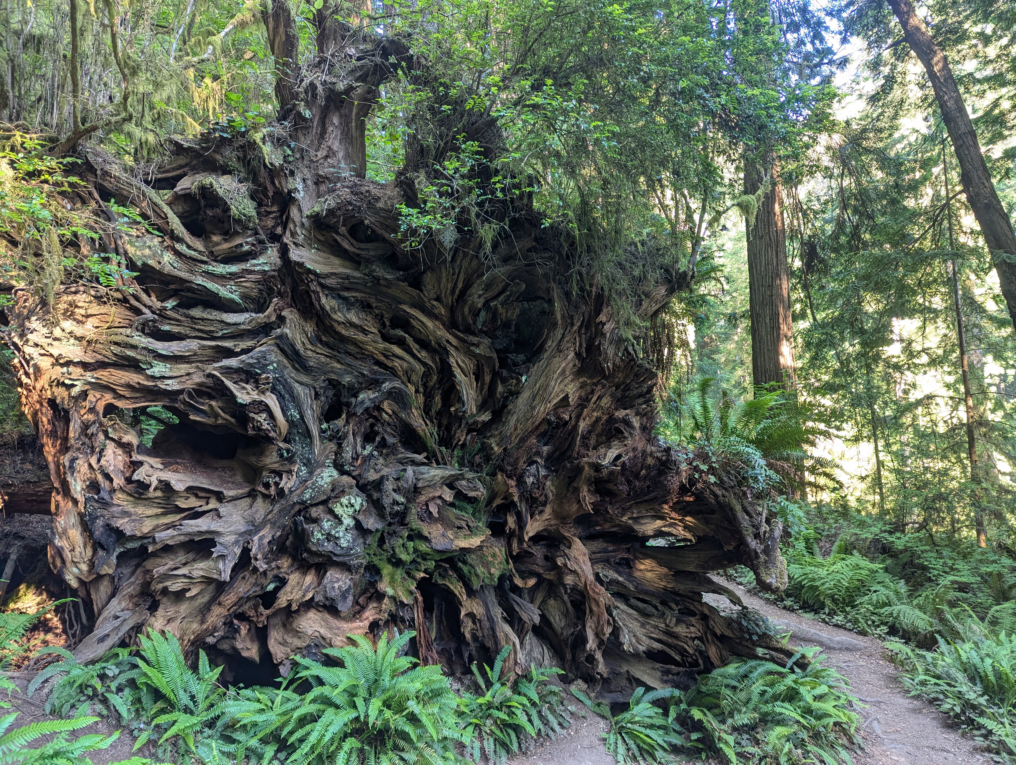 We frogger across Hwy 101 before starting the long, hot ascent to Lady Bird Johnson Grove. I guess three miles isn’t that long but it seems to drag on forever. On the plus side, no one is out here and we have the forest to ourselves. We take several breaks during the hour+, 1,400 ft. climb. When we hit the junction with the trail around the Lady Bird Johnson Grove, there are people everywhere. We loop around and use the restrooms at the trailhead parking lot. It’s grand central as people jockey for parking spots and don all their “gear” for the Lady Bird stroll.