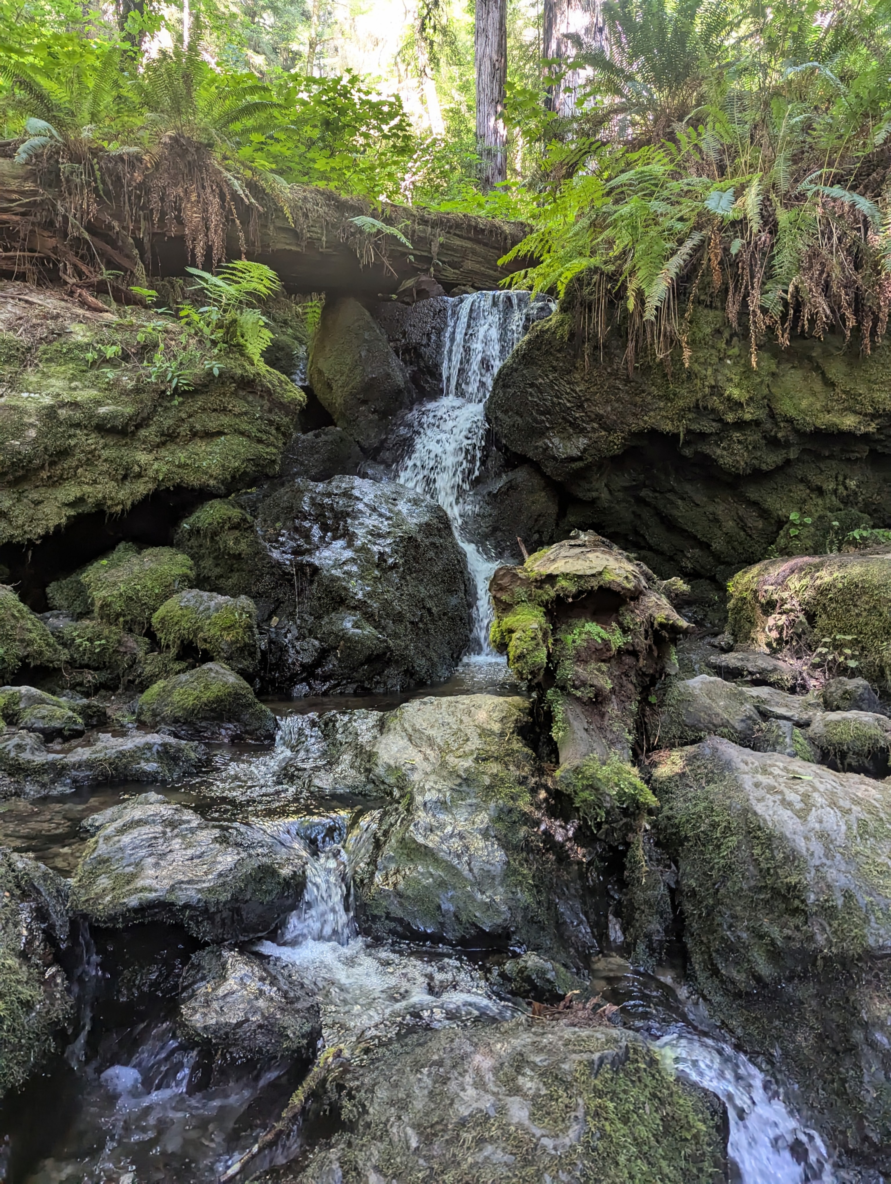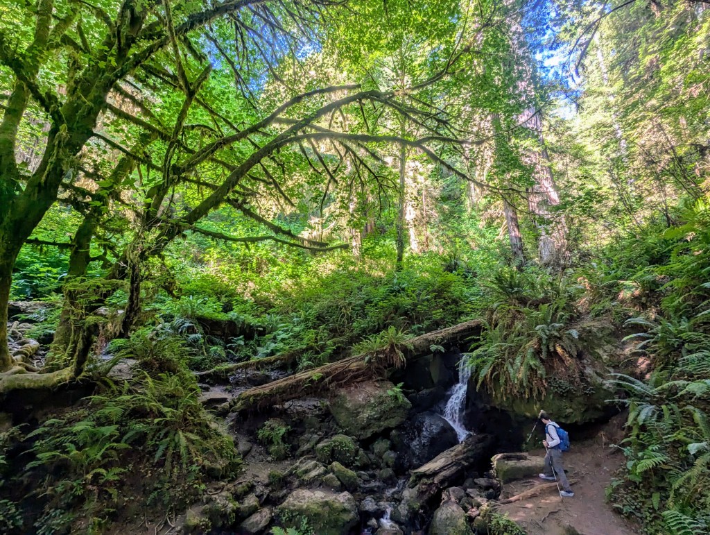 In an effort to beat the holiday masses, we depart from the Elk Meadow/Davison Road trailhead just after 9 am. There are only a few cars in the parking lot and the trail is quiet. We fork off of the Davison trail towards Trillium Falls, climbing gradually through redwood forest. It’s a short hike to reach the falls which are a beautiful cascade.