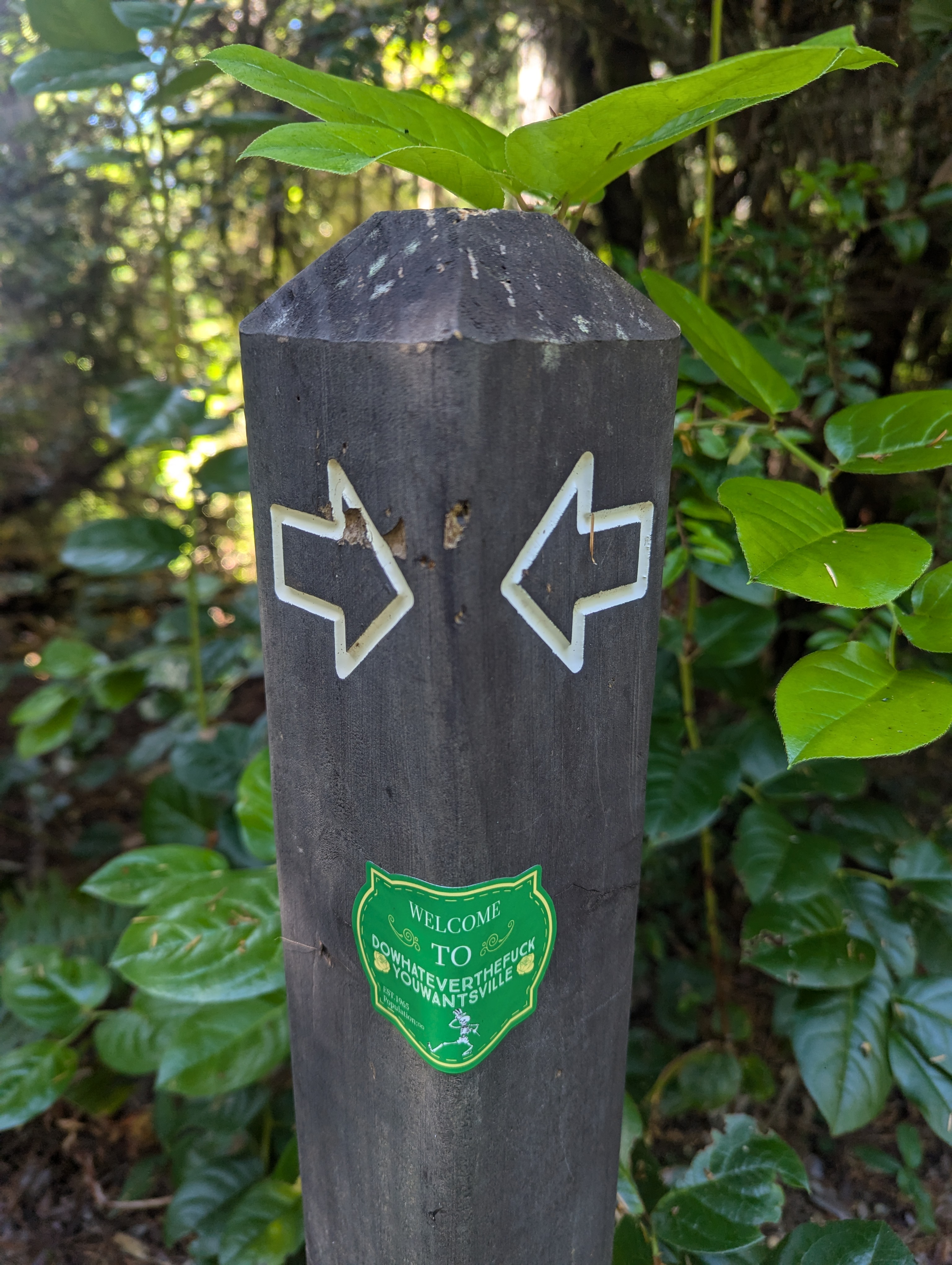 I hike for a few more hours passing red baneberry, clintonia, big aerial spider webs, and a varied thrush that lets me sneak up on it. The newest spectacle is a sticker on this already funny trail marker, “Welcome to dowhateverthefuckyouwantsville.”