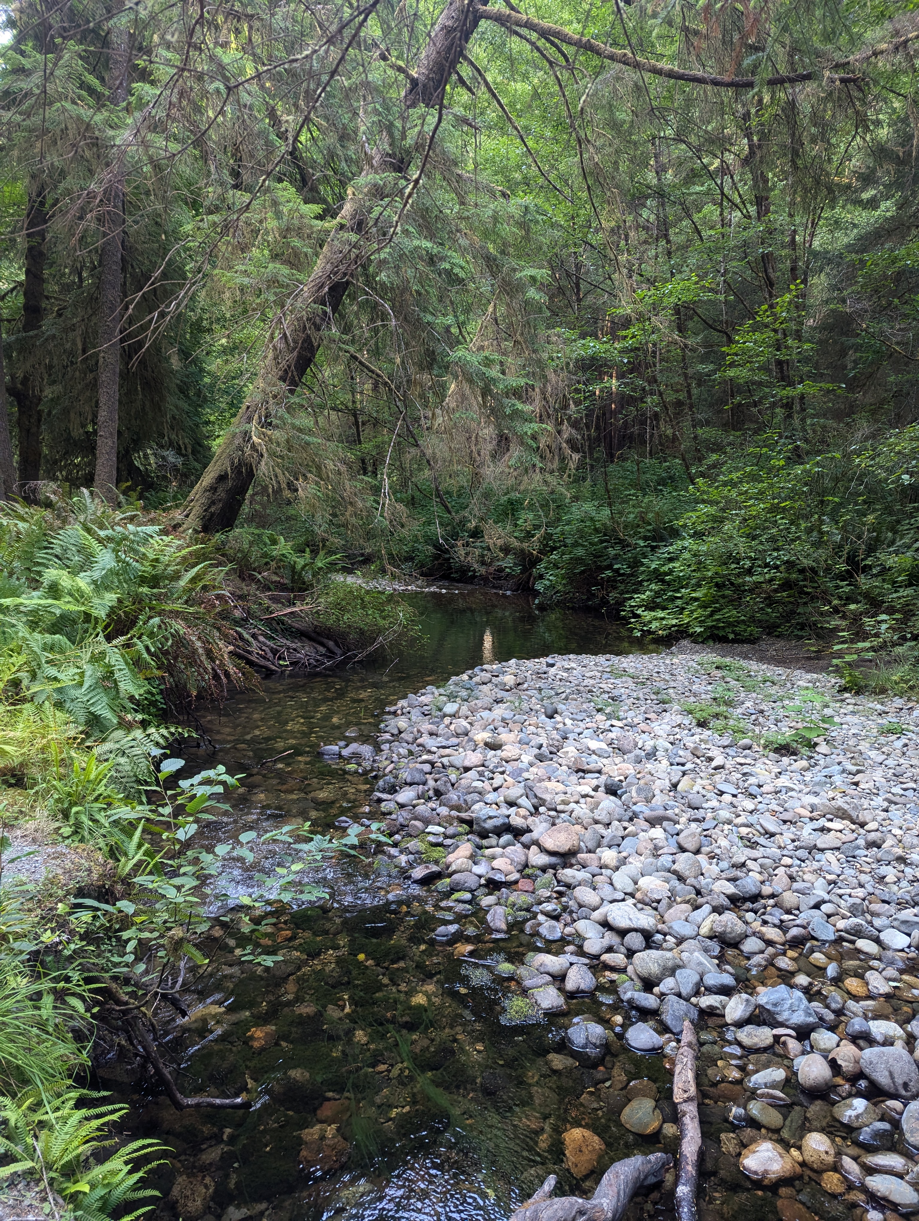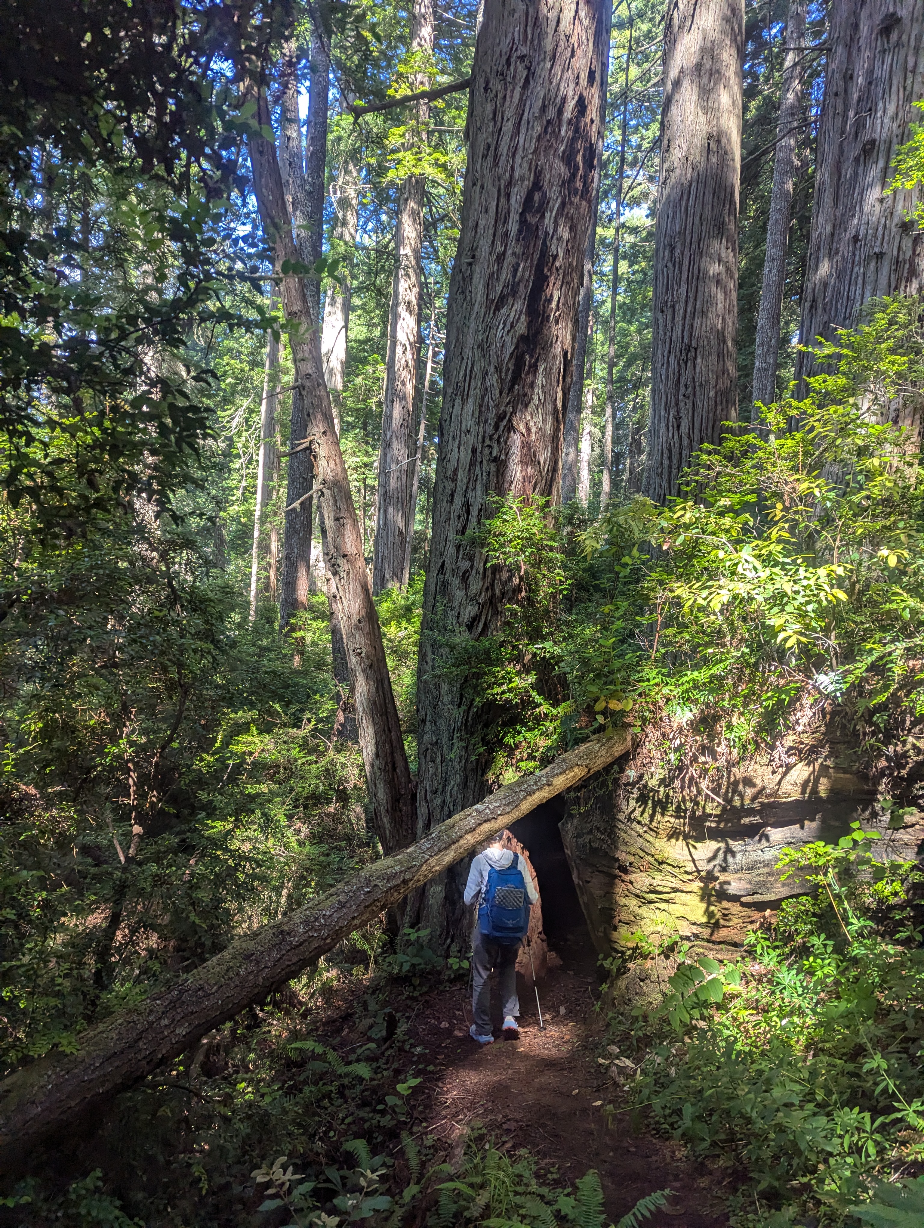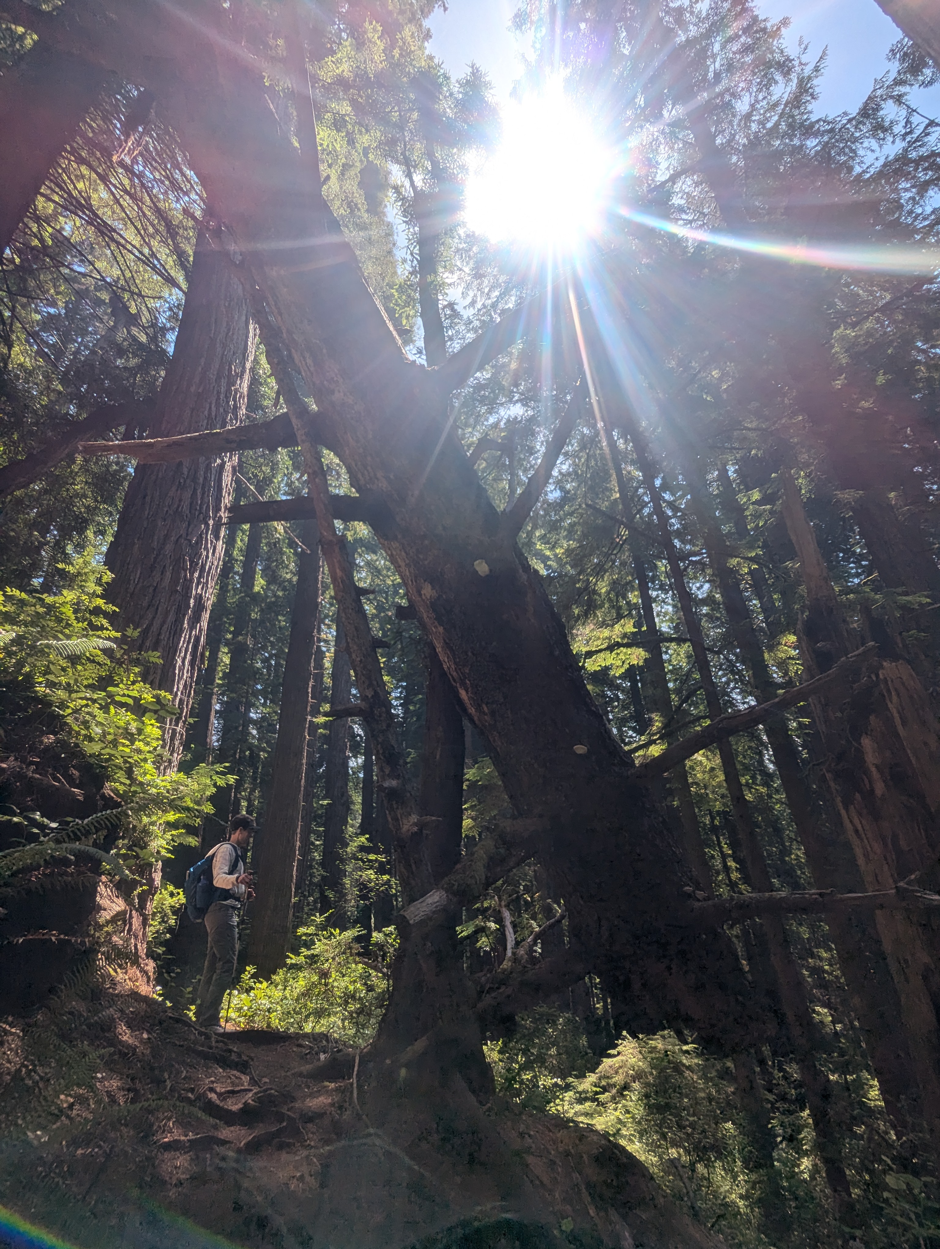 We pass cutoffs to Drury Parkway and Zig Zag #1 Trail. After this point, the trail gets more challenging and overgrown. After climbing through and over the massive root ball of a downed redwood, we take a short snack break at the edge of the trickling Prairie Creek.