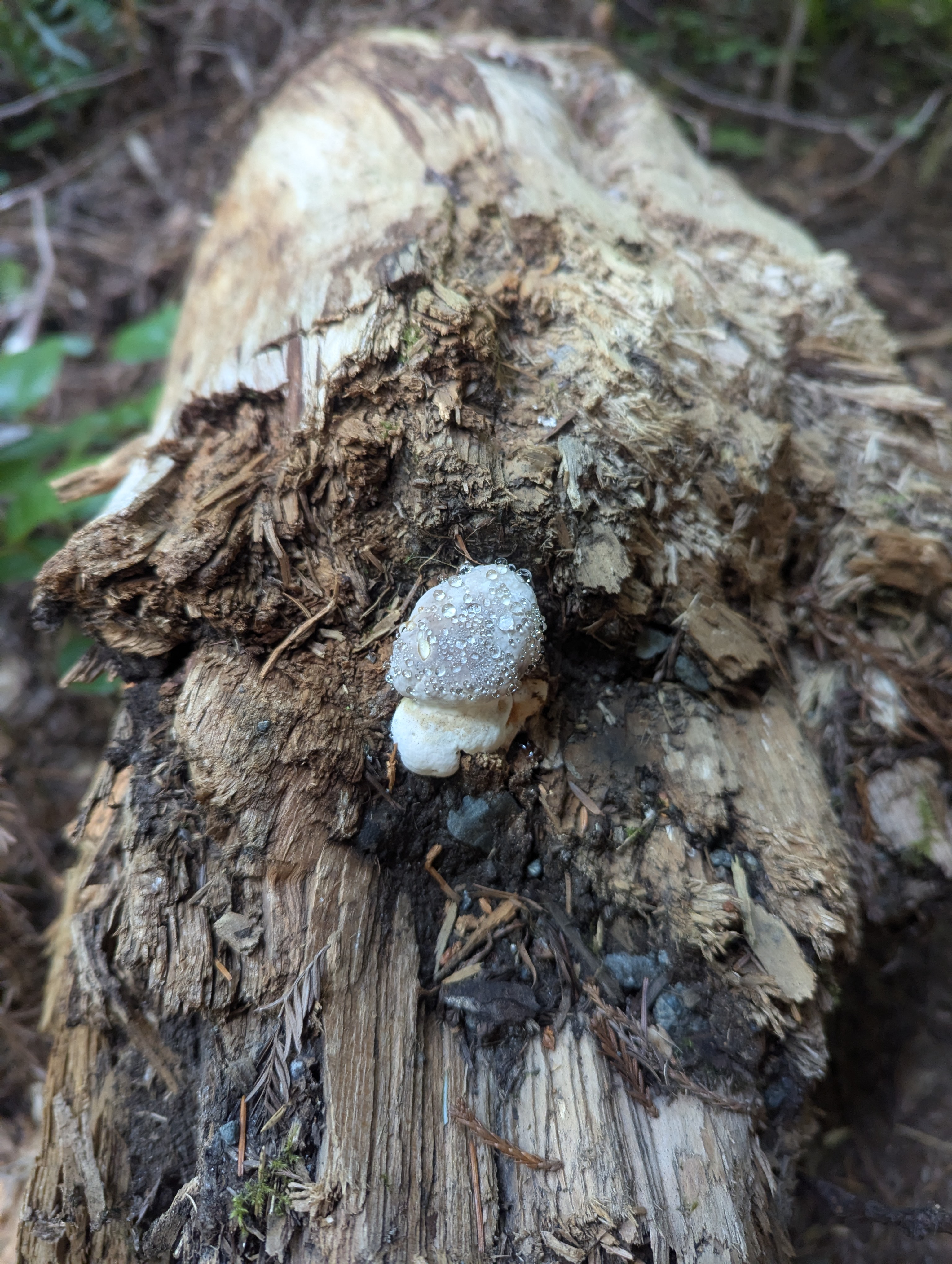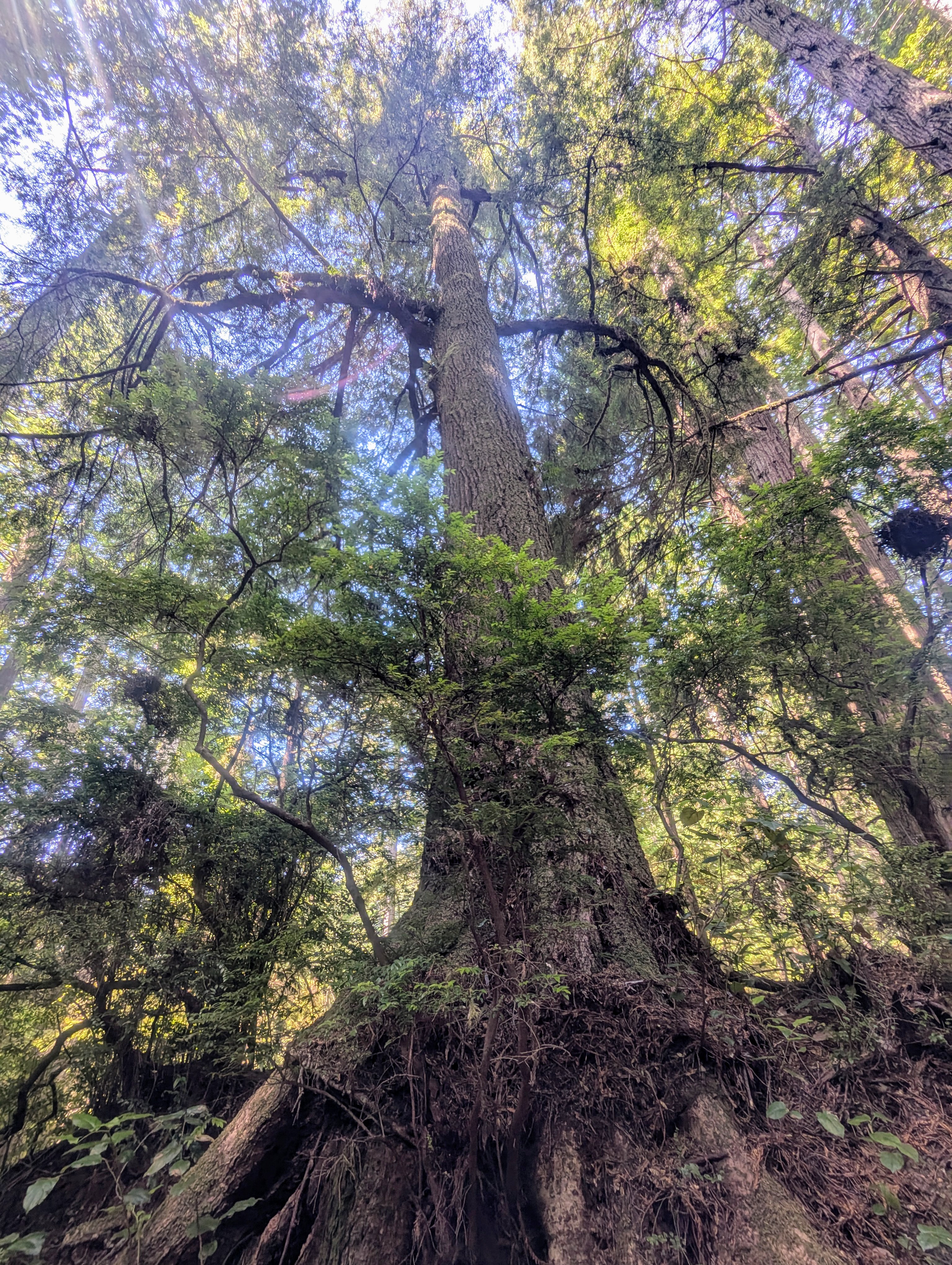 Deep in the dark forest, lunch is a bit chilly and I almost need another layer. After lunch, I realize that I have hiked a ways without restarting my watch. We pass a hidden trickle of water before finding some Western hemlocks who aerial roots are putting on a magnificent architectural display.