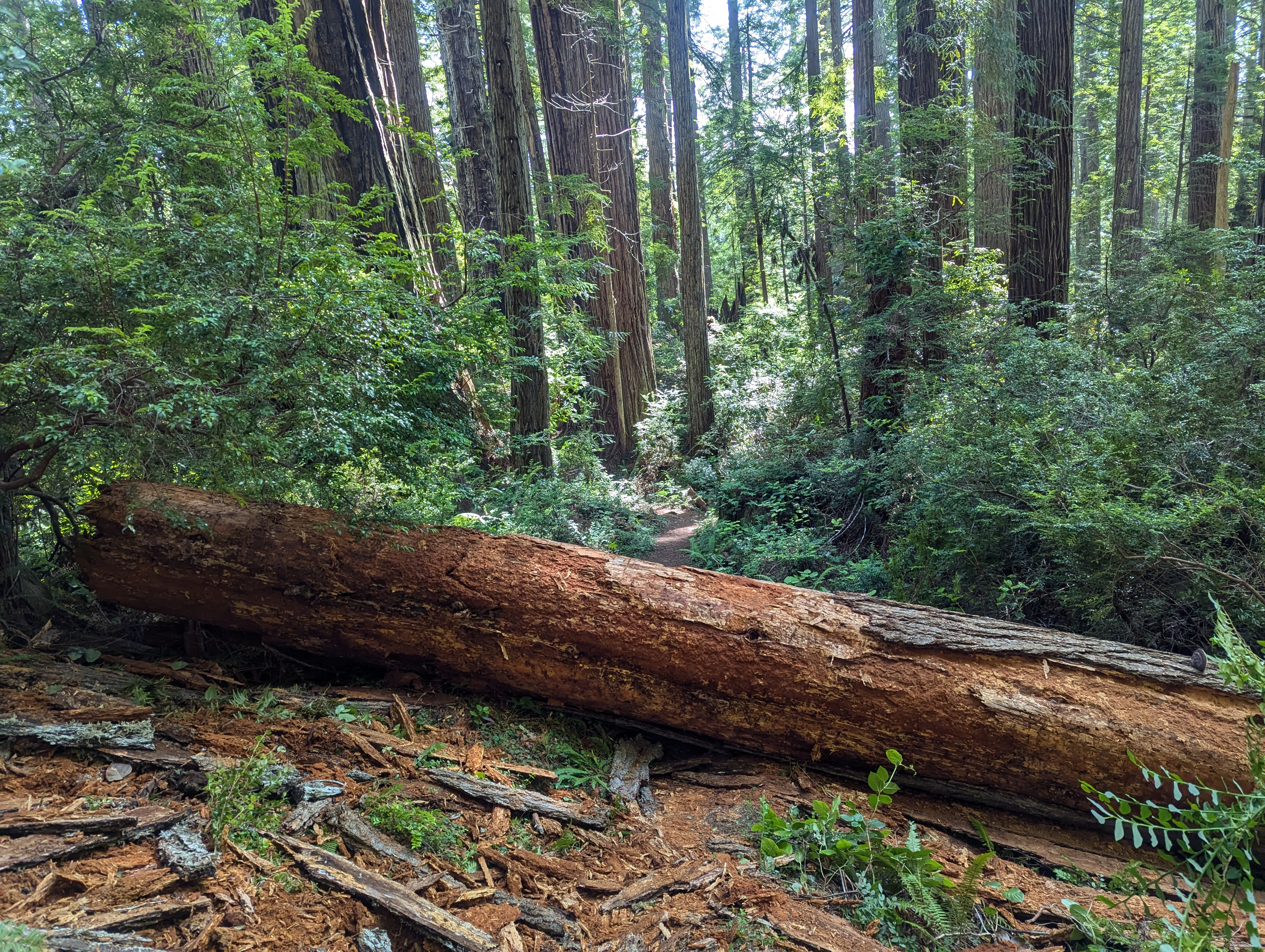 We start the steep climb up Zig Zag #2 Trail and pass a couple older hikers. To our surprise, we are stopped by a giant redwood across the trail. The thing is way too big to climb over. Erin is able to squeeze through between a broken end and a large huckleberry shrub. I take the long route and bushwhack through the dense forest. This tree was definitely not down when I hiked through here a week ago.