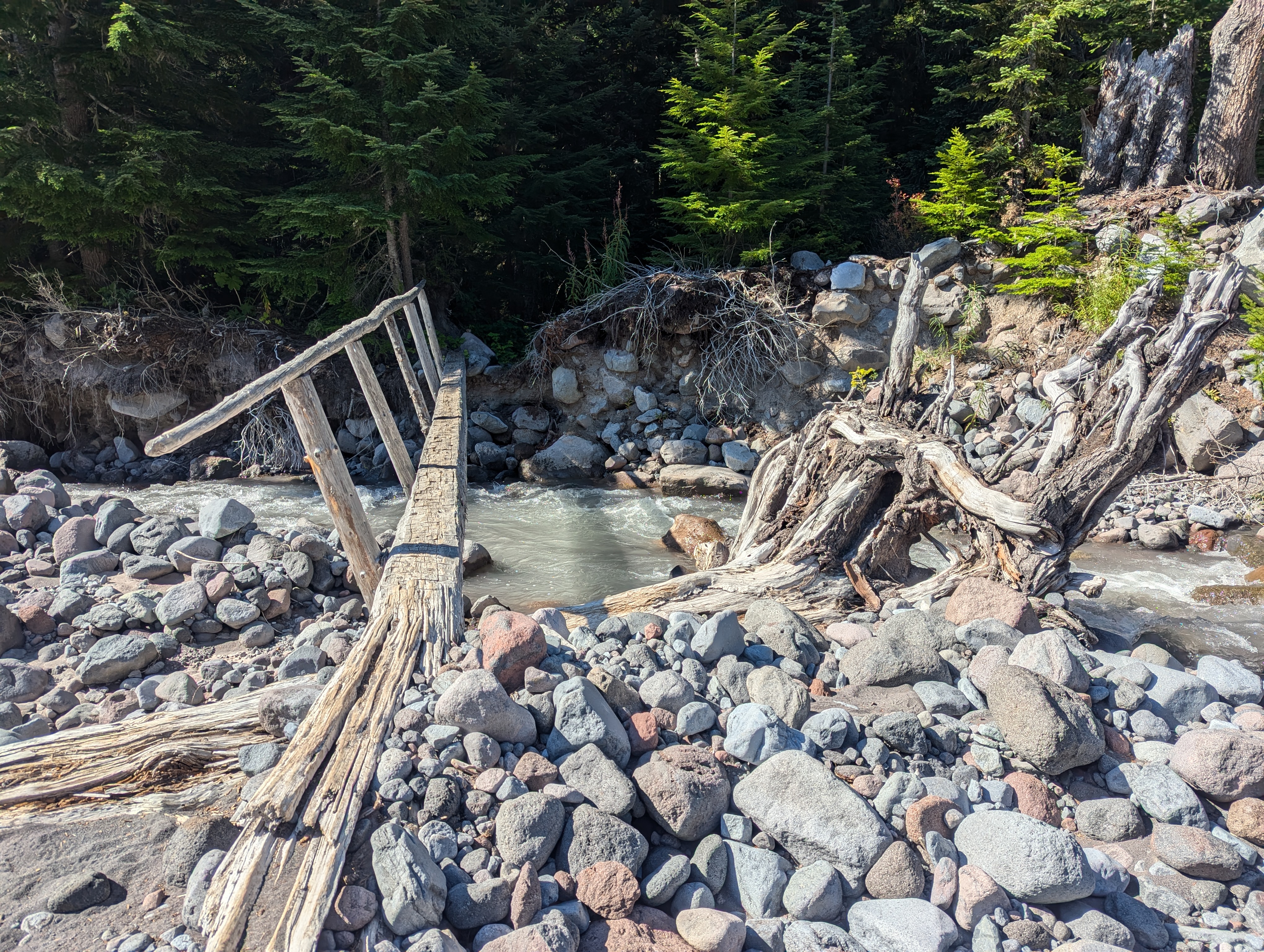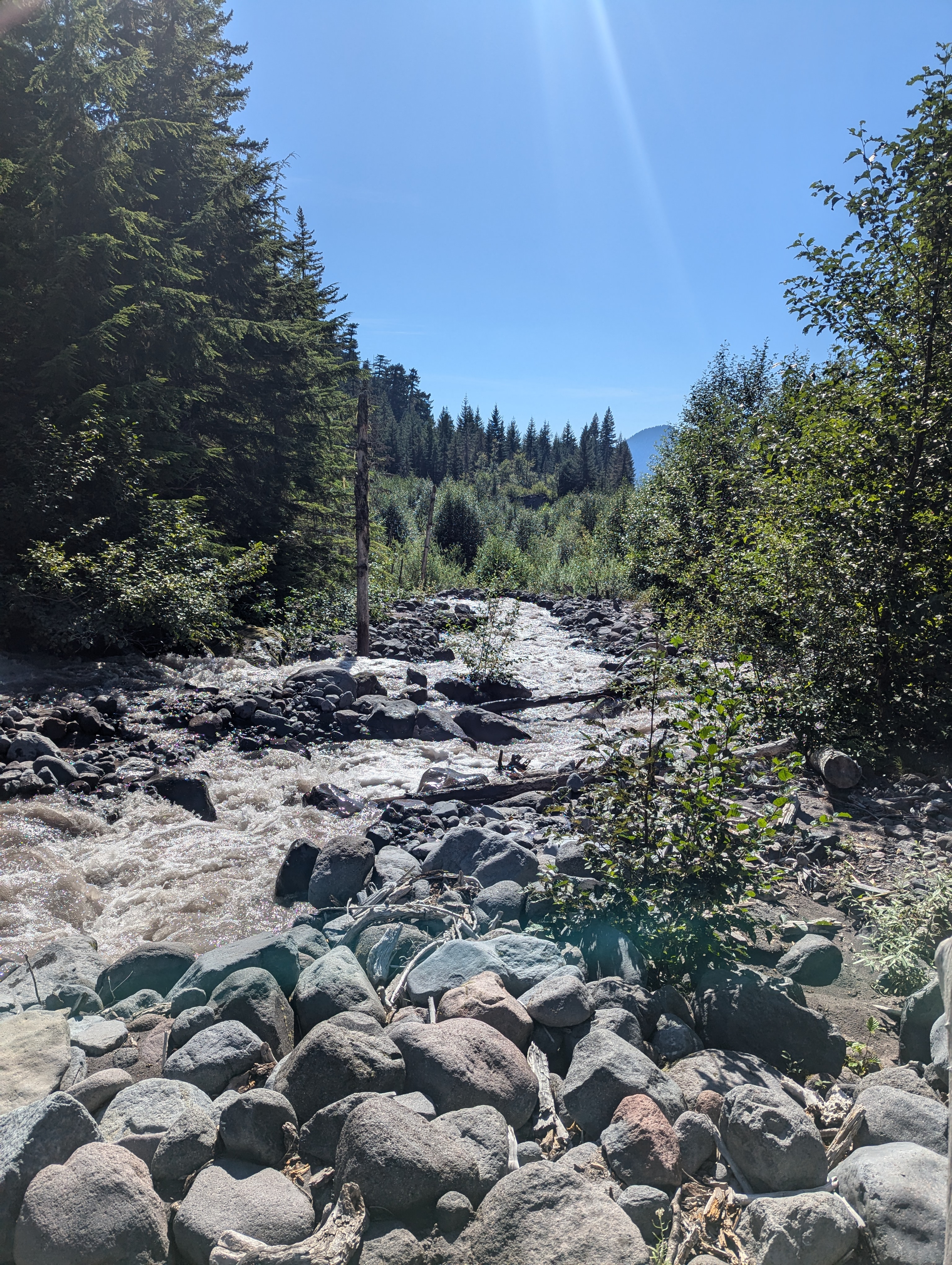 The roaring fingers of the Kautz Creek are audible as the trail switchbacks down to the river. I push through the brush and start crossing the outer fingers of the creek. But then there’s no getting around the deep rushing torrent. I slip my toes into the chalky water to feel around for a good spot to put my foot. The current is strong enough that I have to use all my strength and focus to keep moving one foot in front of the other. My poles vibrate against the milky cascade as I slowly pick my way across. With each step, the water tries to pull my foot and me downriver. Once safely on dry rocks, I see red flags trailing through the brush and I follow them to one final shallow crossing.