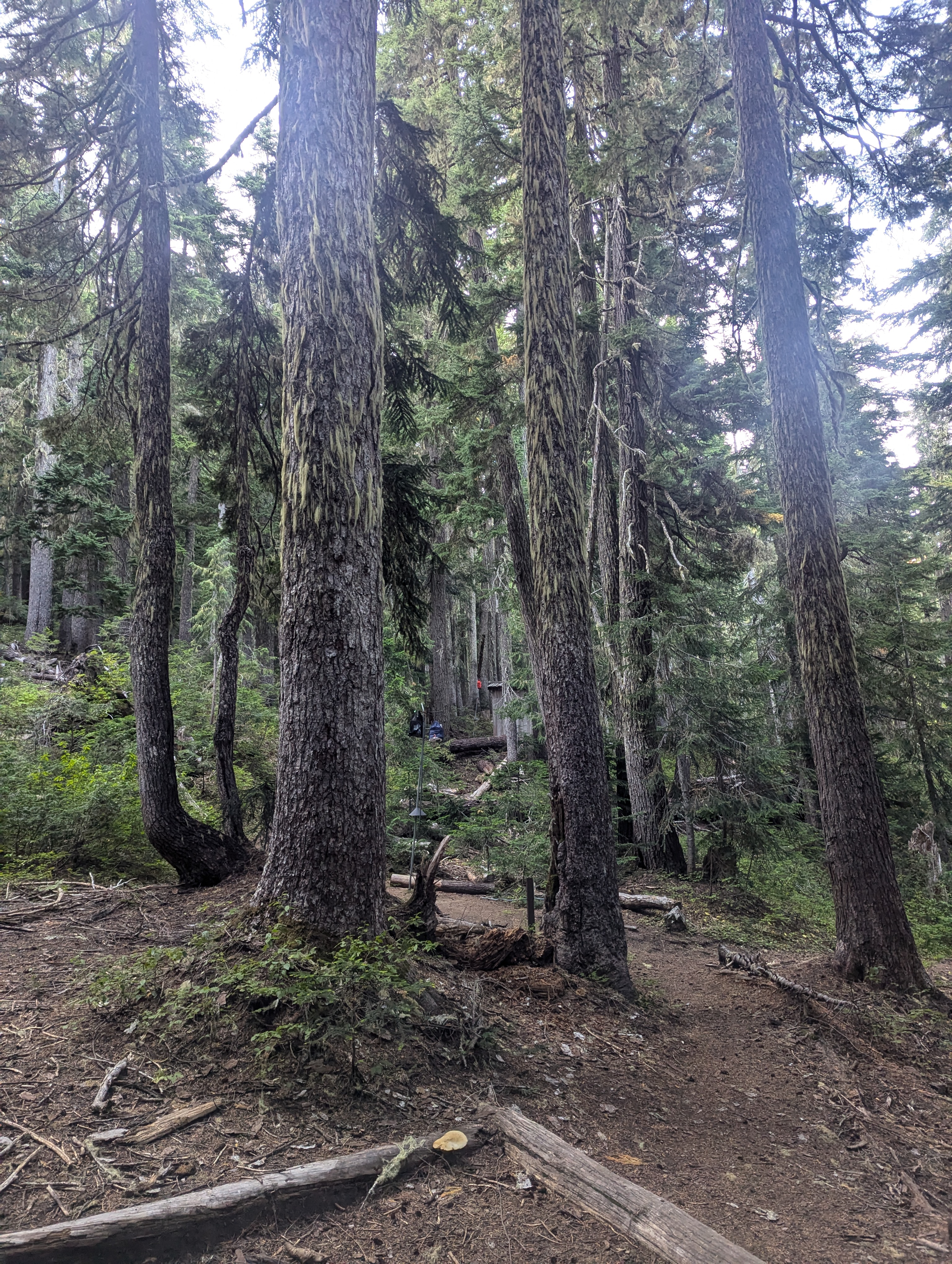 I pass a group of guys at Pyramid Creek camp who are all down at the Pyramid Creek getting water. Luckily, there’s a little wooden bridge across the deepest part of this creek. I walk almost another mile before I take a short water and snack break. I check the far out app, which I’m trying out for the first time, and see that I have 8/10 of a mile to where I’ll get water just before my camp. I pass up other lovely water sources only to arrive at a virtually silent creekbed. I head upstream in search of the little trickle that I hear. I certainly don’t want to walk a half mile past camp and then back so I’ve got to make this work. There’s water pouring through the moss into one little pool of clear water that’s deep enough for me to scoop out of. Even though the water is ice cold, I do filter it and fill all my bottles. Just as I’m finishing, I see Ledge Girl come by but it seems she doesn’t see me. Loaded down with 2.5 liters of water and 5-6 days of food, I huff and puff and work real hard to catch up with her. We chat for several minutes before I arrive at my camp. It’s about 5:15 pm and she’s still got another 6 miles to go. I’m a little worried that she won’t make it before it’s dark.