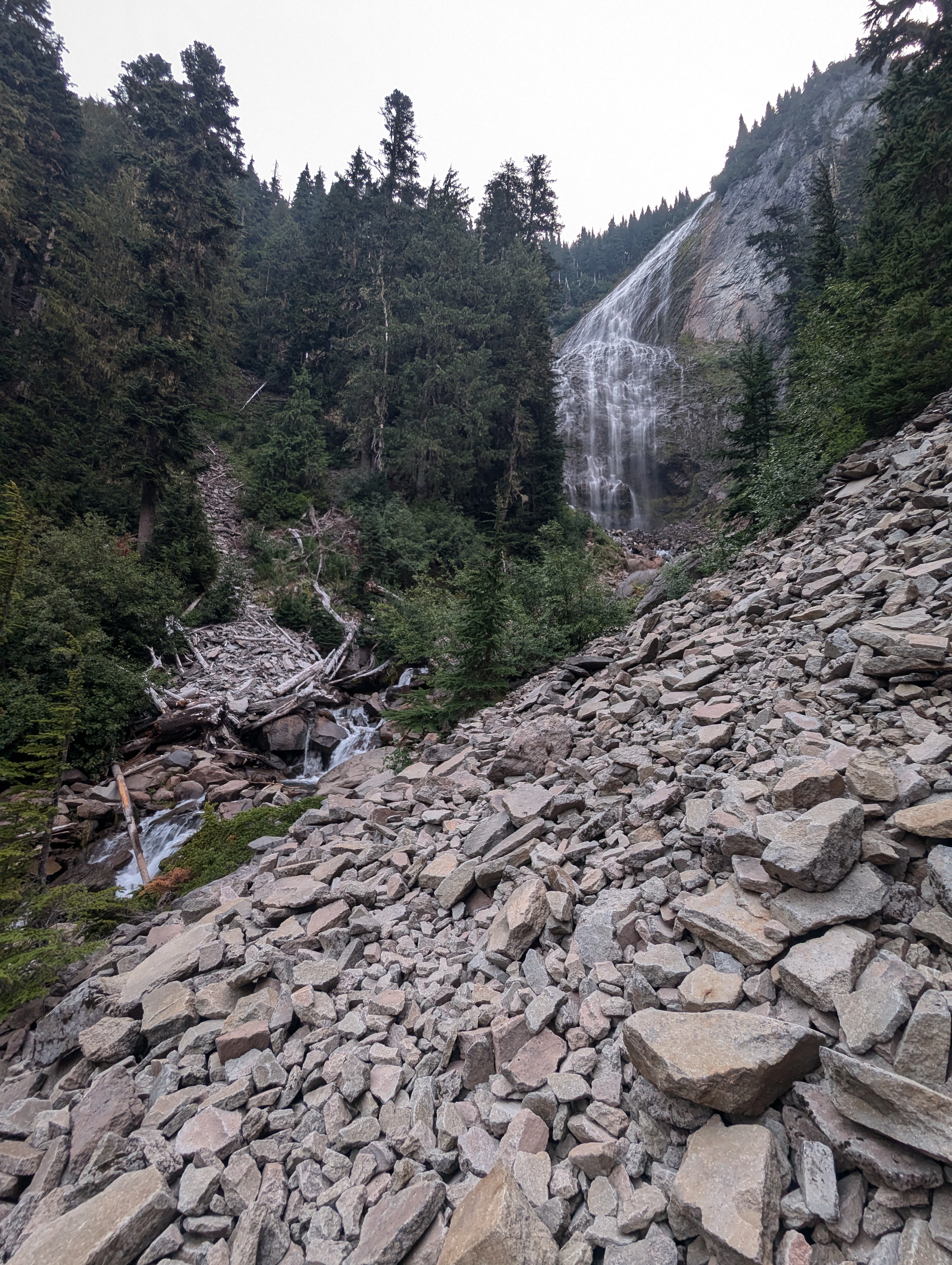 I stop just before Marmot Creek for a break. Several weekend warriors pass me as I eat second breakfast and take my medications. I decide to get some ice cold water from the unnamed runoff and push some miles downhill. Down, down and more down. Towards the bottom I pass a few hiking pairs and they already look miserable. I definitely don’t envy the climb that is before them. Just before the Carbon River, I check out the beautiful Cataract Creek.