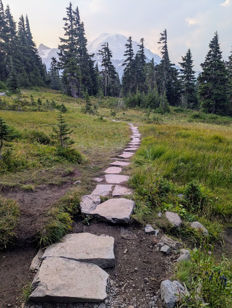 I fill up on ice cold water before hiking a short distance to connect with the Northern Loop Trail. The climb ahead of me seems daunting but at least I only have 3-4 miles to camp. It’s about 1:45 pm and I’m ready to do this! Immediately I’m cutting through tons of cobwebs and I’m filled with dread. I’m about 4 switchbacks into the climb when a father son team come bounding towards me. They are doing the Northern Loop as part of their Wonderland and tell me about all the bears they saw. We have a nice chat and I’m silently grateful that they’ve dealt with the cobwebs. The forest is thick and dark but the switchbacks are perfectly graded and I move along at a good pace.