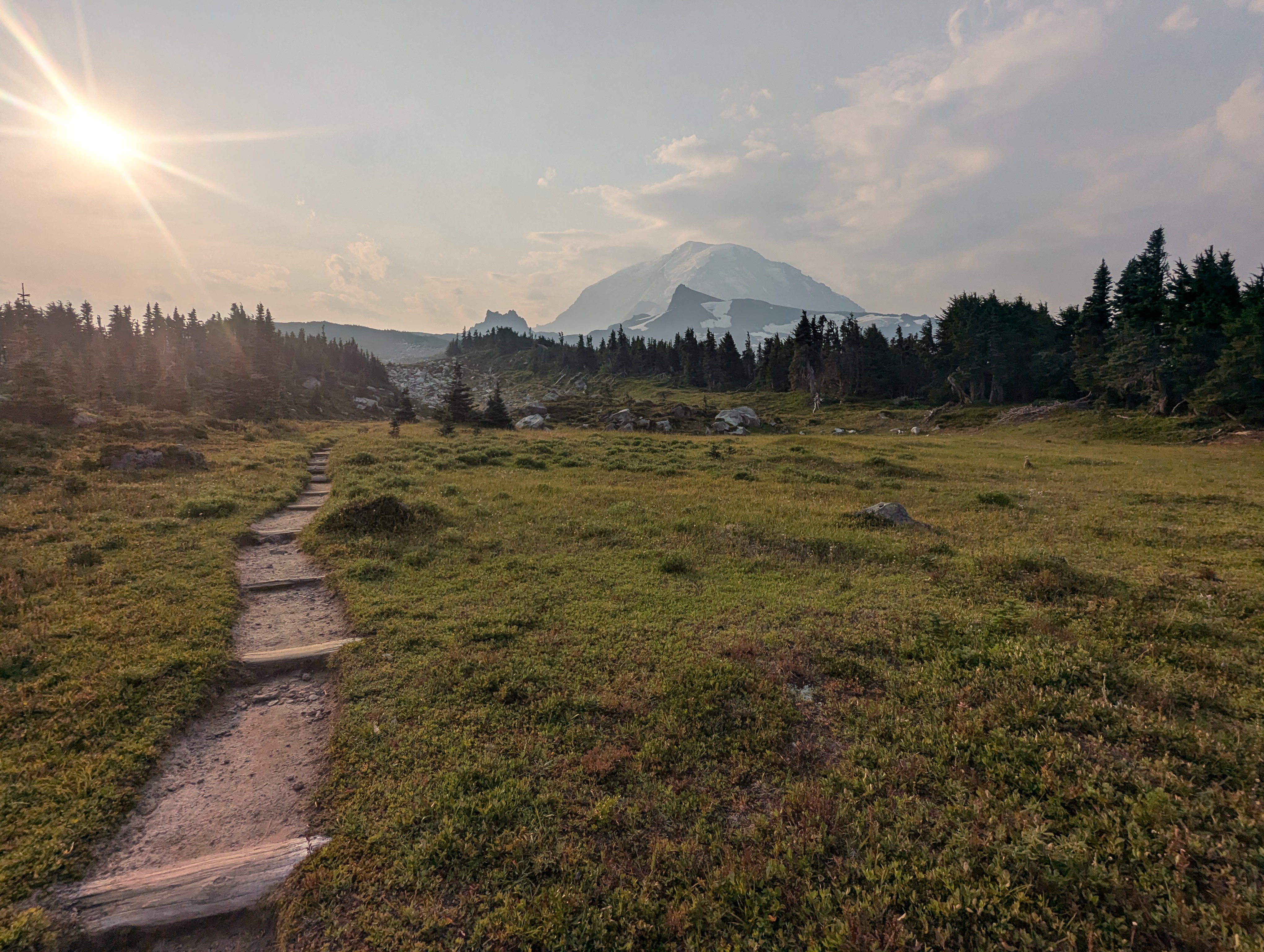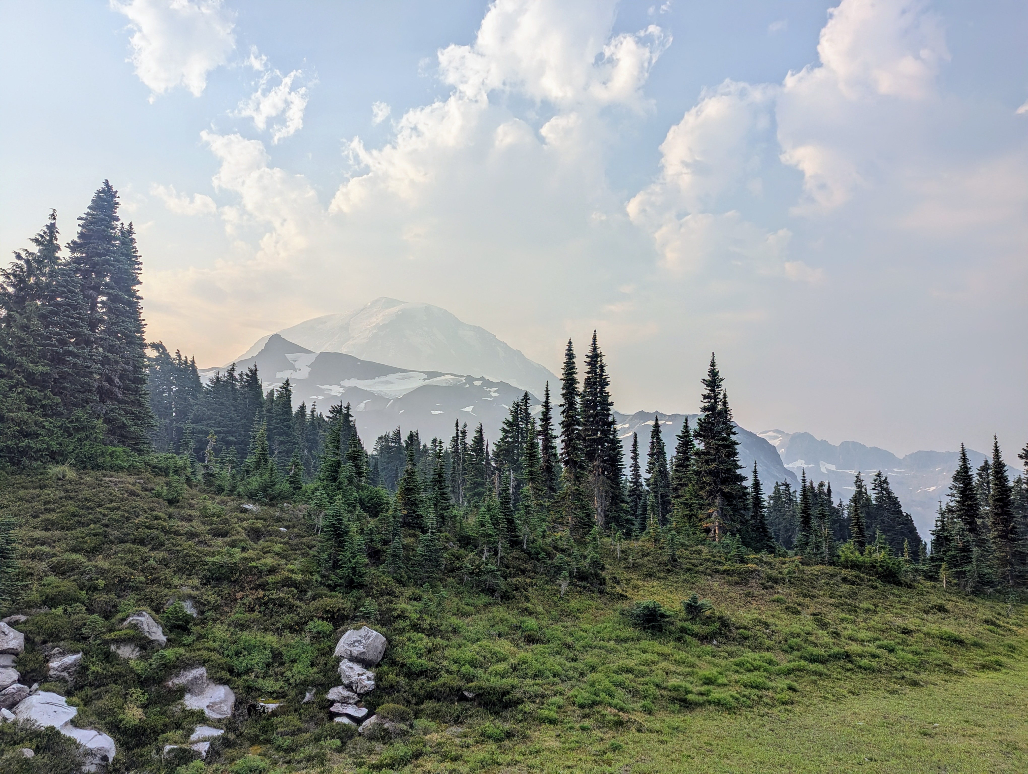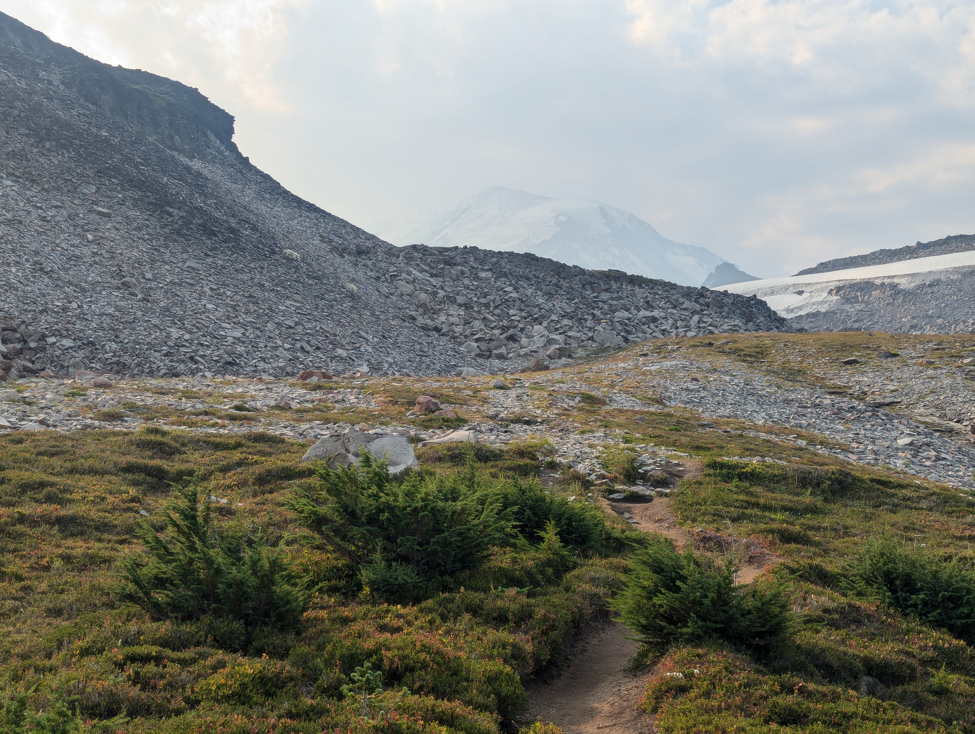 I switchback up through the forest until the trail opens up to a view of Tahoma. The smoke is still causing a pretty thick haze. I stop for a breakfast break at a creeklet and lean up against a giant boulder. I allow myself an extra bar for breakfast and sip on my instant coffee and chocolate concoction. In a small, 11.5 oz. simply lemonade bottle, I mix one via coffee packet and then some Ghirardelli hot cocoa mix. It all goes into solution pretty well even in cold water. It’s so yummy that it makes me want chocolate in my coffee at home. A hiker with a small backpack and ice axe goes by not long before a guy with a giant backpack and skis. Oh right, it’s Saturday and I’m not that far from the Mowich Camp trailhead.