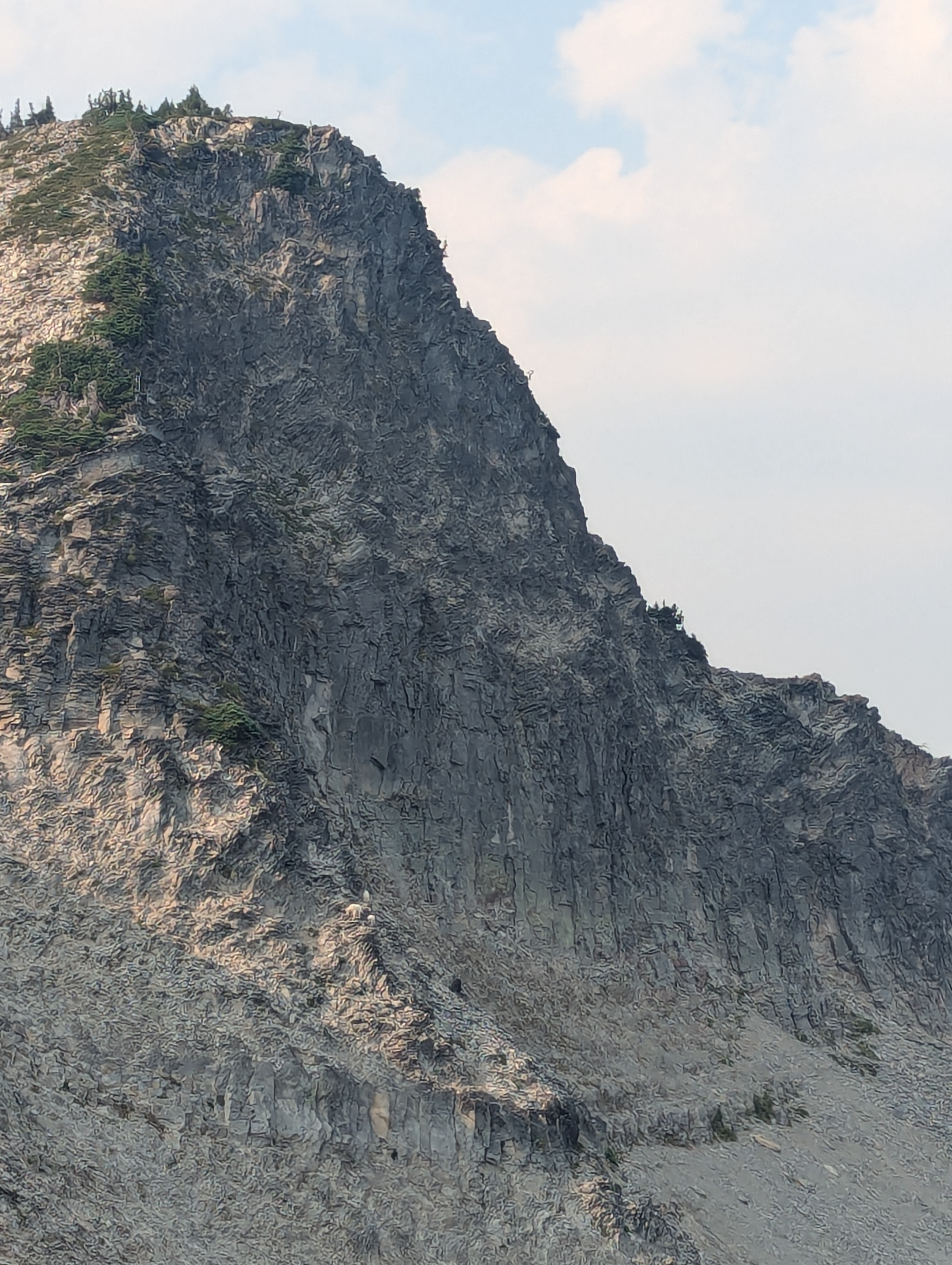 Just as I’m starting to descend, I am met by a father son team. They say they are obliged to tell me to look for the goats around the corner just ahead. I work my way down the rocks and then peer at the large rock tower to my left. I look and look but don’t see anything. I can hear the cadence of volcanic rock hitting volcanic rock but rocks can easily fall on their own. I continue to scan the enormous cliff for any movement and then there they are. One Mountain Goat steps forward to a precipice and is now visible in the sunlight. I can make out three white dots laterally crossing a seemingly perilous and impossible cliff. I start to record them as a few mosquitoes test my will not to flinch.