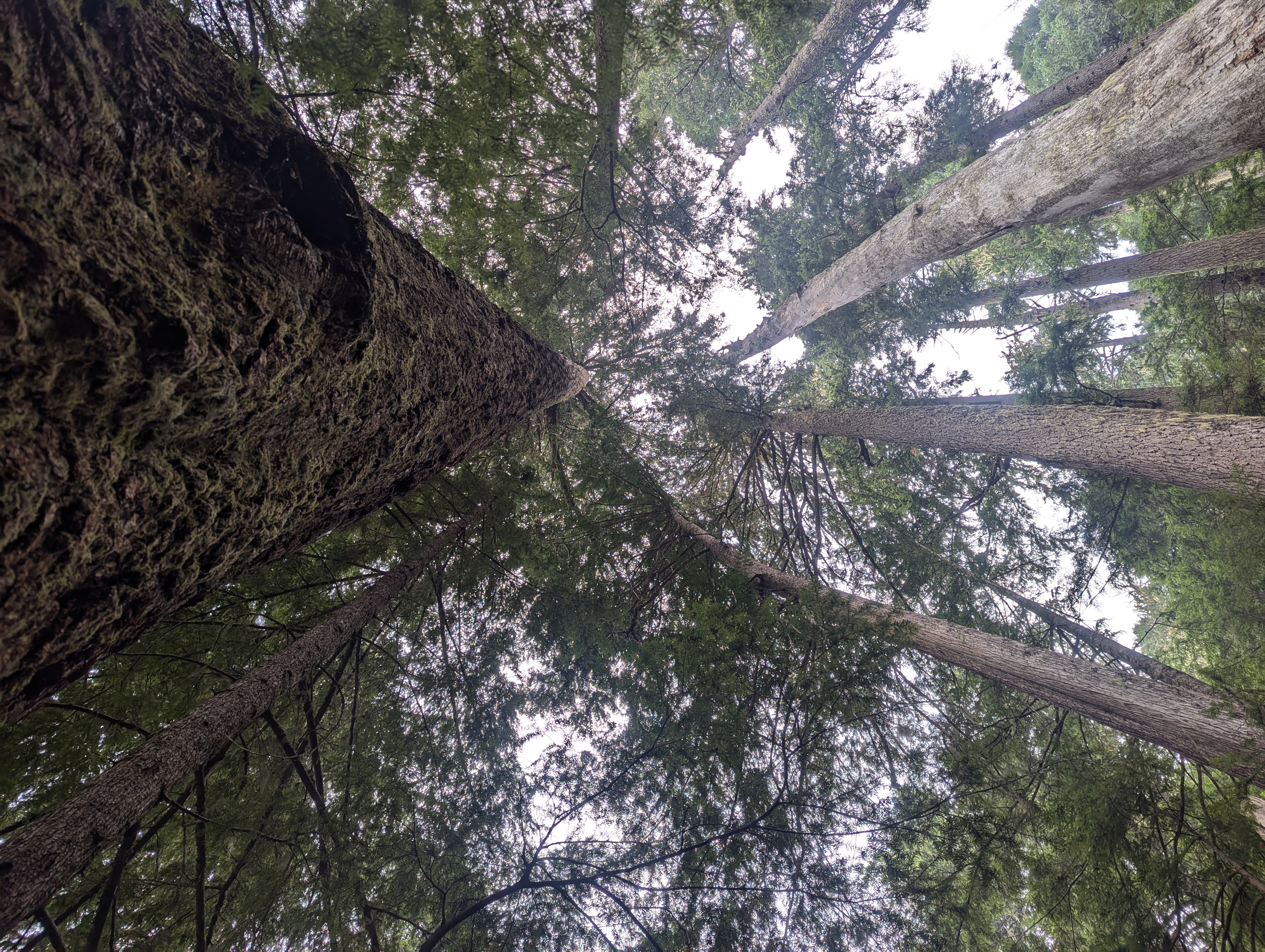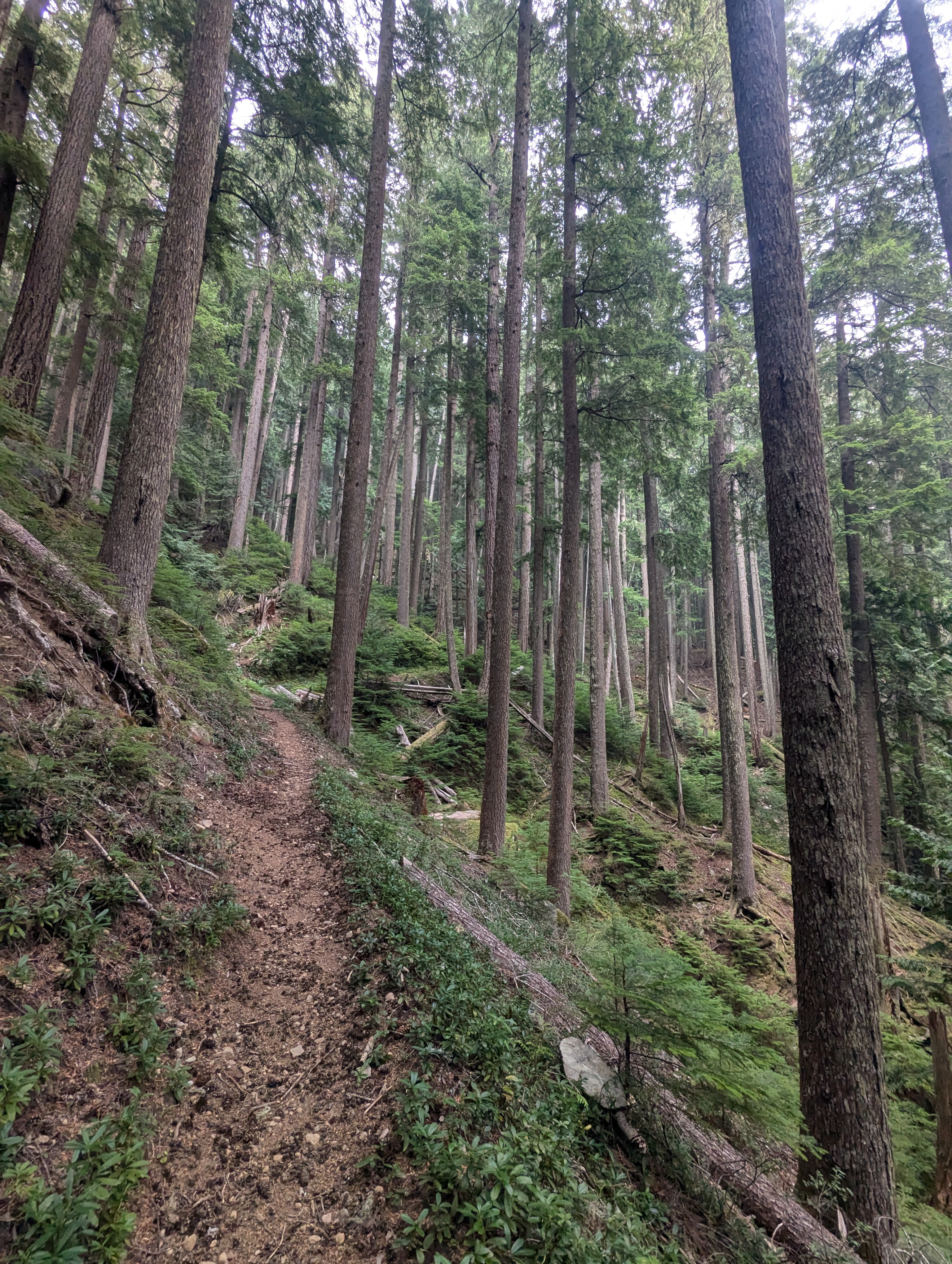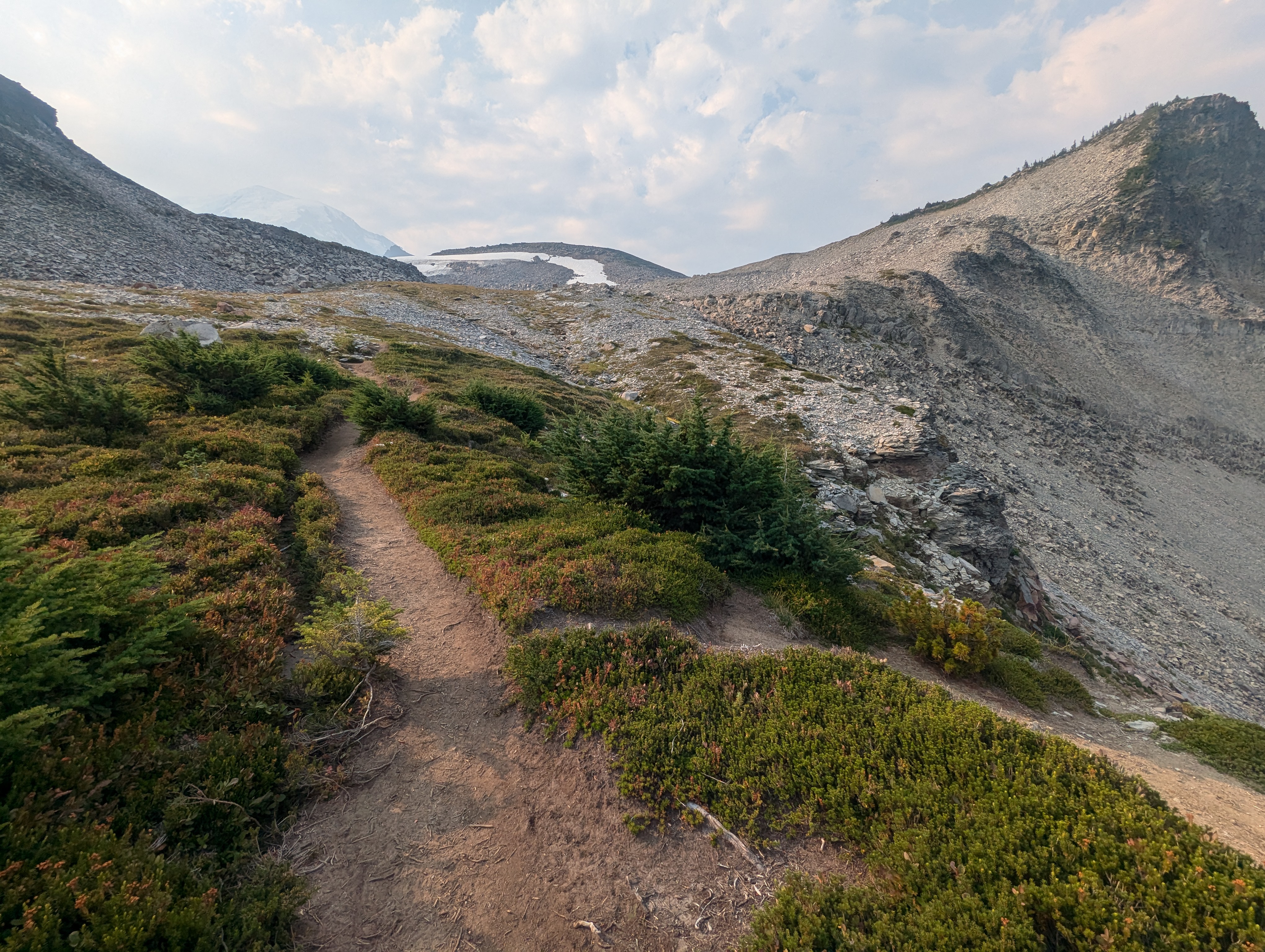 I’m lost in my thoughts as I use the Merlin app to confirm I’m hearing Canada Jays. To my surprise, there is an older lady headed towards me and she’s in a chipper mood. Turns out that Mary is nearly 70, just out crushing a few days in the backcountry and is very chatty. She and I stand talking with our packs on for at least 30 minutes. She’s a local, earned a masters degree and became a flight attendant and loves to ski. We even chat a bit about the Loowit Trail! I hike on, but not too much farther before sitting down for a break. It’s nearing 4:30 pm and I’m closing in on finishing the climb to camp. In the middle of the trail is what looks like very fresh barfed up grass. Now, my cats like to eat grass and vomit it up but what other animals do this? And is this obviously large animal going to come and get me tonight? Just as I emerge from the forest I look back towards the valley from which I’ve just climbed.
