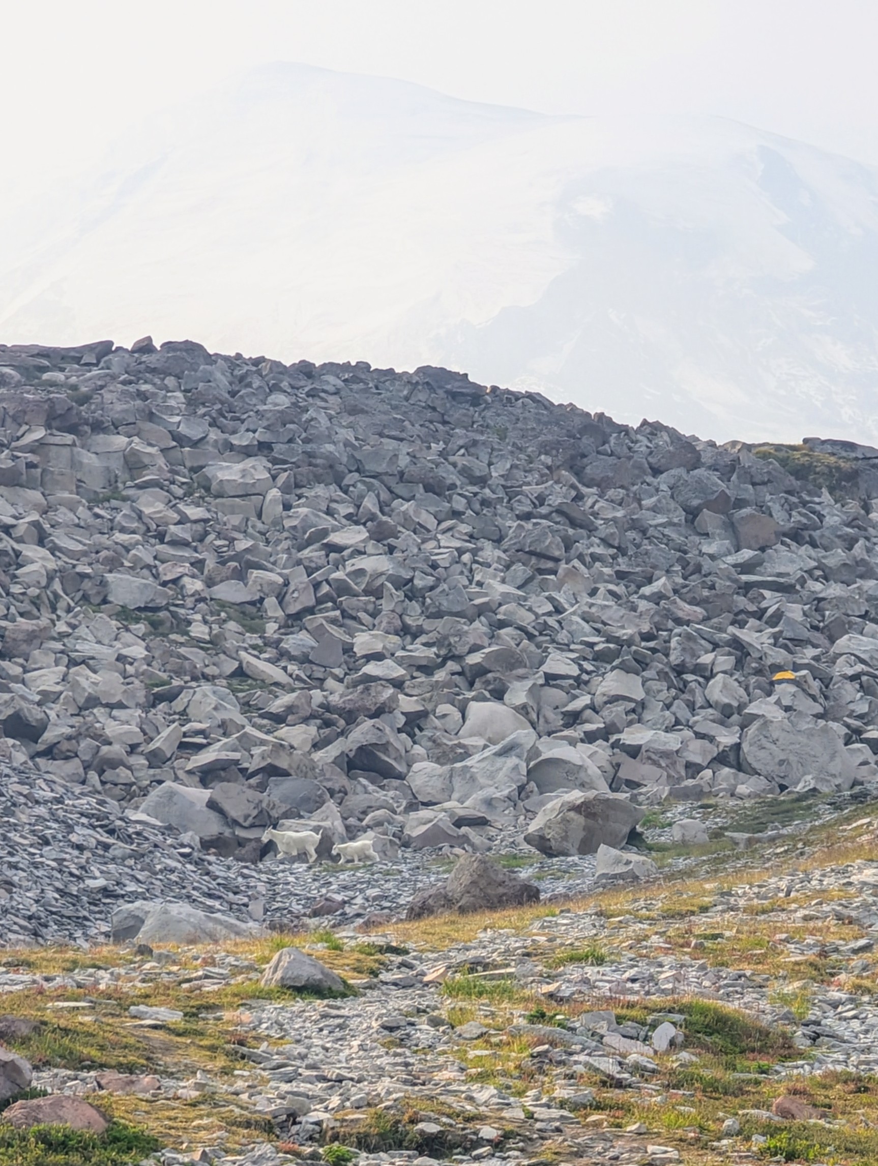 The Mountain Goats ascend out of view but I wait several minutes to see if they will continue across the horizon. The few mosquitoes keep buzzing me as a ladybug lands on my shirt. It’s amazing how life makes it in this environment. I hear their hooves on rock as they reappear. They are moving at a quick trot, perhaps because they are aware of my presence. I now see that there is a young goat among the group too who tucks itself right in with mama. I start to record again, watching them until the very last goat passes over the ridge and out of sight. Oh what an amazing thing it would be to travel across these rocks with their ease. I stand in silence for another few minutes before pointing myself down the rocky slope.