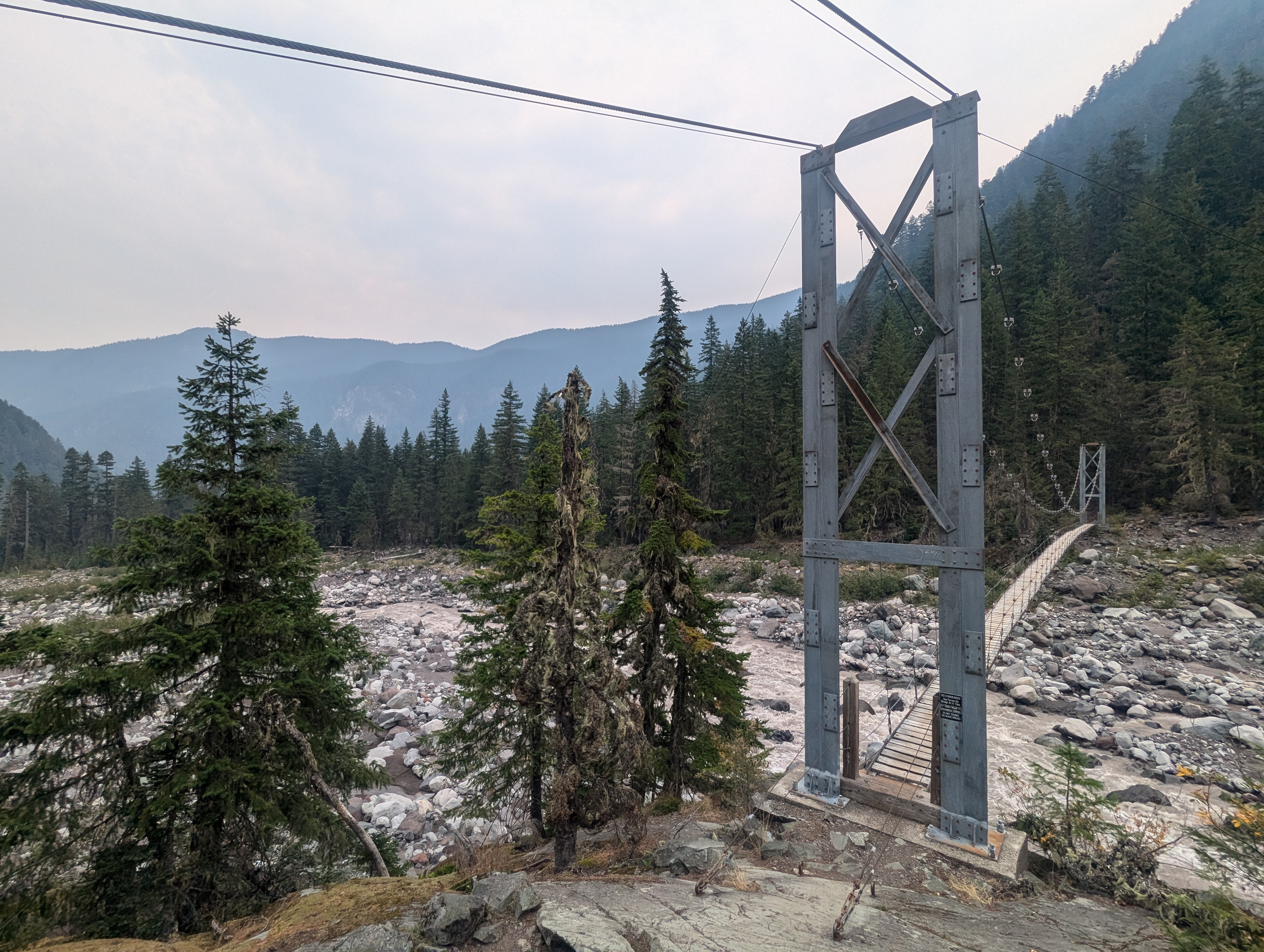 That’s over 3,100 ft. of descent by the time I reach the Carbon River Suspension Bridge. It’s about 12:15 pm and I’ve covered all of 6+ miles for the day. I start to bounce my way across when I notice a lady hike by on the other side. I stop in the middle to take a picture up and downstream of the massive Carbon River. I notice that the lady has returned to the bridge and has kinda started to step out. There are signs on either side that clearly state only one person at a time is allowed on the bridge. As I approach the end of the bridge, the lady is still parked at the entryway. I say “excuse me” as I nearly hit her with my backpack when I squeeze by.