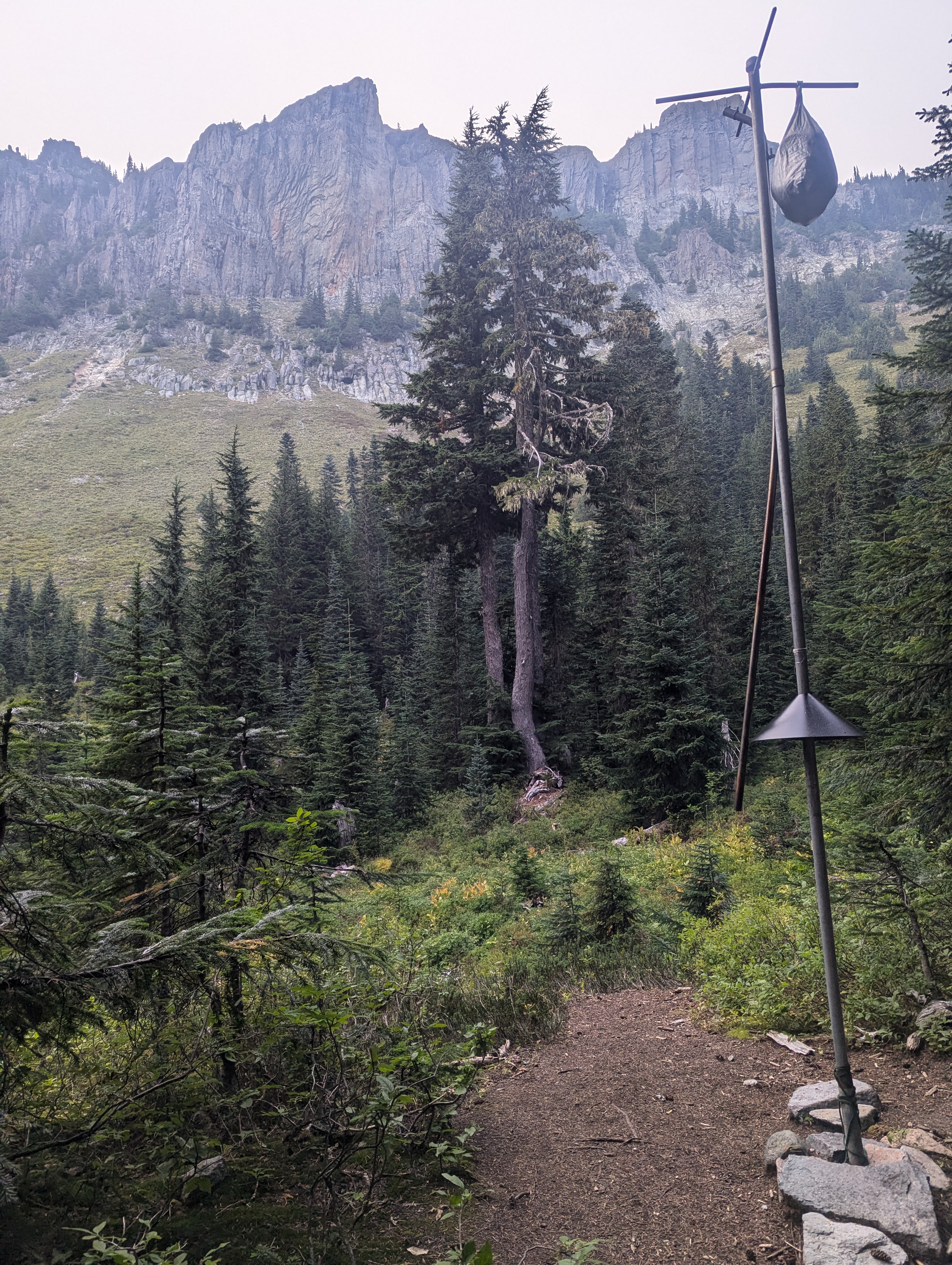 The Yellowstone Cliffs tower above me and they are almost hard to see against the hazy sky. For some reason, I keep scanning the large talus piles for movement. Just before 5pm, I take a right onto the trail to Yellowstone Cliffs Camp. It feels like it goes on and on. After probably only a tenth of a mile, I cross a log bridge into camp. There are two campsites and no one is there but me and the deer greeting party. I first take spot #2 but change my mind and move to #1. Better to have clear skies than to be tucked under the trees. Plus, spot #1 is a bit quieter since it’s farther from the din of the Spukwush Creek. And who wouldn’t want a front row view of the cliffs?