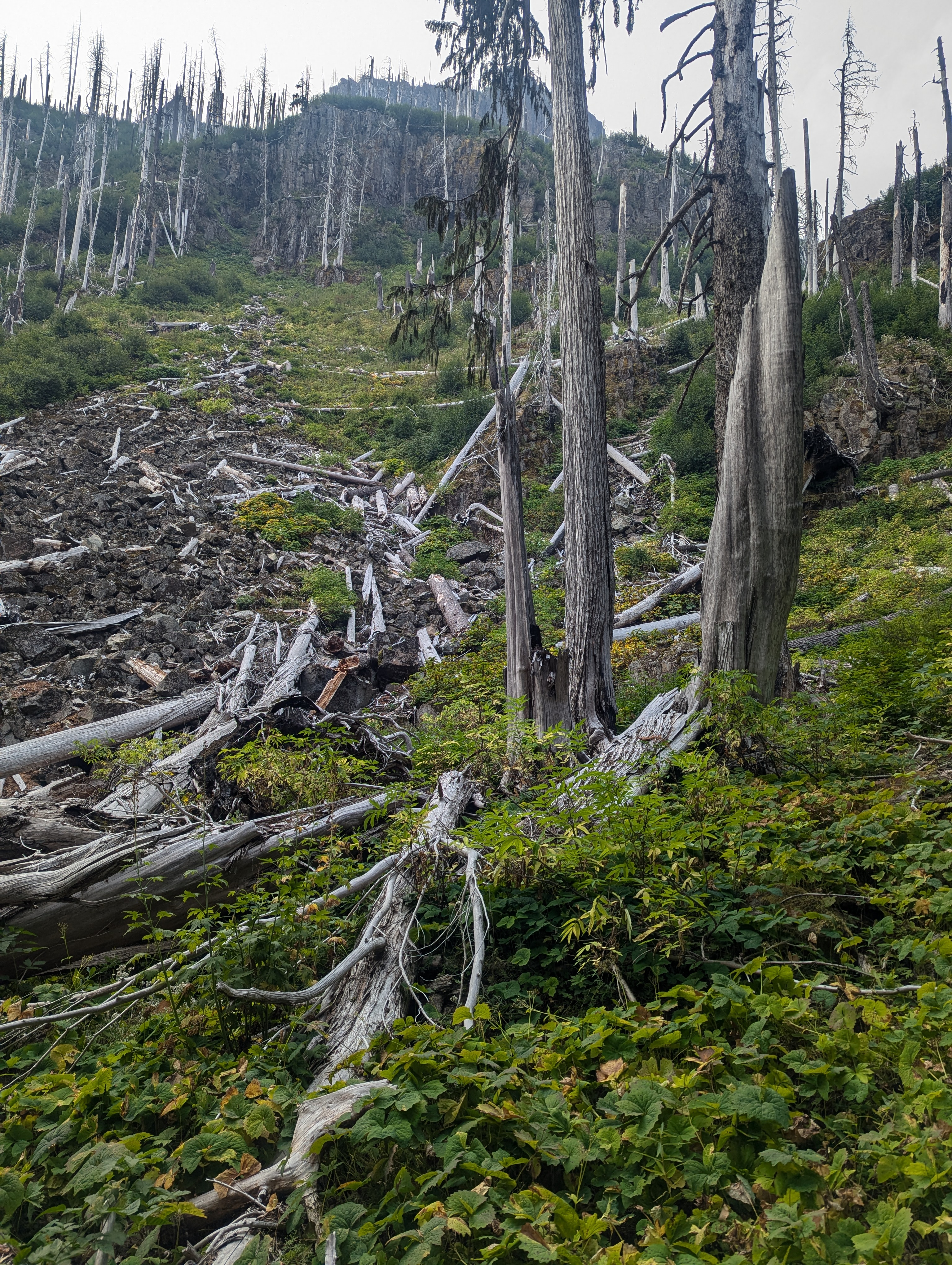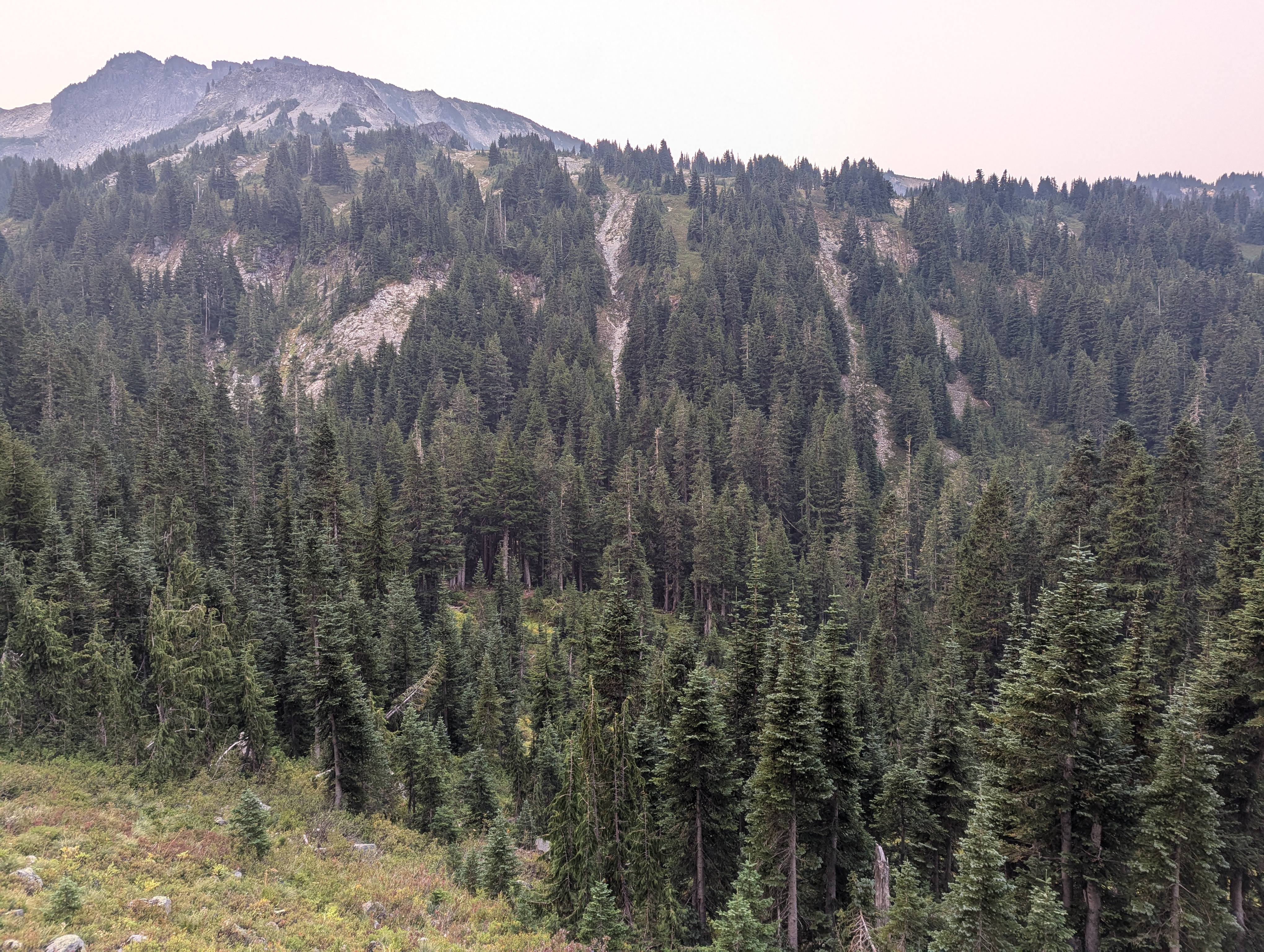 The trail tread is pleasant as I follow the gradual gradient up river. Just before the switchbacks start, I stop for second breakfast. I shovel in an energy bar, finish off my chocolate coffee and suck down some electrolyte water. The squirrels are busy with their winter preparations dropping cones from the trees. But one stops long enough to pose and give me a quick hello. The gradient of the switchbacks is favorable and I’m able to make good time. As I pass the junction with Fire Creek Camp, the trail steepens and I’m forced to slow my pace. I climb for almost two more miles and I’m grateful to see the light coming through the trees. After about 2,500 ft. of climbing, I finally pop out of the forest at what should be a spectacular view of Tahoma and the White River. But she is virtually hidden by all the smoke. There’s a few day hikers there on a rock taking in the non view. I say hi to them but they don’t respond.