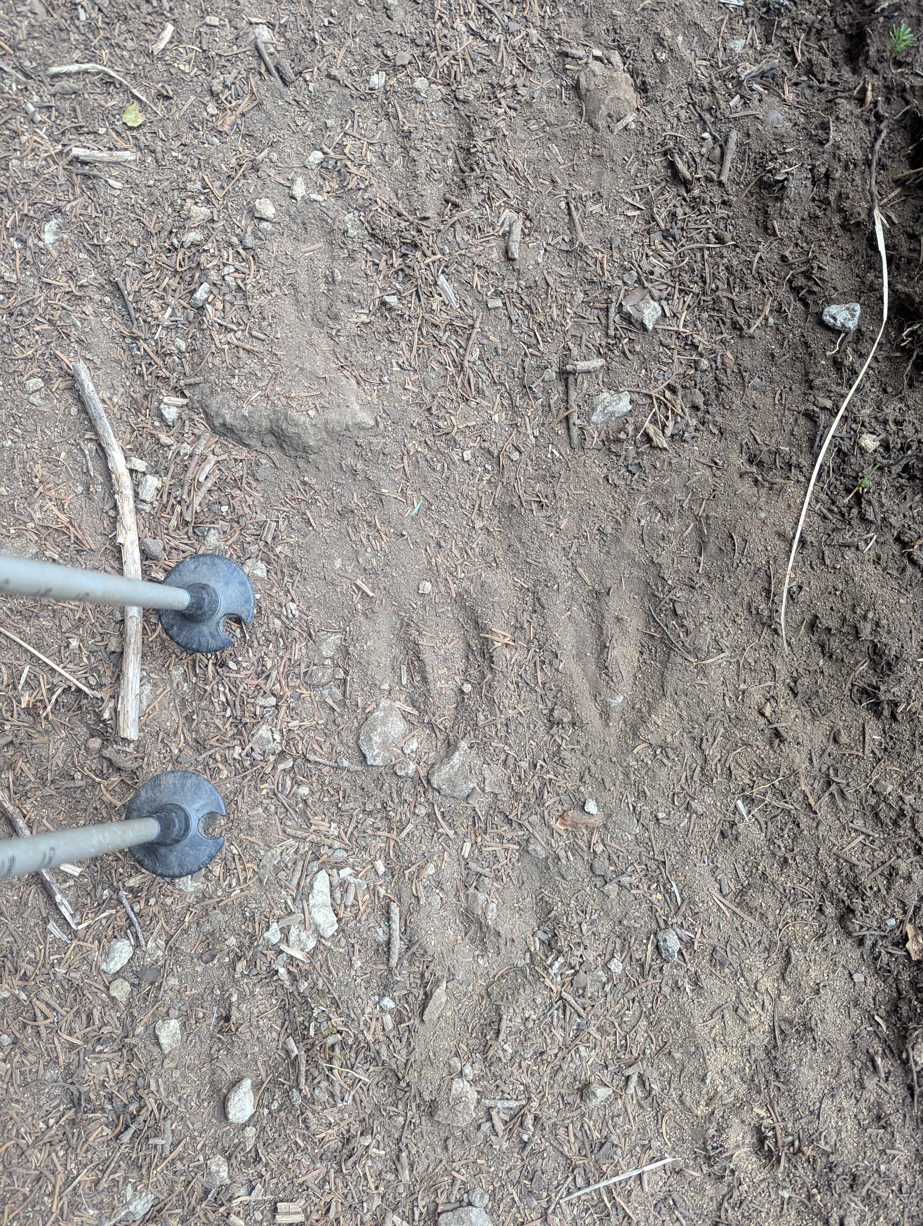 After I fall asleep I awake to a rustling at my backpack which is just outside my tent door. I always place things in a specific way just outside my tent door. I’ve got my trekking poles ready to use as defense with the straps closest to me. The pole straps get saturated with sweat and I don’t want any mice or deer eating them for the salt. Then I have my umbrella right next to my poles, also ready for defense. I have any full water bottles lying there. And finally, my shoes with my backpack over the top of everything.