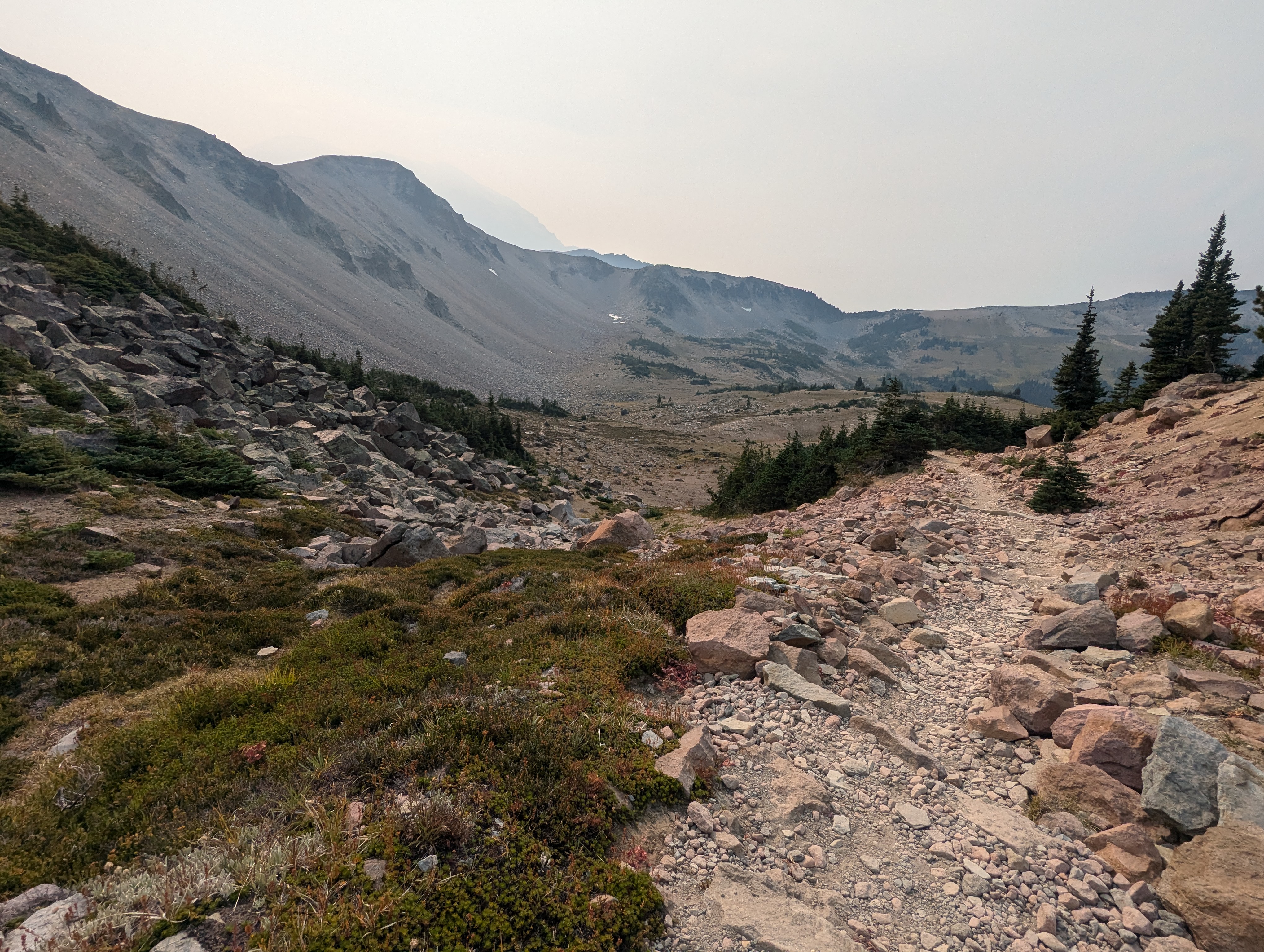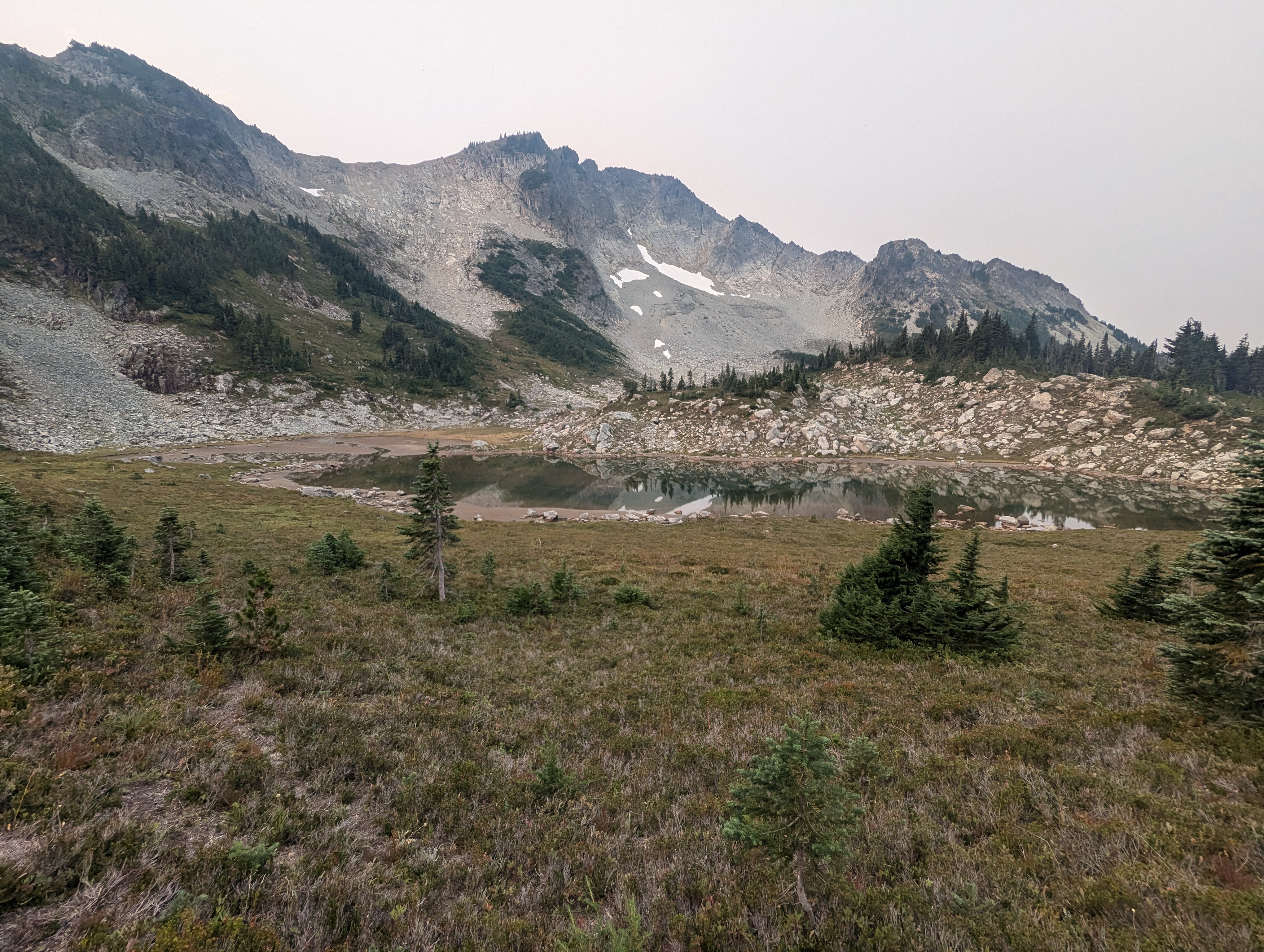 I climb briefly through the forest before topping out just before Windy Gap. I haven’t forgotten how yesterdays father son team told me about all the bears around Windy Gap. I hike along the alpine ridge and past small lakes calling out my usual “Hey bear, it’s me Lionheart.” The smoke is thick and the early morning sun is glowing pinkish-red.