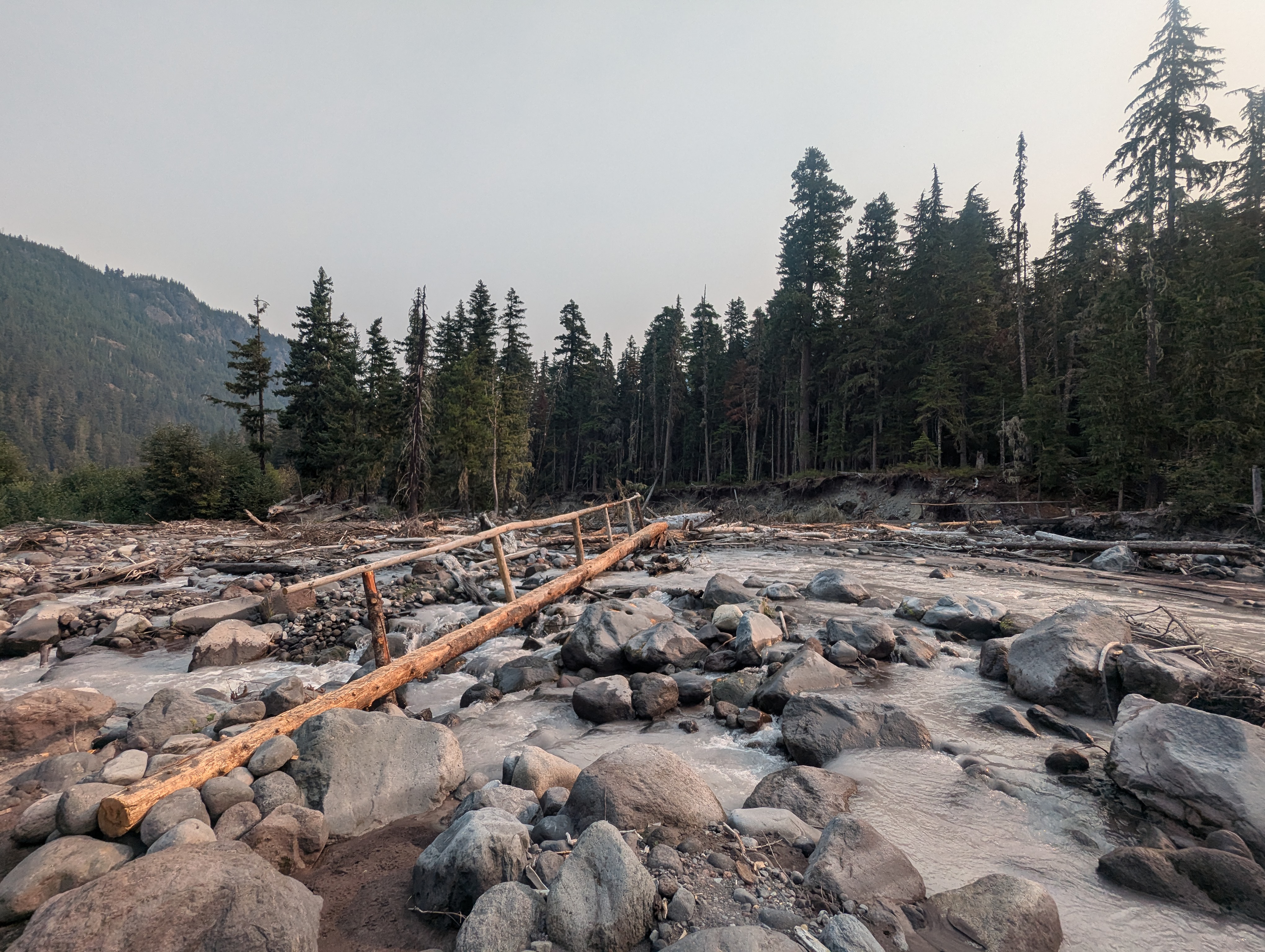 I see one long log bridge and look around to make sense of the directions given to me. I cannot figure out what that lady was trying to tell me. I take the long log and then cross some loose logs that connect to another log bridge. As I near the end of the log bridge, I can see two hikers coming my direction. I hop off the log bridge into the trees and greet them. They don’t say a word. I follow a path through the forest that just kind of ends. I think about how I was able to see them when I was on the bridge. I wouldn’t have been able to see them if this was the right path. I retrace my steps and follow another path that heads back out to the braided stream. I head upstream, now on an obvious path which again seems to just end. I look around for cairns and find an almost hidden log bridge to my left. I add a rock to a stump at my side that might assist future hikers. One more bridge and I’m back in the forest. Now having completed the whole crossing I replay what the lady told me. Still, none clue.