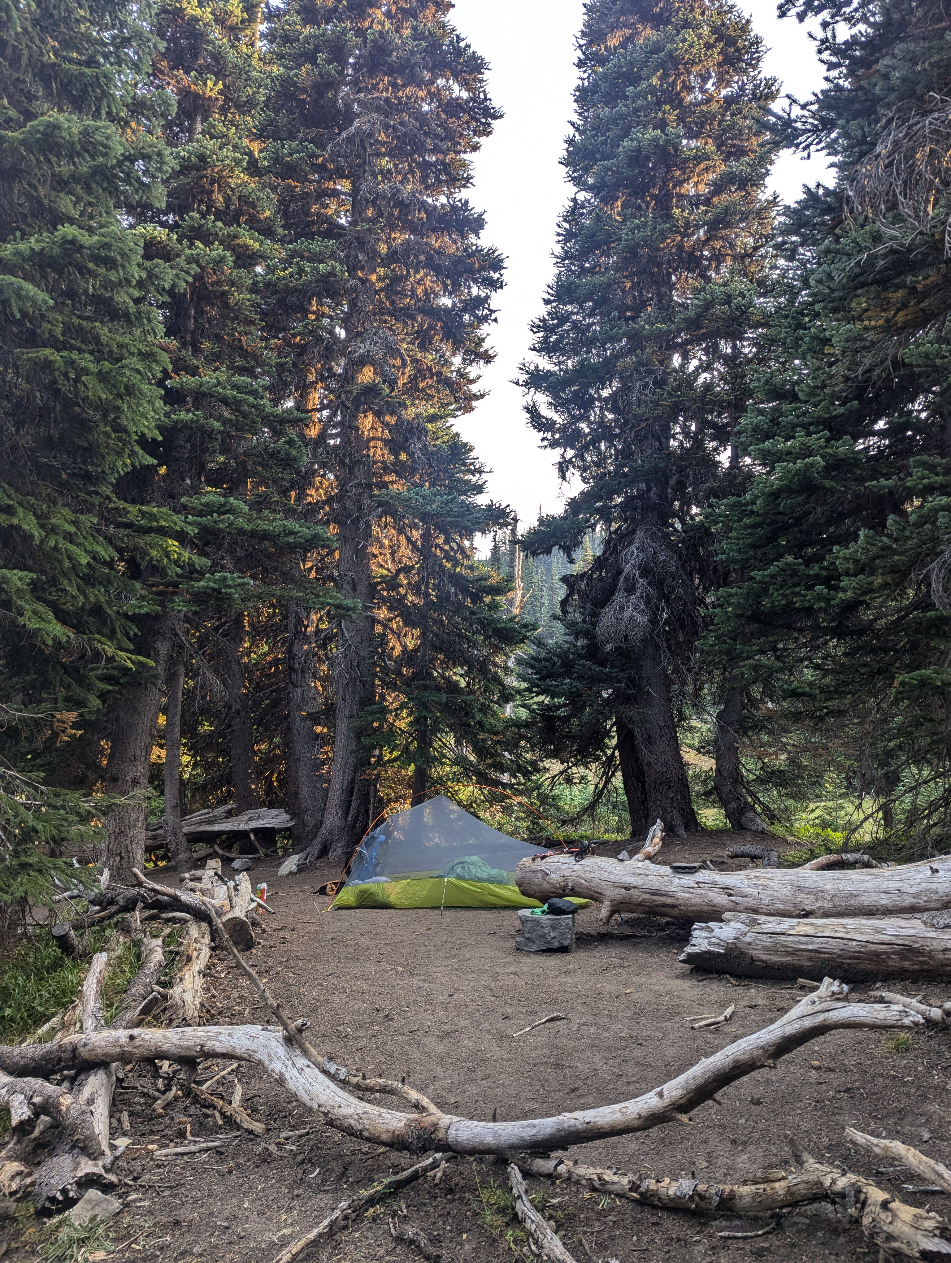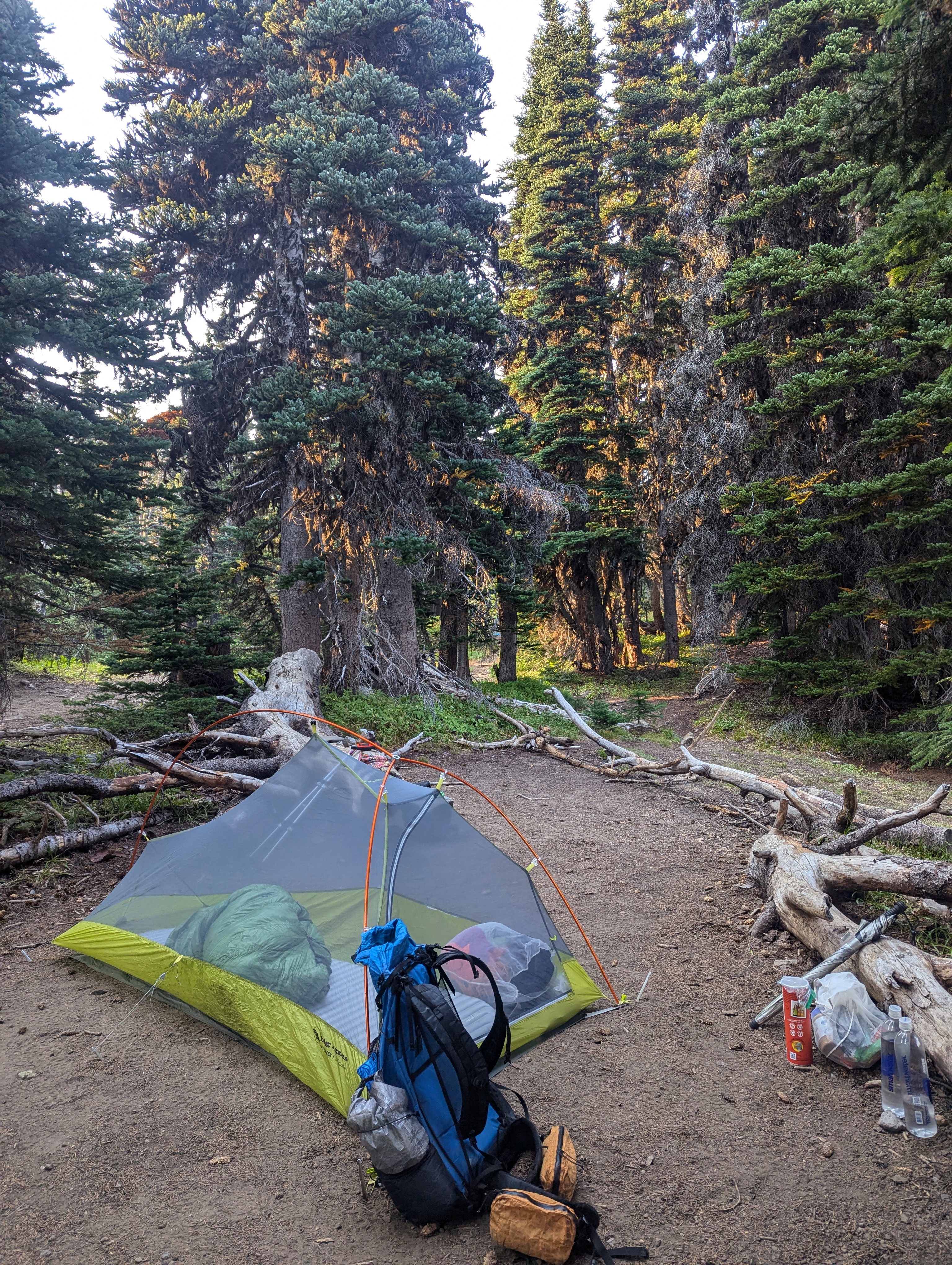 It seems as if everyone is already in camp. Spot 2/3 is still available. It takes me a while to figure out that spot 2 is like two campsites and site 3 is very tiny and tilted. I take spot 2 because it has the best seating. I’m kinda dazed from the day and fumble around my campsite. But I do get everything set up before 6 pm. Two young hikers roll in and set their packs down in site 3 without saying anything to me. After being gone for a few minutes, they return, pick up their packs and walk off. Guess they found somewhere else to camp. Works for me! Mostly, the campsites are well hidden from each other. Site 3 is empty and I can only kind of see one other camp. But several times I can hear someone using an electric pump for their air mattress. Makes me laugh because of the stark difference from last night’s Yellowstone Cliffs Camp!