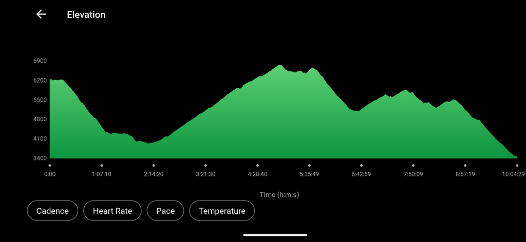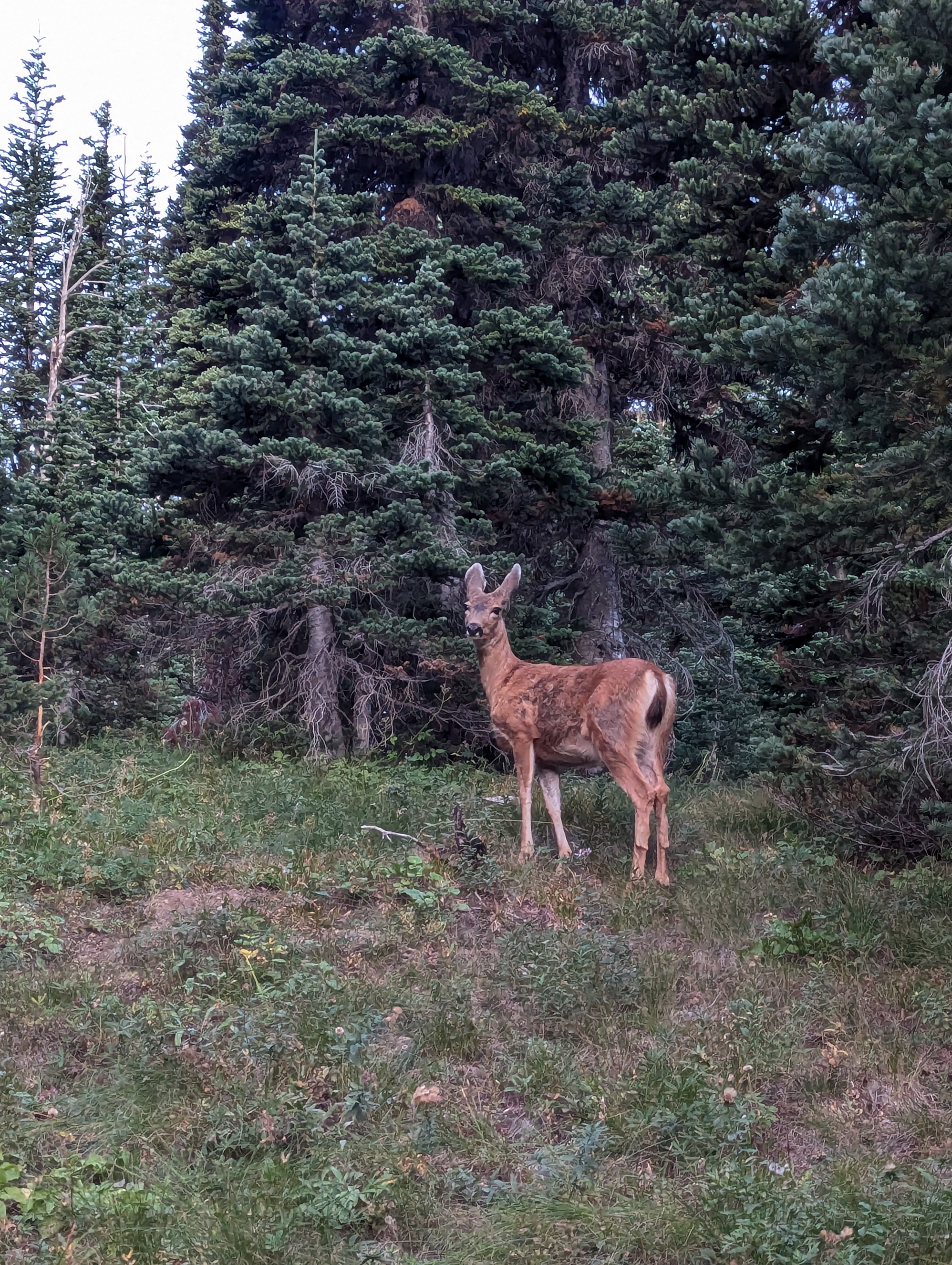 I try to send Inreach messages but the forest canopy is too thick. Dinner is a bit of a buffet and I eat my fill of chips, nuts, bars and candy orange slices. It’s dark by the time I remember that I didn’t take a picture of my campsite. My left quad is TIGHT and I stretch it out repeatedly on a giant wooden round. It doesn’t hurt but it’s tight. I’m late to bed and buzzing from the day. I indulge in a little calming music.