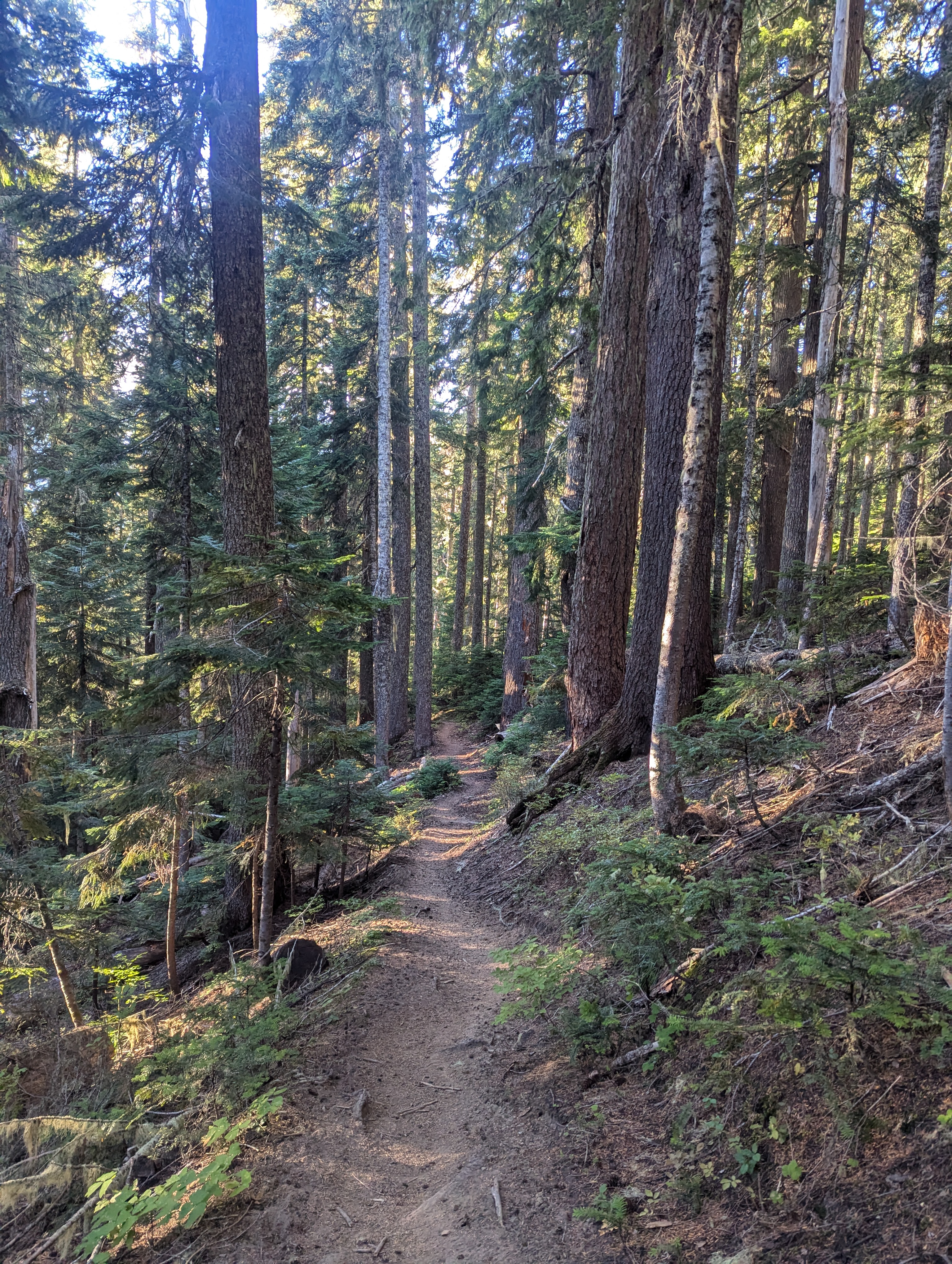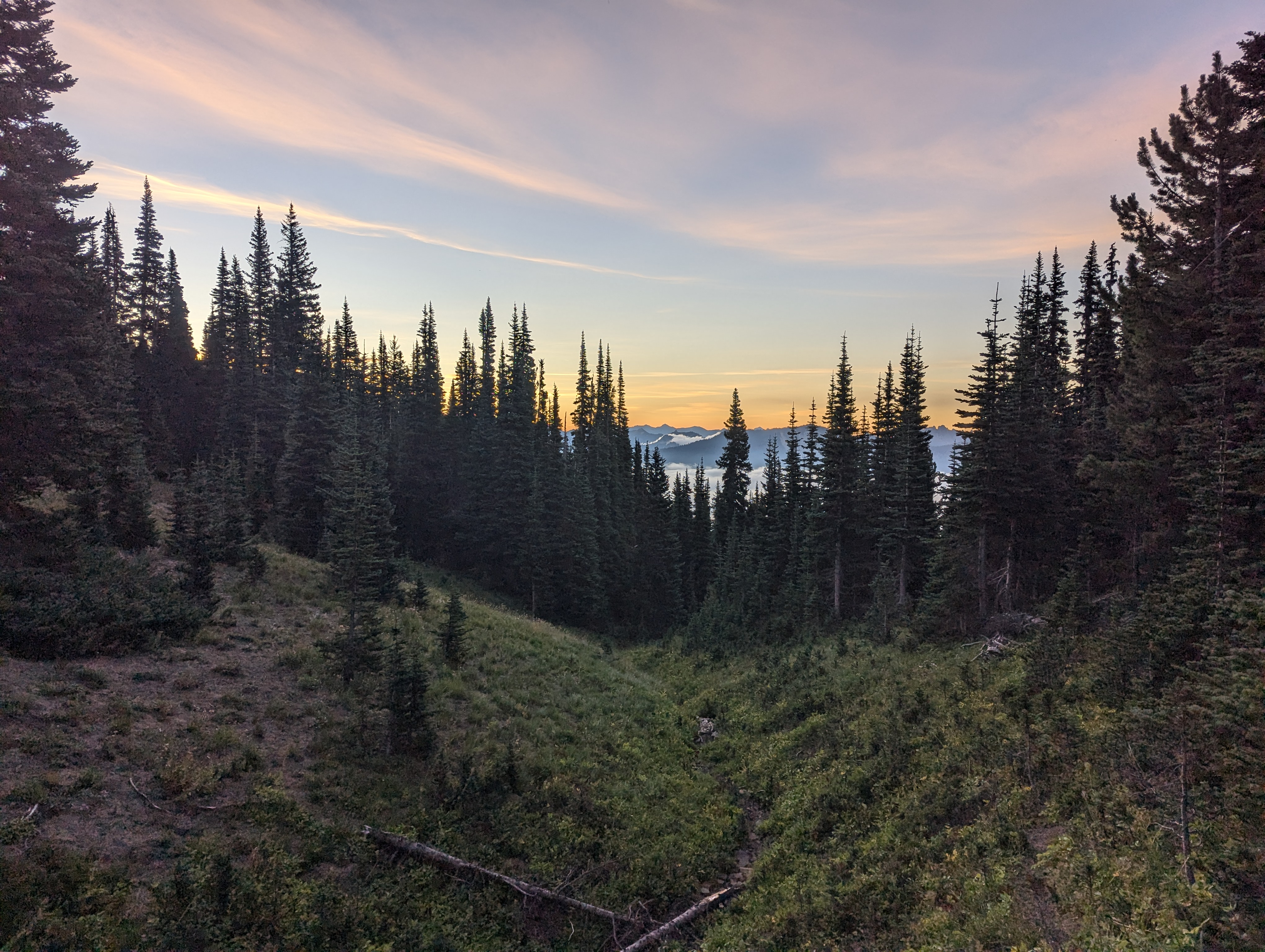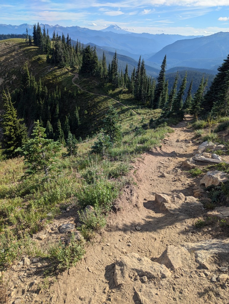 I stop for a sitting break atop a step at 4 pm. I inhale a bar and electrolyte water and I still have 5 miles to go. My energy levels are dipping and I must engage my mental strength. With my Inreach, I message my friend Erin who responds with a supportive “5 miles sounds like nothing now.” I get up, turn my back on Tahoma and trace the divide until I re-enter the forest.