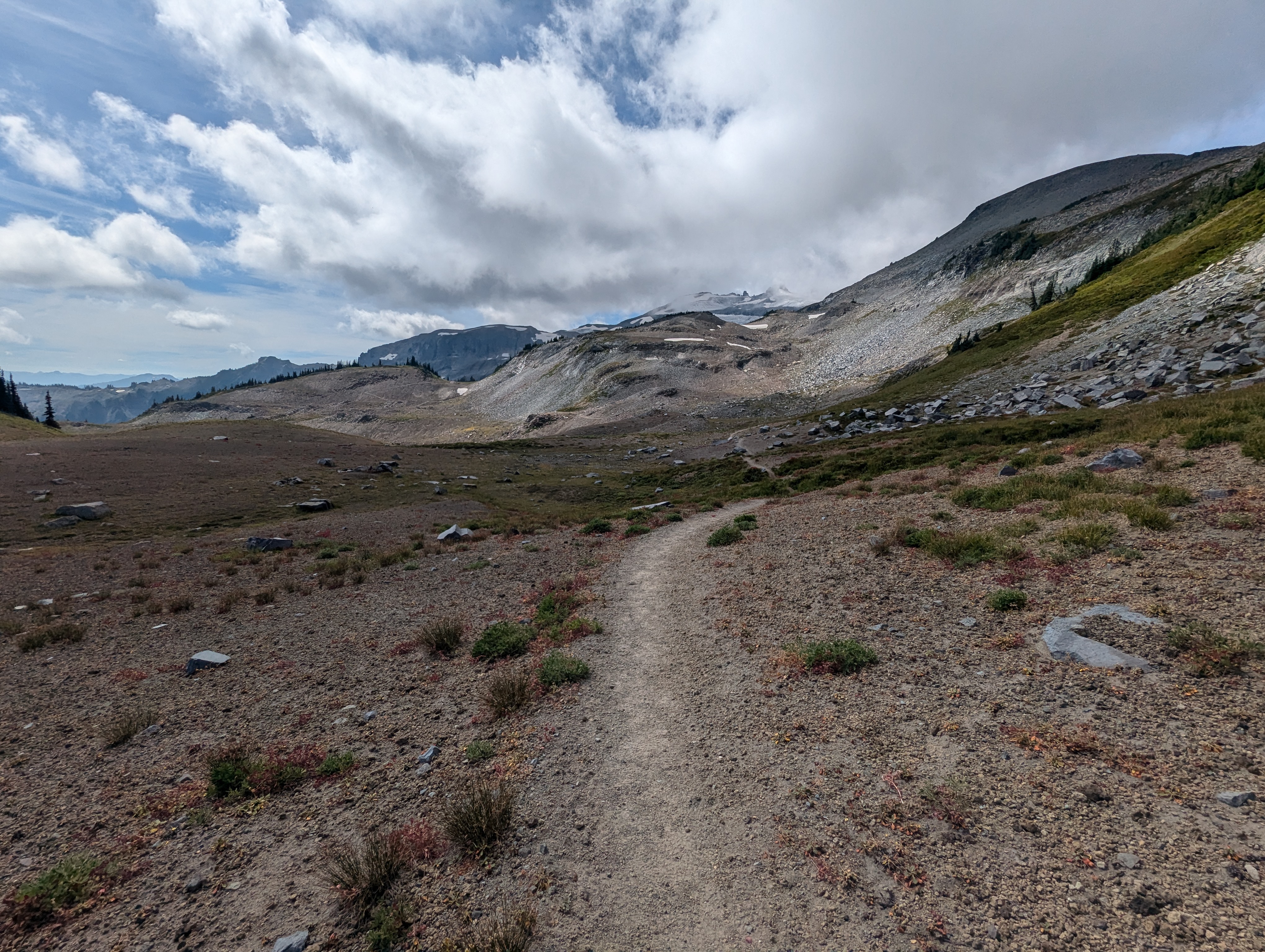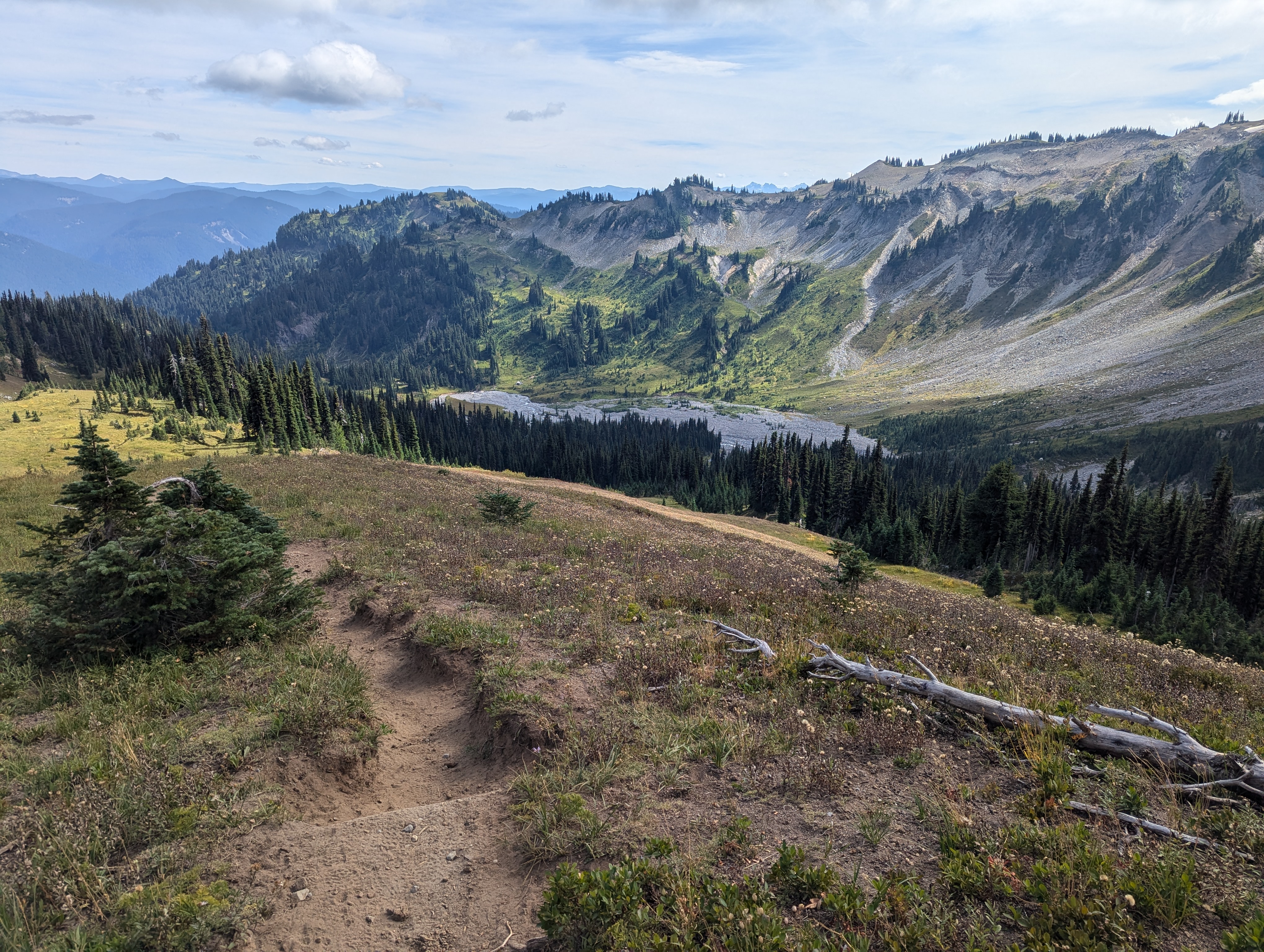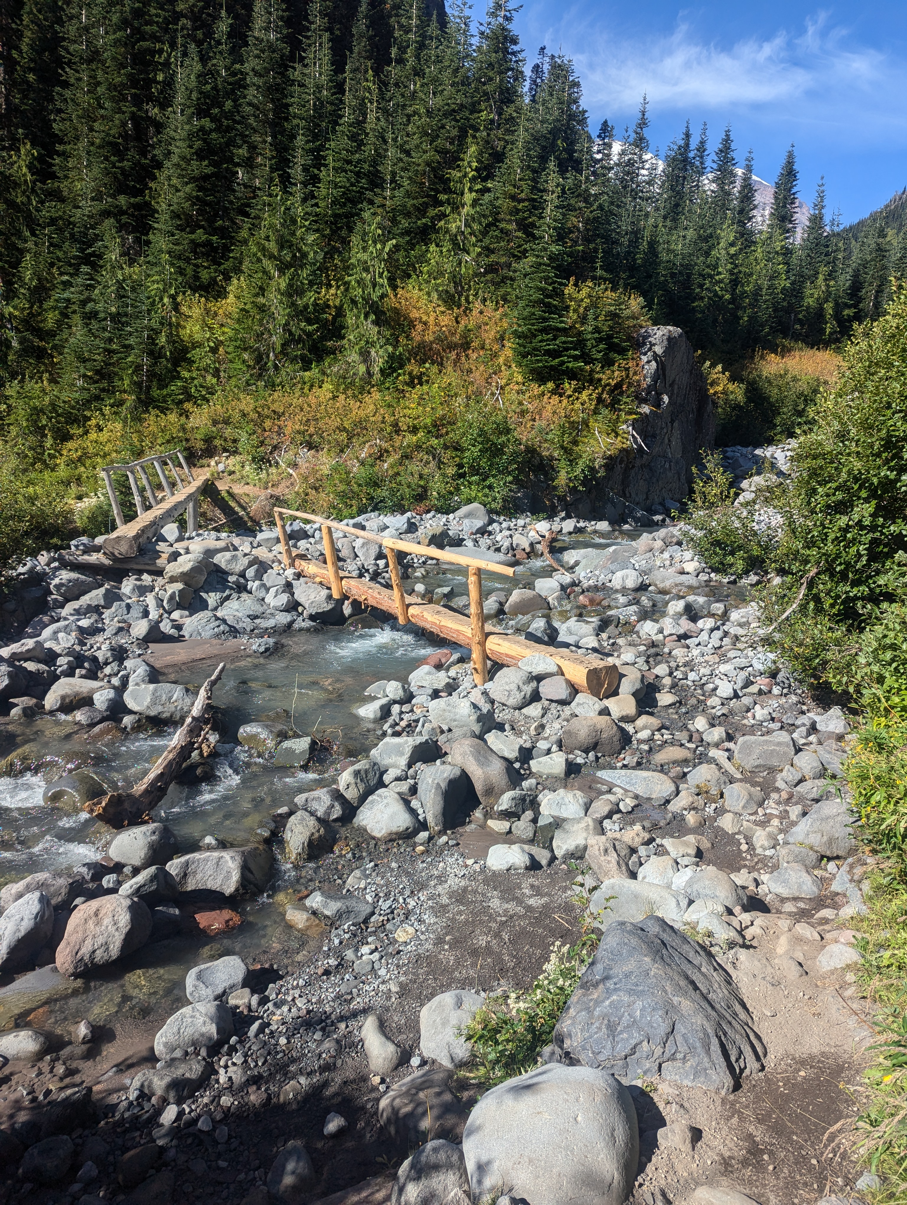 I can hear the din of the road as I speed down pristine, well-manicured trail. I follow the White River downstream until turning up Fryingpan Creek. After a short sitting break, I start to climb more steeply. A few day hikers are out and one passes me. I cross a series of log bridges before switchbacking up to Summerland.