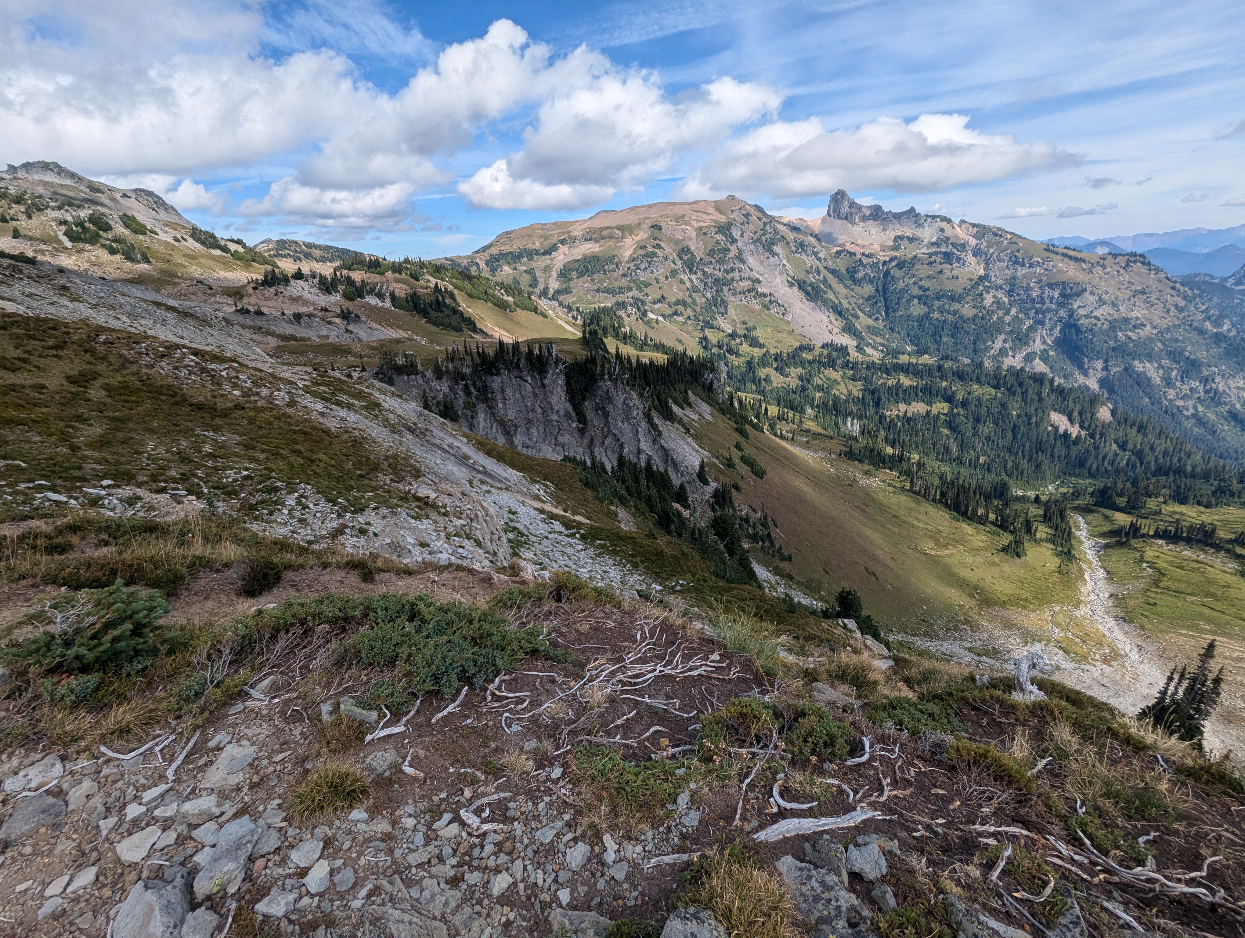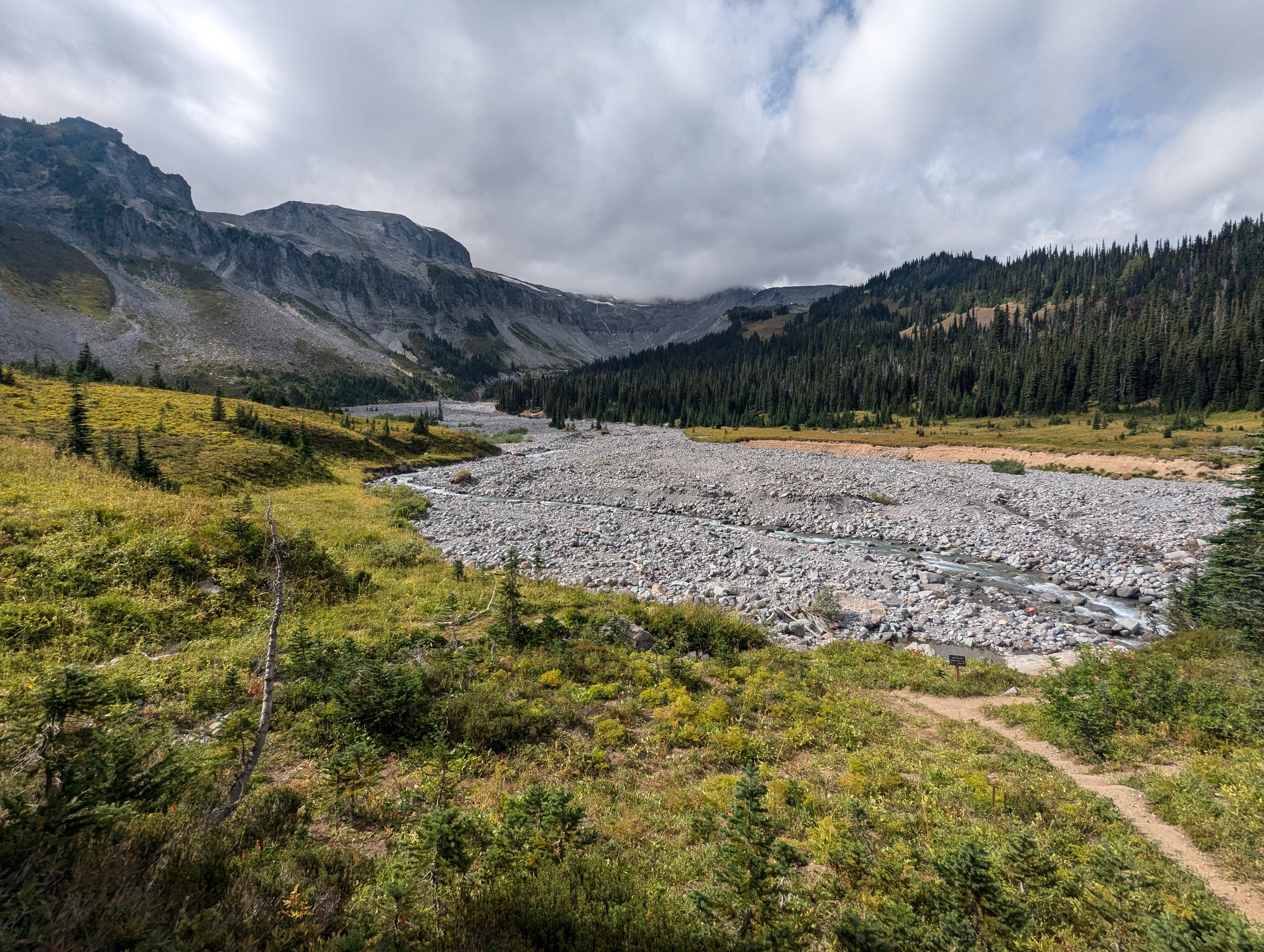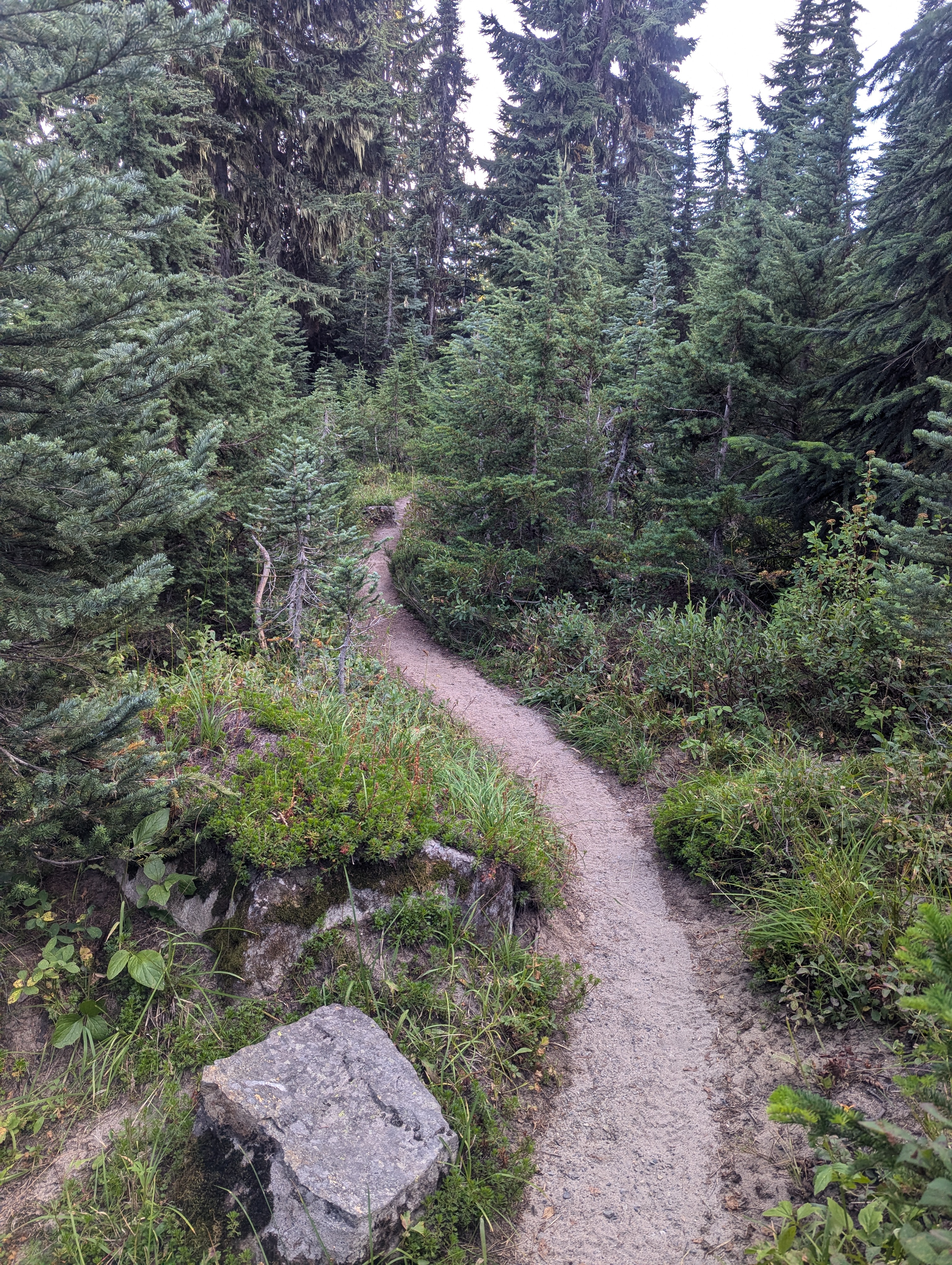 I can hear the din of the road as I speed down pristine, well-manicured trail. I follow the White River downstream until turning up Fryingpan Creek. After a short sitting break, I start to climb more steeply. A few day hikers are out and one passes me. I cross a series of log bridges before switchbacking up to Summerland.