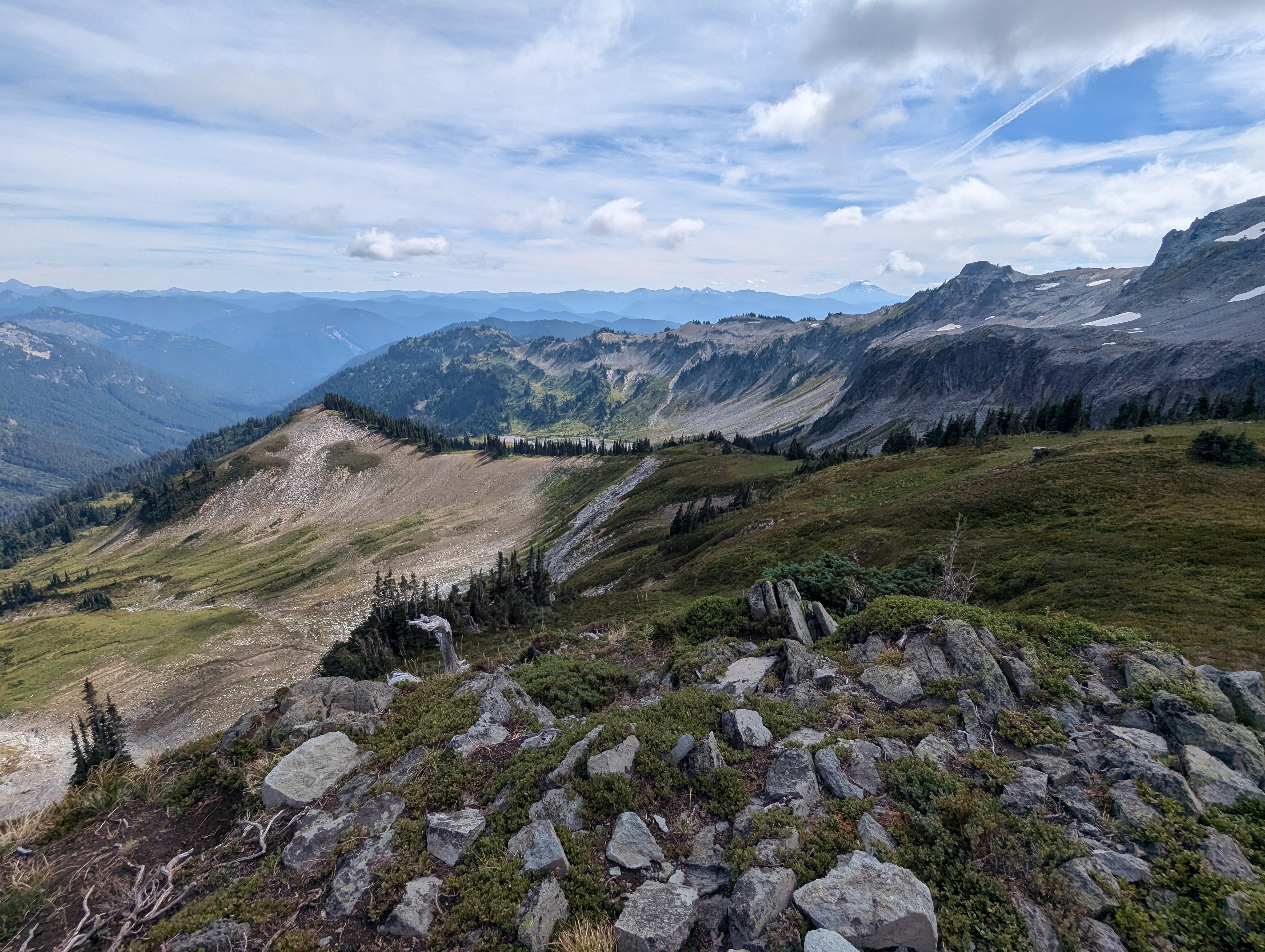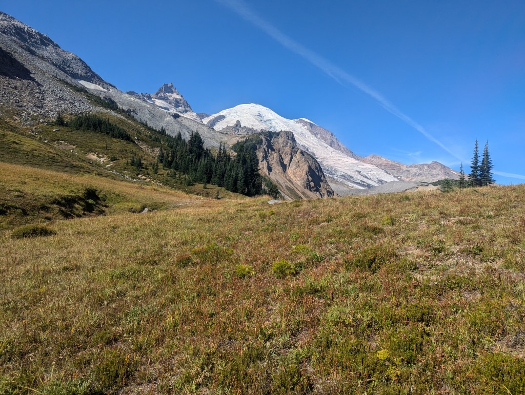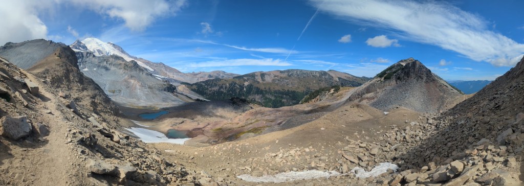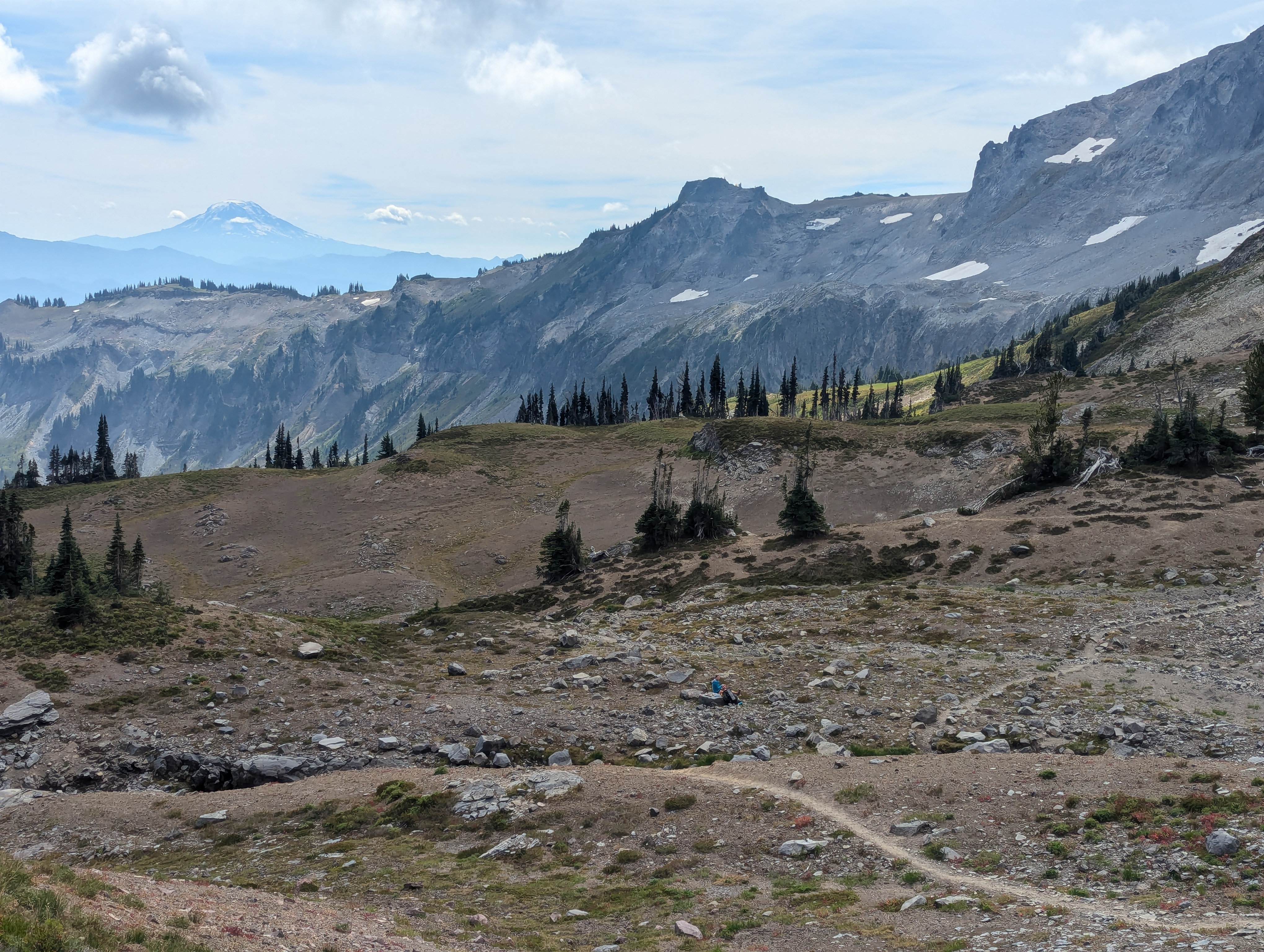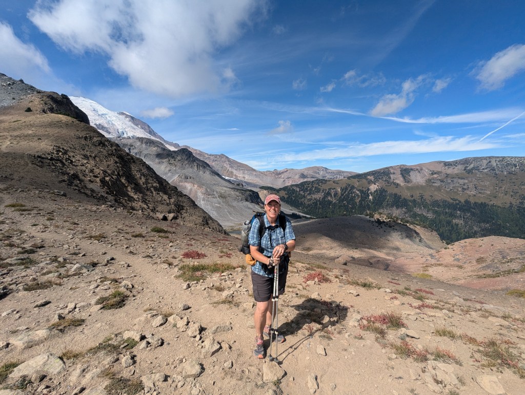 After 3,000 ft. of climbing, I top out on Wonderland Trail’s high point, 6,800 ft. Panhandle Gap. A friendly day hiker offers to take my picture. It’s so clear that Mt. Adams and Mt. Hood are visible to the South.