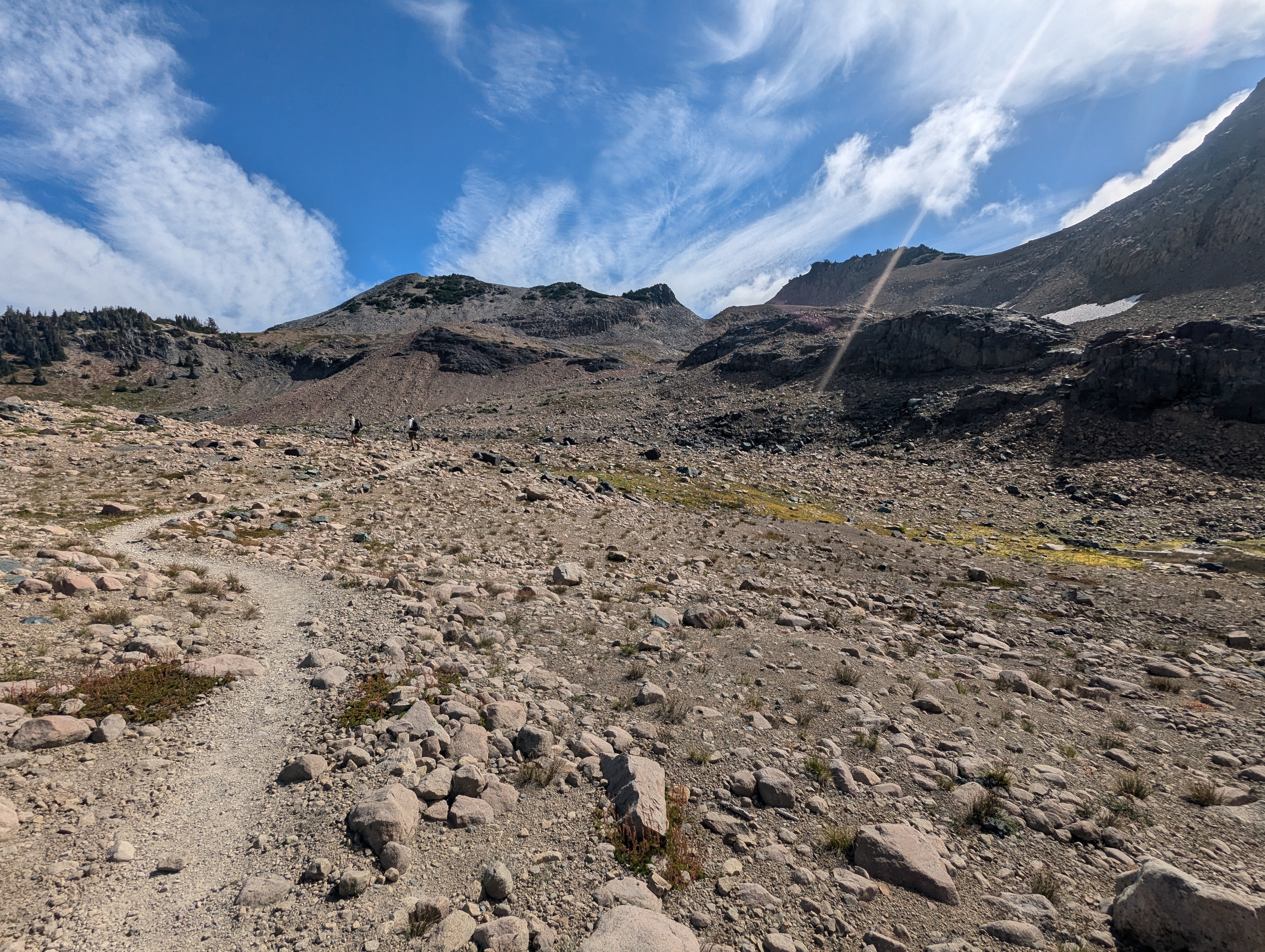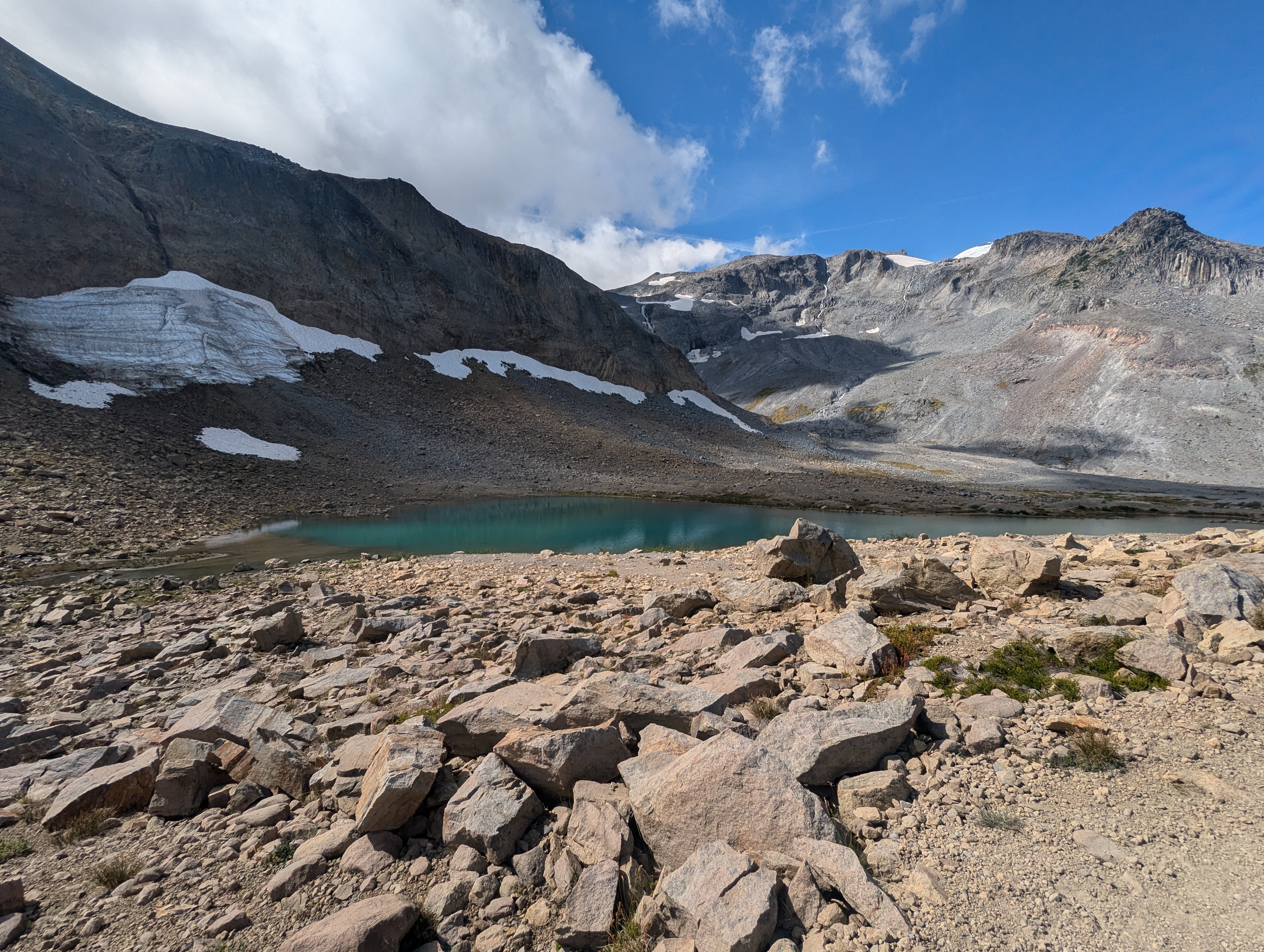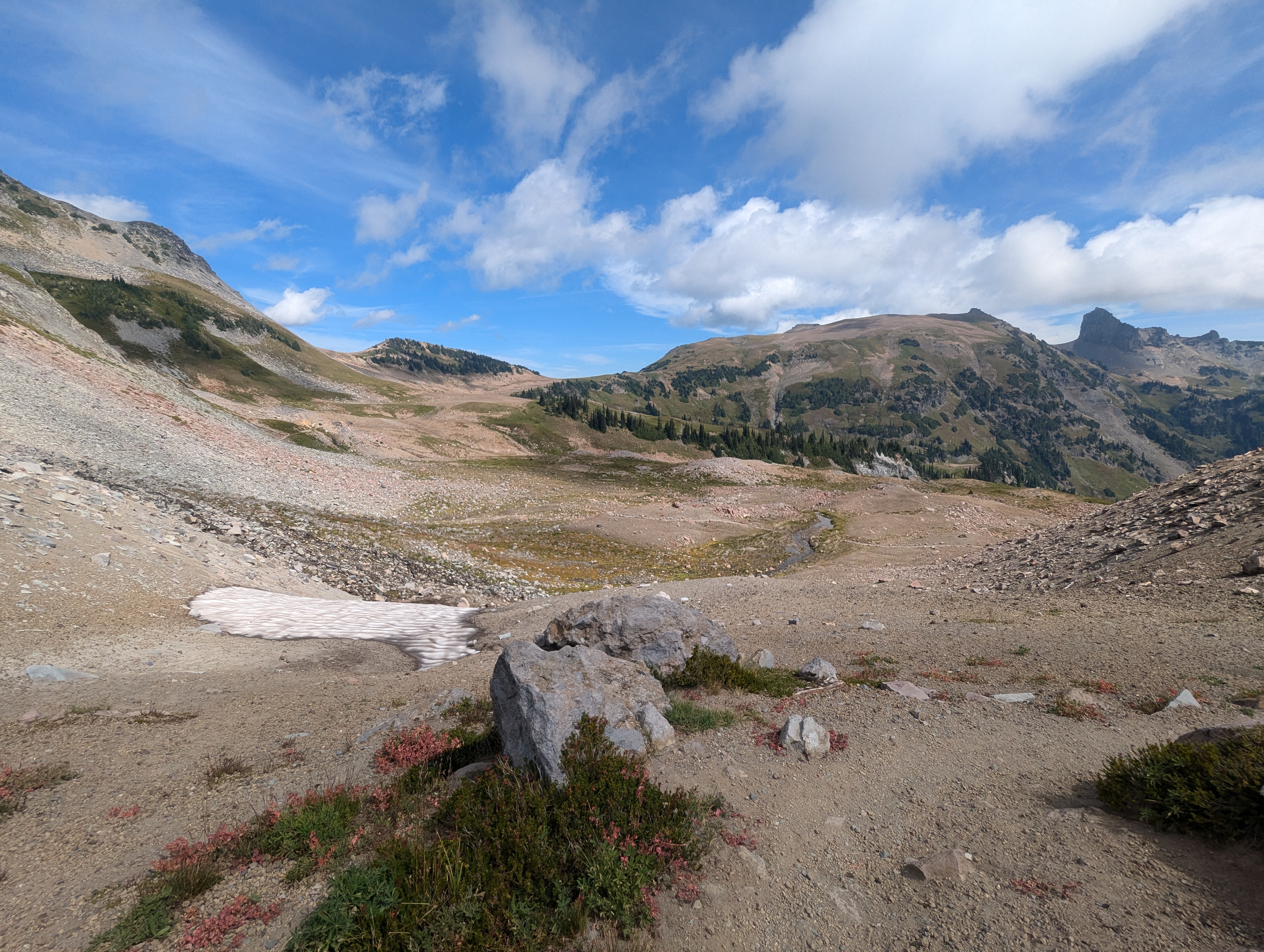 I start the climb towards Panhandle Gap past Meany Crest and no name glacial lakes. The trail winds through the rocks making me unsure of which gap I will actually crest. In true trail suspense, once I reach the wall in front of me, I turn to the right and climb some more.