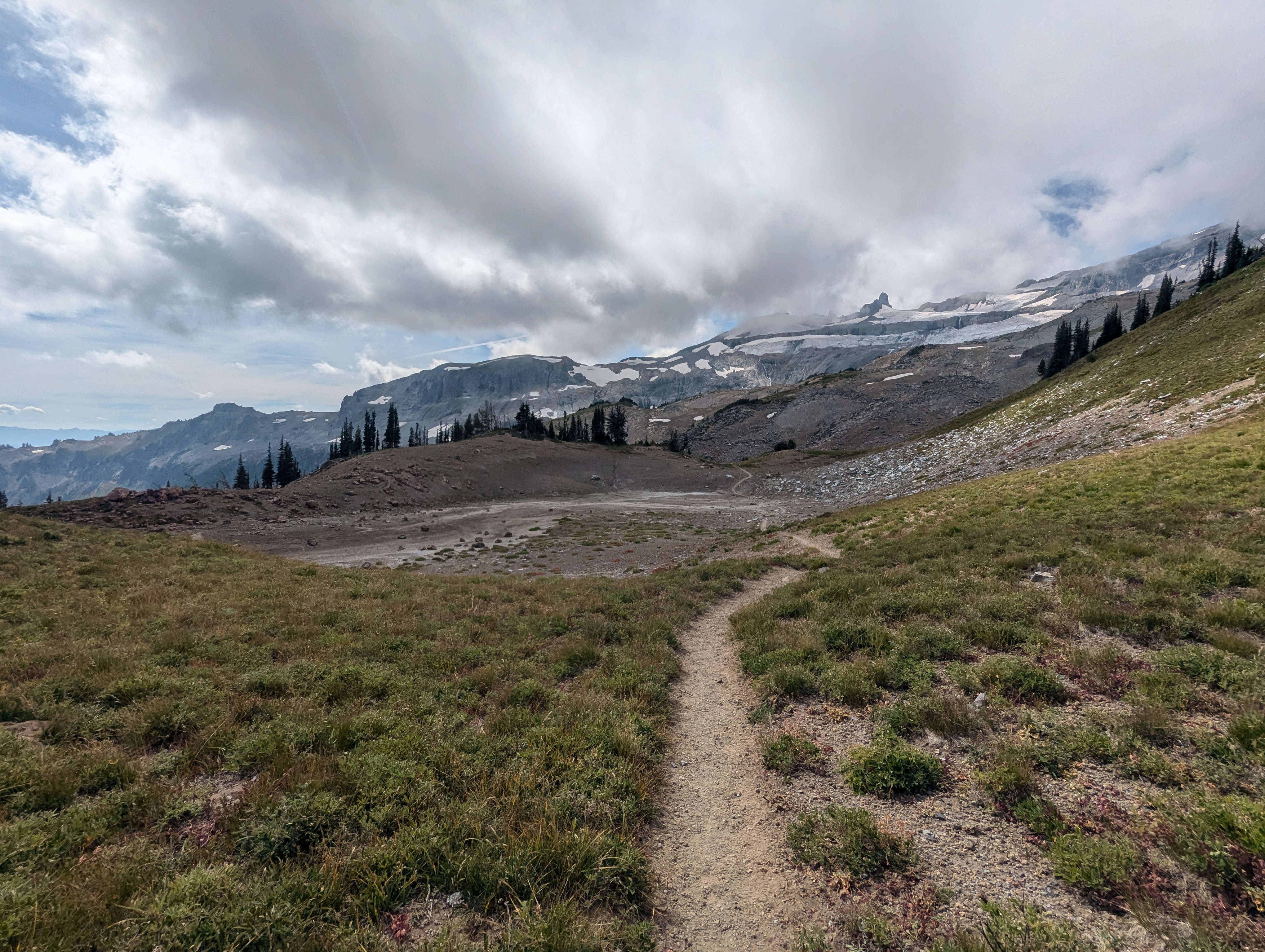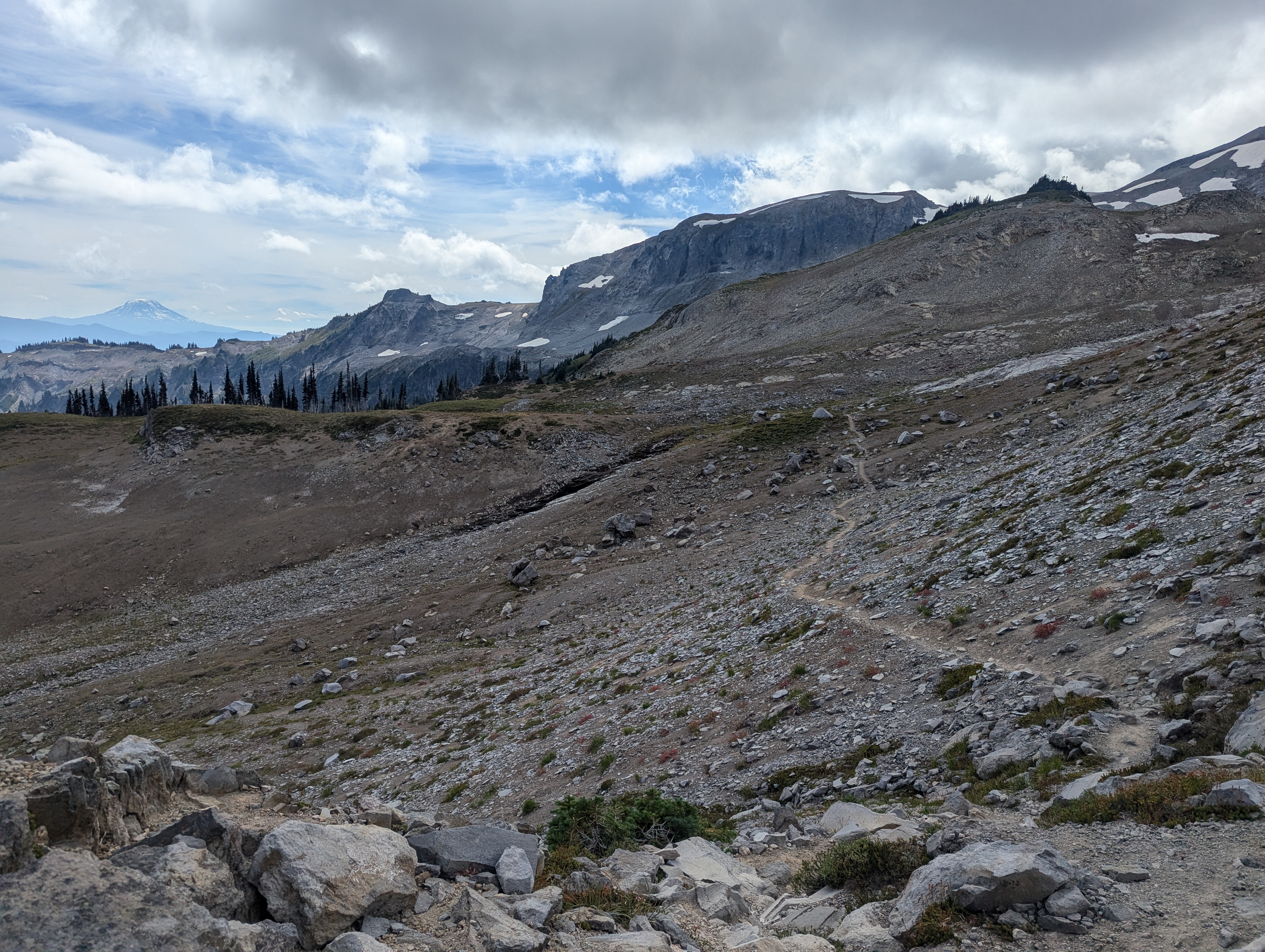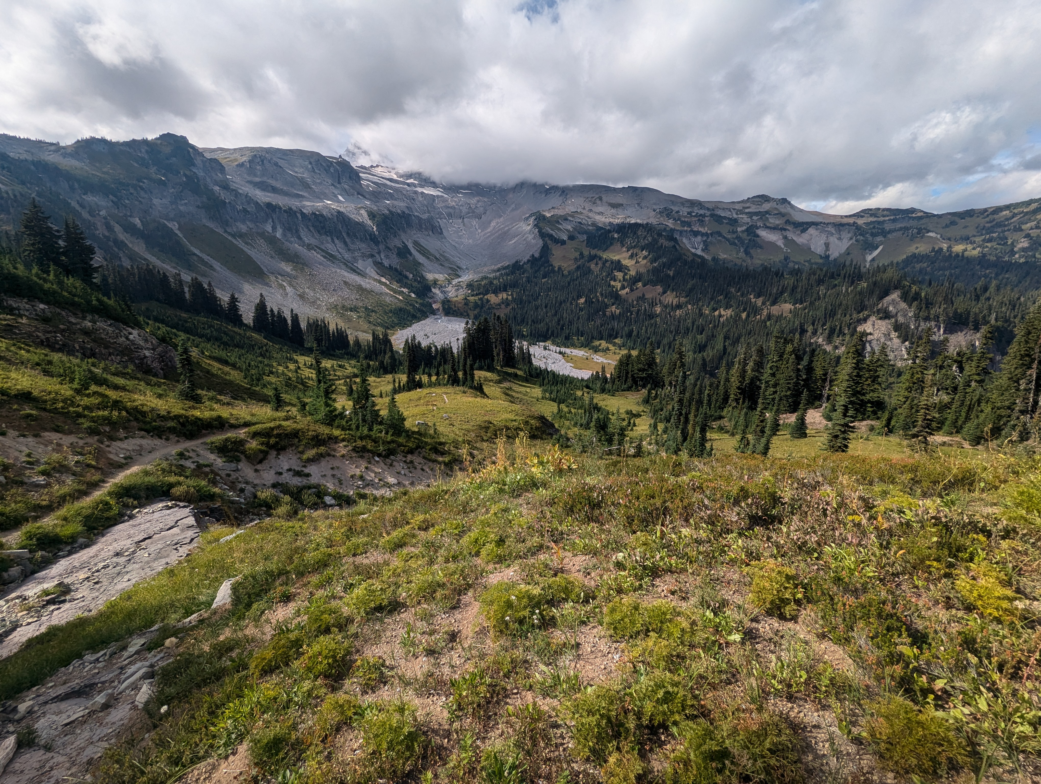 I climb over 1,000 ft. out of Indian Bar and although my left quad hurts, I can climb without too much trouble. Other than being weary I am ok. Tahoma is moody and shrouded in clouds and putting on a show.