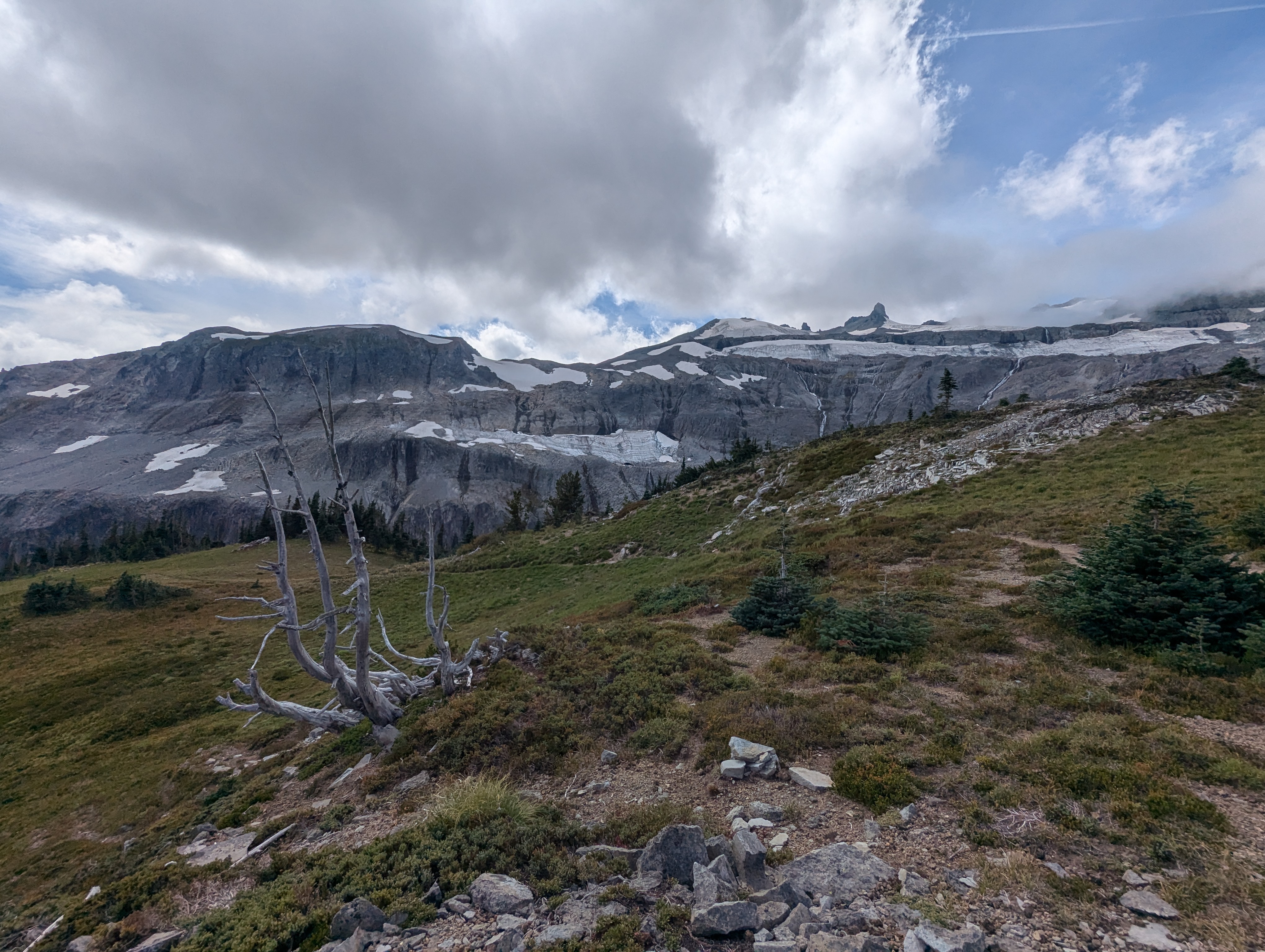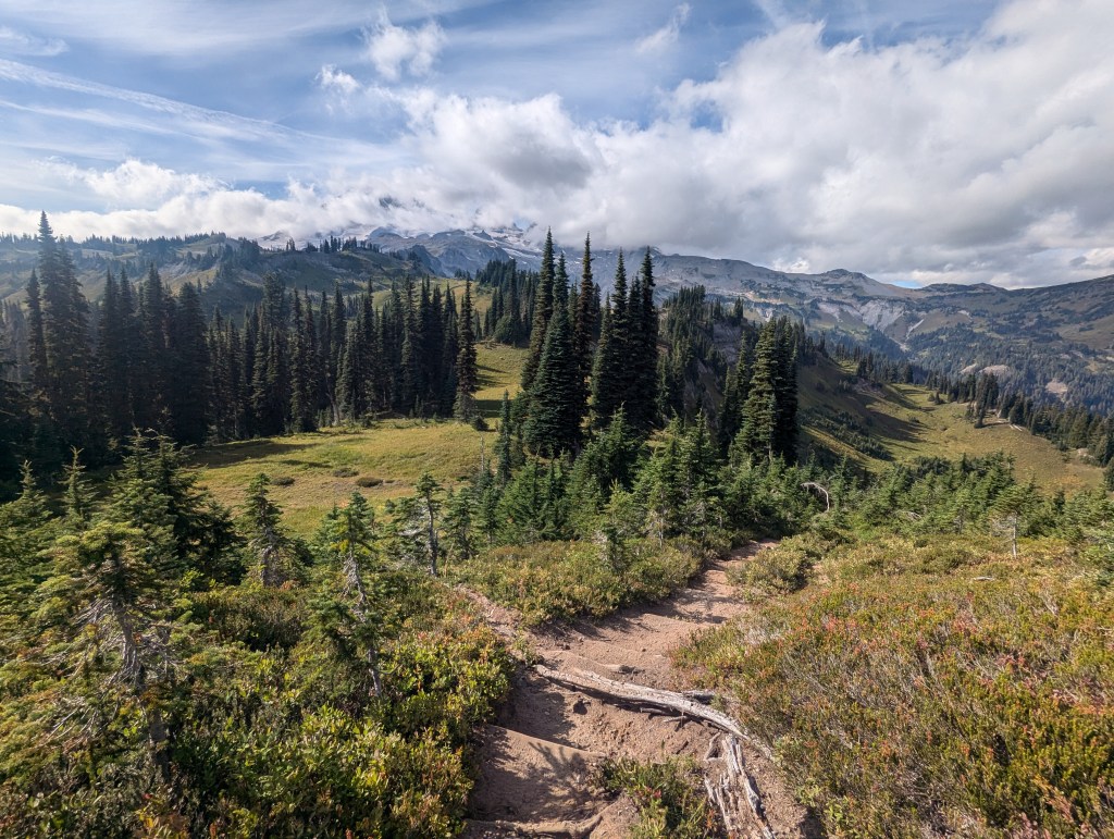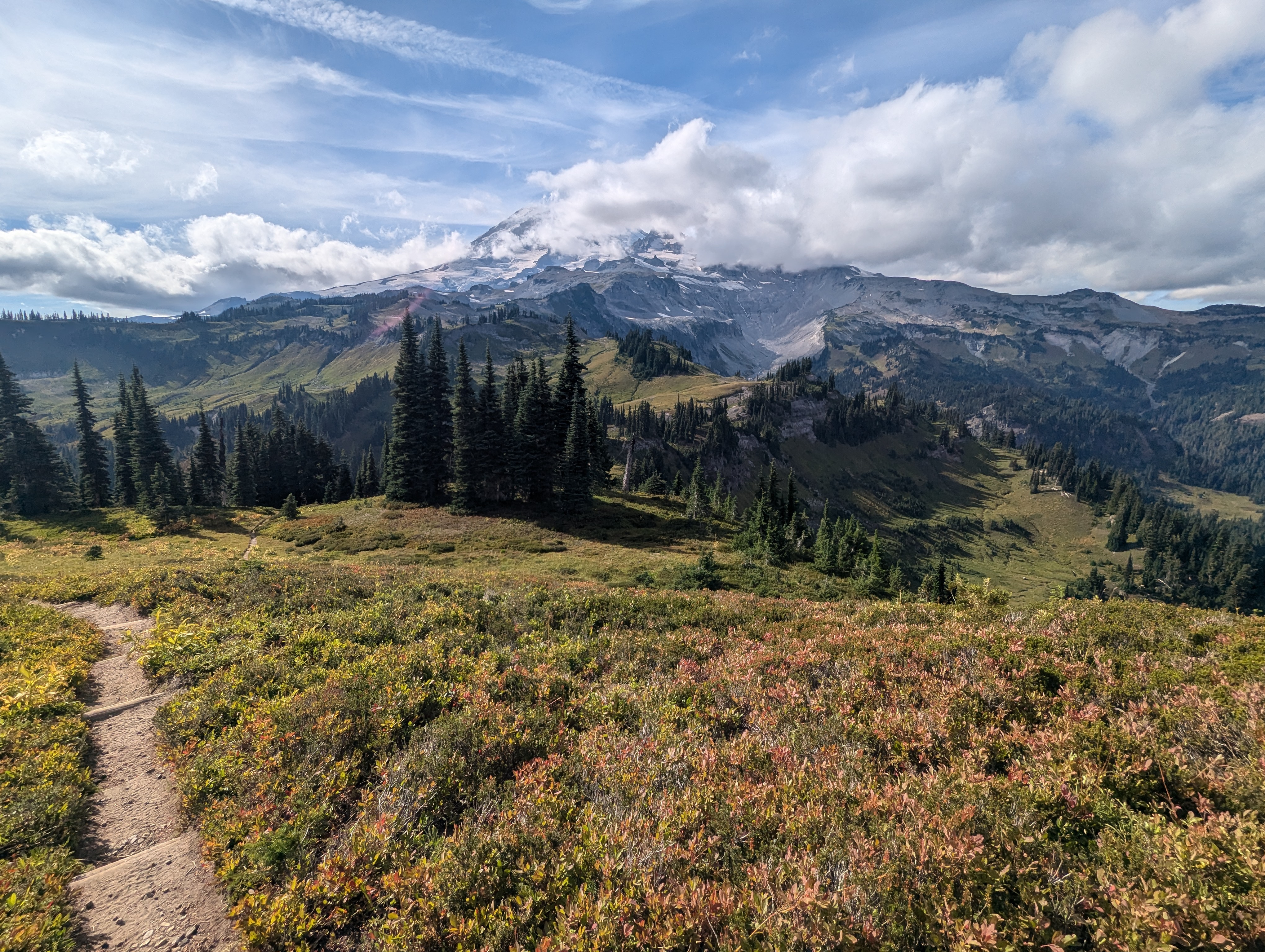 I climb over 1,000 ft. out of Indian Bar and although my left quad hurts, I can climb without too much trouble. Other than being weary I am ok. Tahoma is moody and shrouded in clouds and putting on a show.