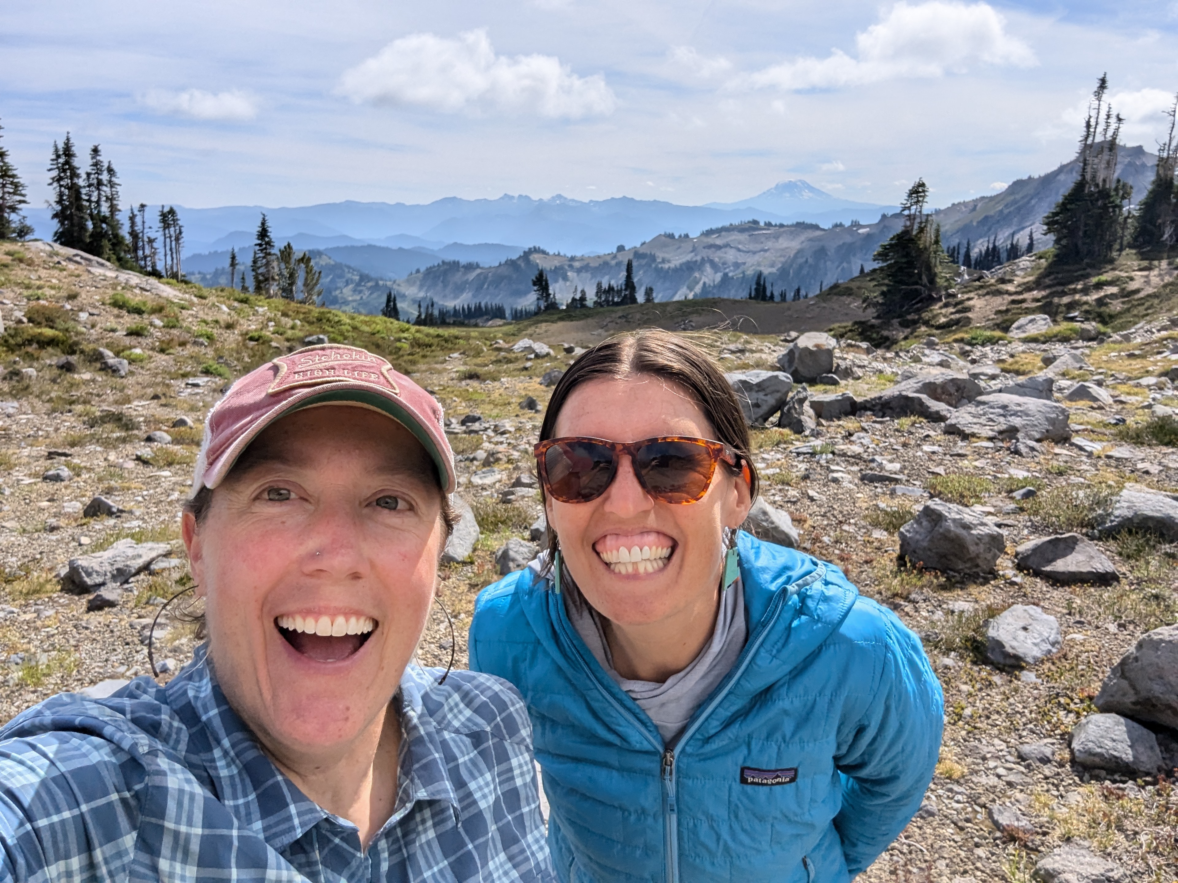 I follow a slight rise in the trail that brings me to the edge of another little descent. I pause at the top while I snap a few pictures. “Lionheart” once again rings out across the rocks. I shout “What?!” in disbelief. I yell “Ledgy” and trot down to where she is taking a break on a very ledge-like rock. (Zoom in and find Ledgy!) I thought for sure Ledge Girl would be far ahead since she started the day at White Creek. I hadn’t planned to stop already, but grab my water bottle and join her. We chat for about 40 minutes about how incredible this day is and how blessed we feel. We talk about how her shoes have no tread and I confirm that’s next level badass. I actually started this trail with new shoes and I’m so grateful. But damn, they look like they’ve hiked 400 miles already. Ledge Girl tells me that there was no food in the hiker box at White River Backpacker Camp. Thank goodness I pushed my resupply yesterday! About 1:30 pm I say I need to push on since I still have at least nine more miles to Nickel Creek. And she has to get to Olallie Lake tonight which is 1.4 miles off Wonderland. I suggest we do a selfie and we get one with Mt. Adams standing tall in the background.