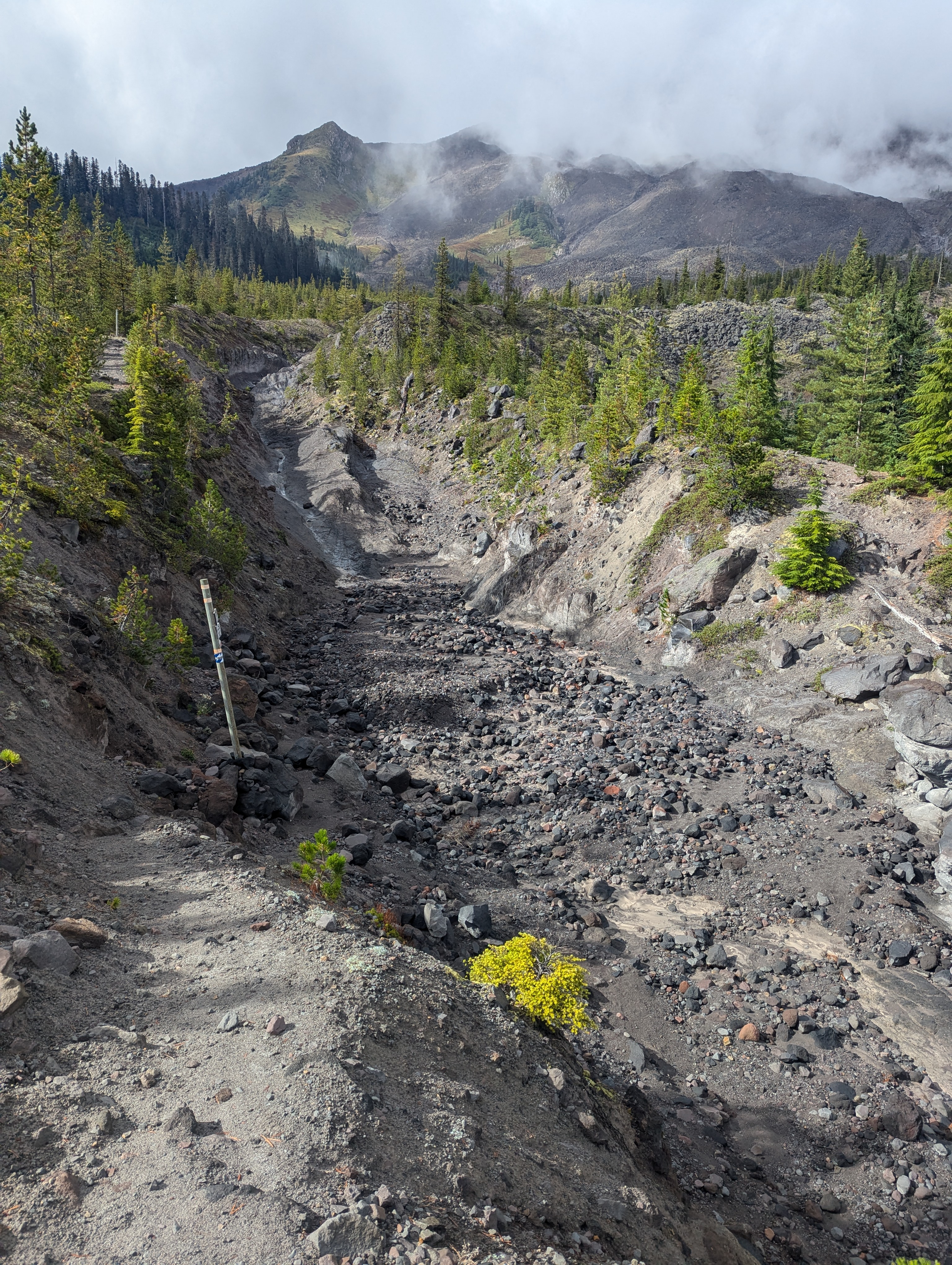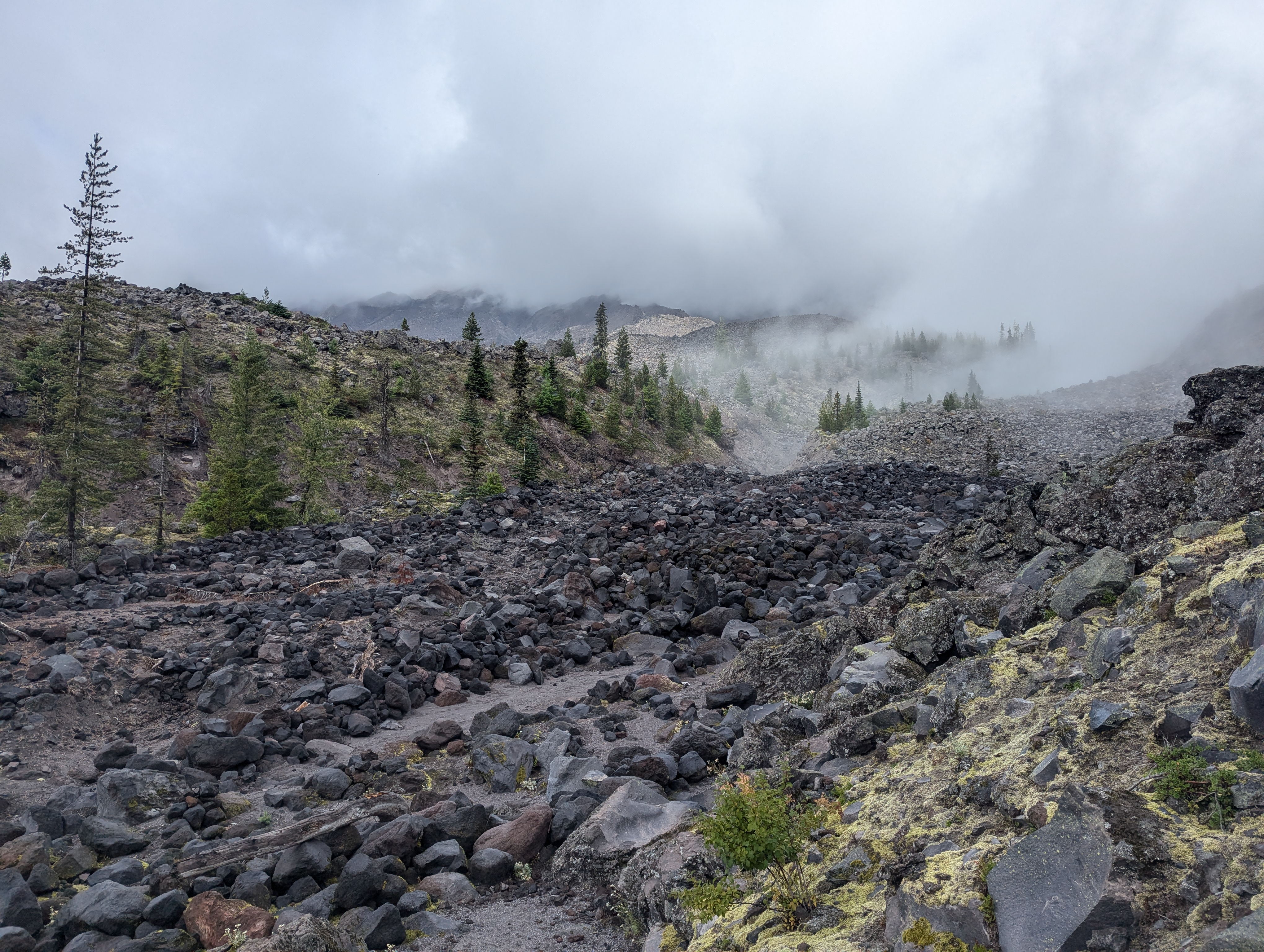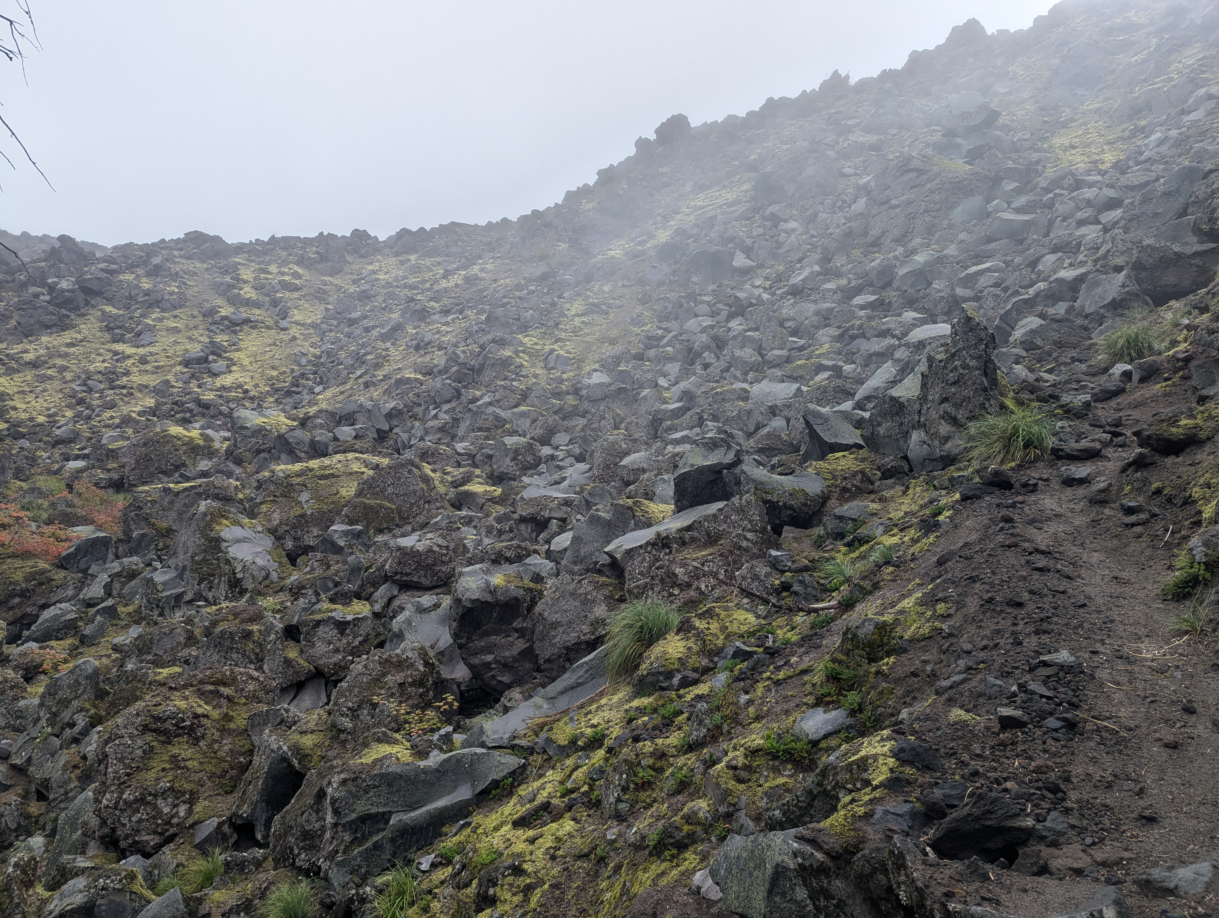 And so with great reluctance, I turn around and tread back down through the wet forest. Once back on the flat trail, I suck down a snack and some water as the sky still spits on me. Down I go, out of the clouds and into patches of sun and blue sky. I follow a trail down until I come to some animal scat. I don’t remember seeing that before. I stop and look around, trying to recognize my surroundings. The basalt boulder field climbs up steeply to my left and I can see one of the large markers way way up there. Dang, I’ve descended down too far. I tread back and forth trying to figure out where I went wrong. I even contemplate trying to climb up the basalt to the marker. I finally decide to retrace my steps as far as possible and get back to where I know I was for sure on the Loowit Trail. I get back to a spot where I was 10 minutes ago which even has flag markers. I try different ways through the trees and eventually find the path that takes me back to the boulder field.