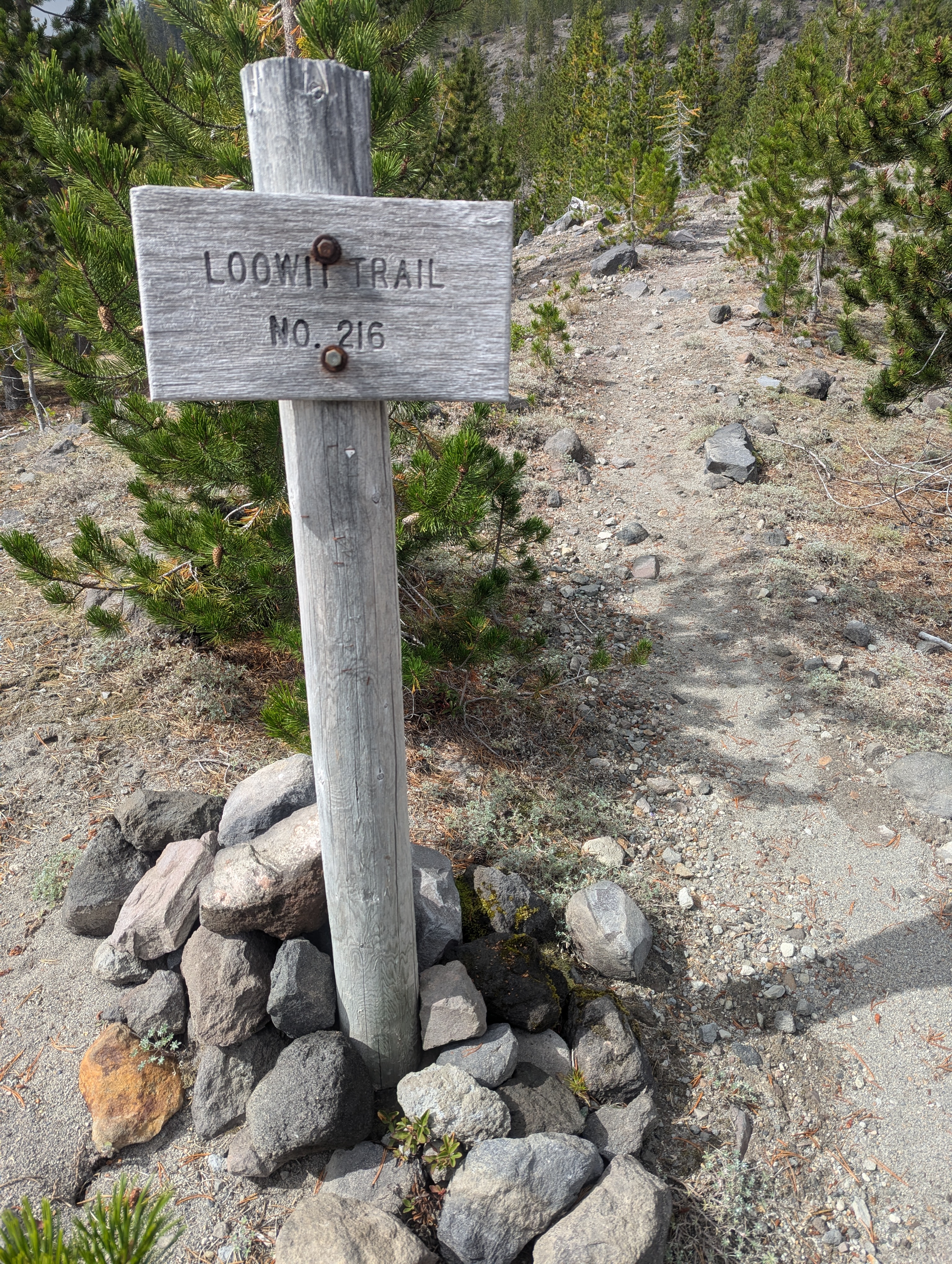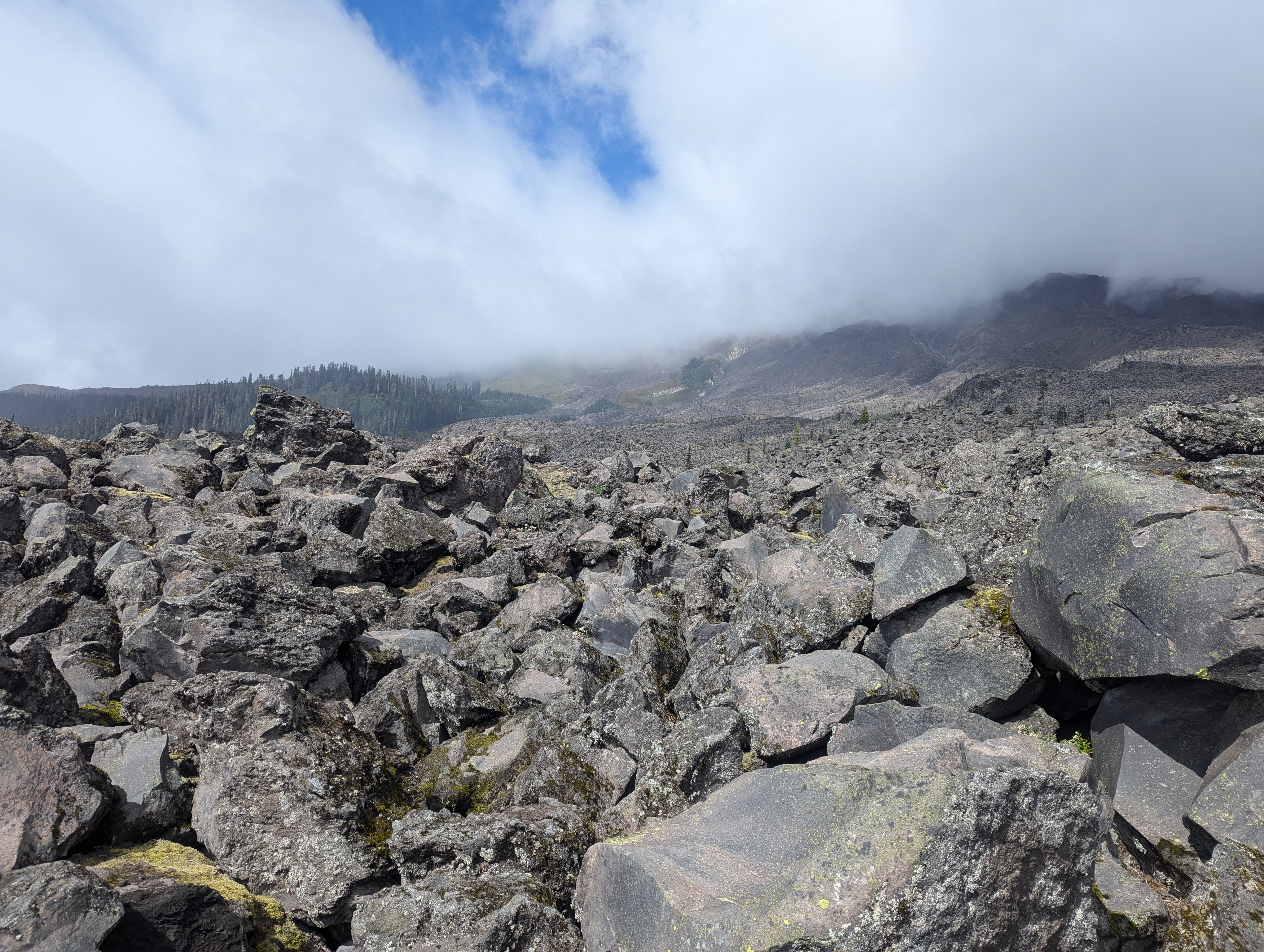 It’s a gradual climb to June Lake which has a short bridge over its spillway and a pretty little waterfall. I search around for the trail that leaves June Lake and connects to the Loowit Trail. It takes several tries but I find a faint tread through the brush. This trail is far less maintained with trees and big steps to climb. It’s just after 12:30 pm when I finally reach the junction with the Loowit Trail. I meander through the forest and climb over more trees. I climb out of the forest straight into an endless field of lava boulders.
