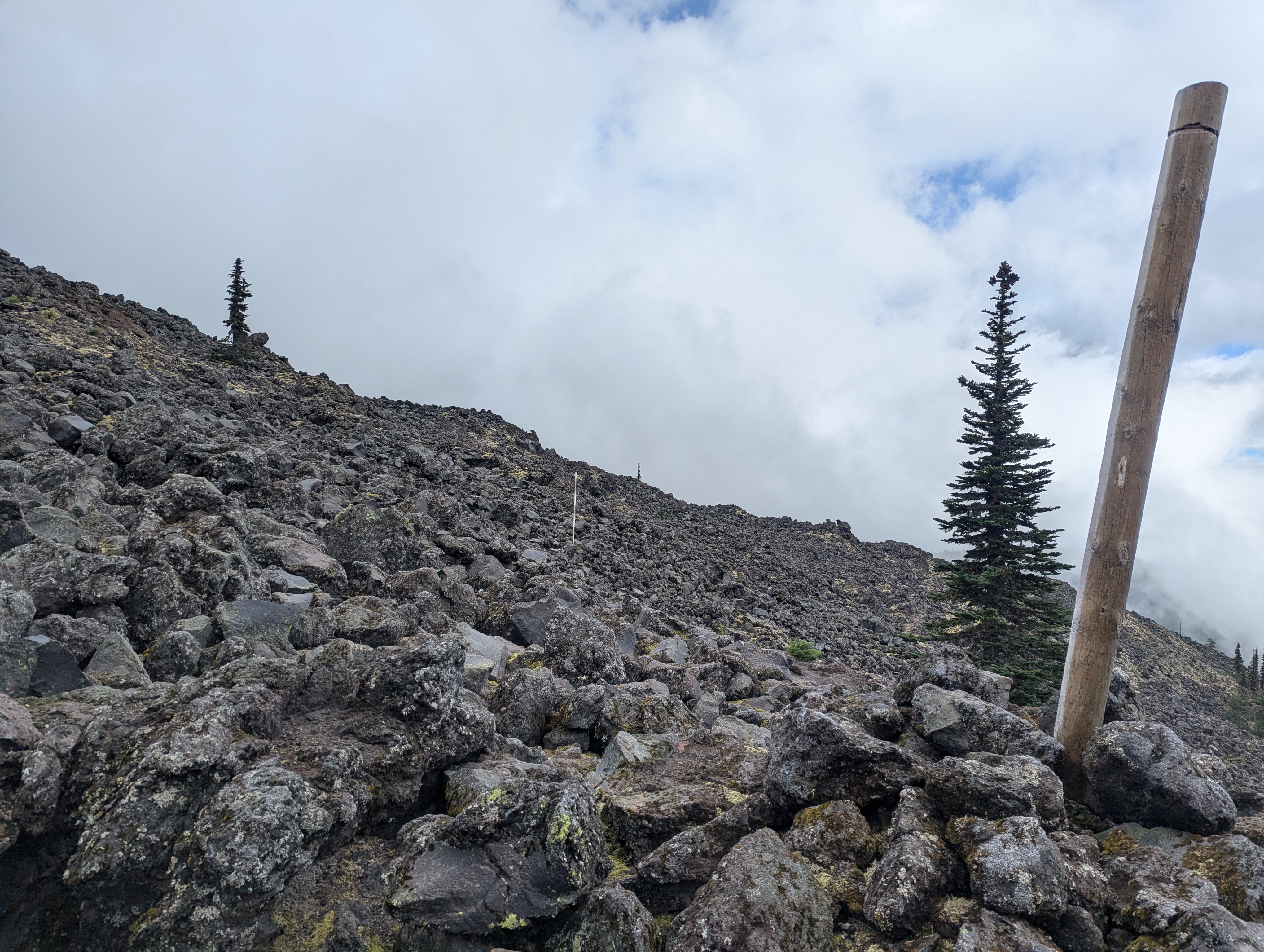 The “trail” is fairly obscure and yet visible at times. It’s relentless lava boulders as far as the eye can see. There are marker posts which at least help keep me pointed in the right direction. My InReach gives a little beep and I check my new message. My dear friends are a tad worried about this sketchy trail and ask me to be cautious. As I hop from boulder to boulder, I’m hopeful when the sun peeks out. Yahoo! Blue sky! And then just as quickly, the clouds suck themselves in around me again.