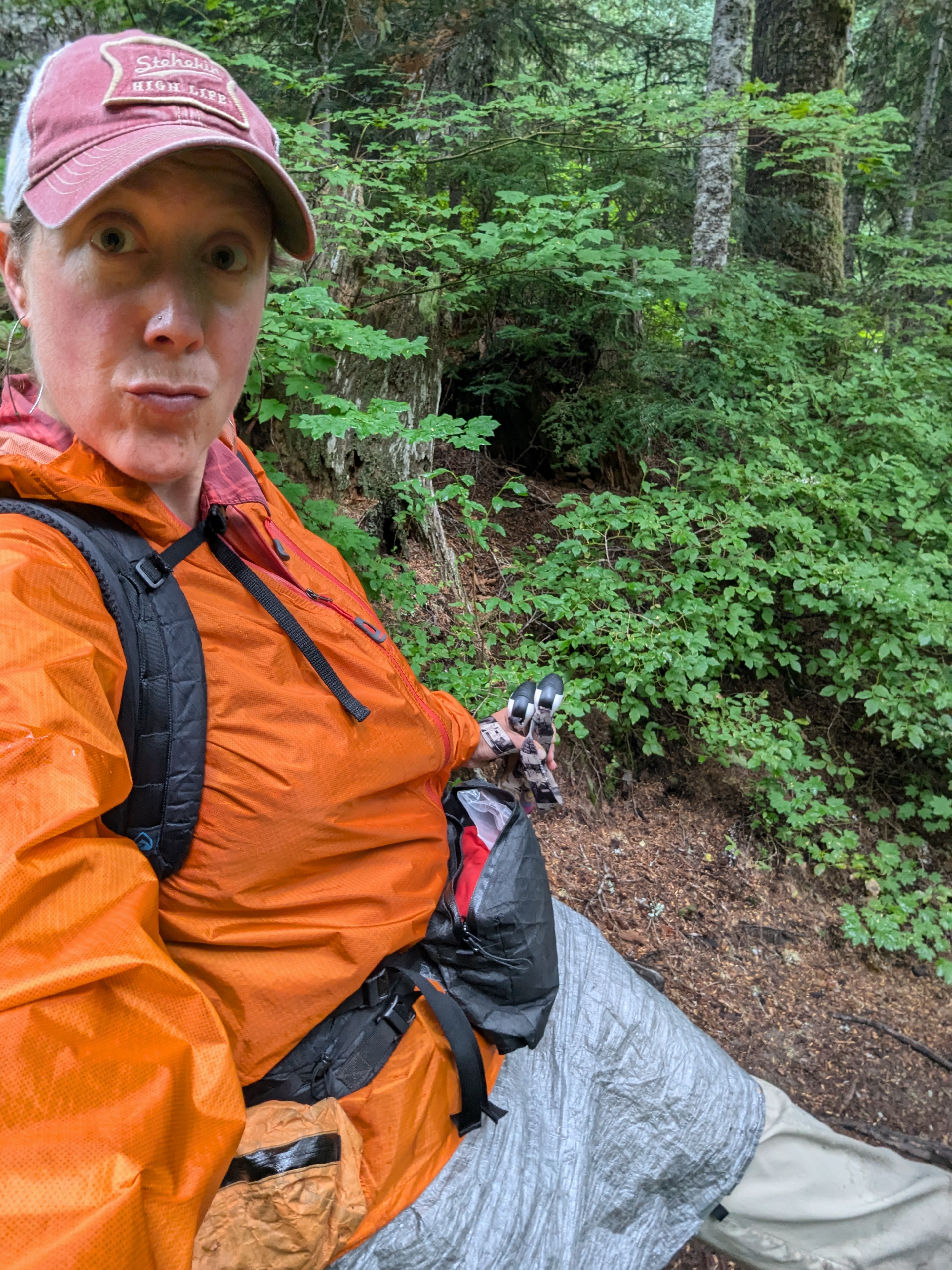 I start to climb steeply up through the forest and I can feel my left quad starting to ache. The overgrown trail is drenched in rainwater. As I push through the brush, it sheds a river of water onto my pants and shoes. Instantly, my socks and shoes are as soaked as if I’d forded a stream. I’m in the gray clouds and it starts to really rain on me. I stop and put on my rain skirt and jacket. The rain skirt keeps my pants from getting any wetter but there’s no hope for my feet. I push on, climbing for over an hour as the weight of the weather and my aching quad bear down on me.