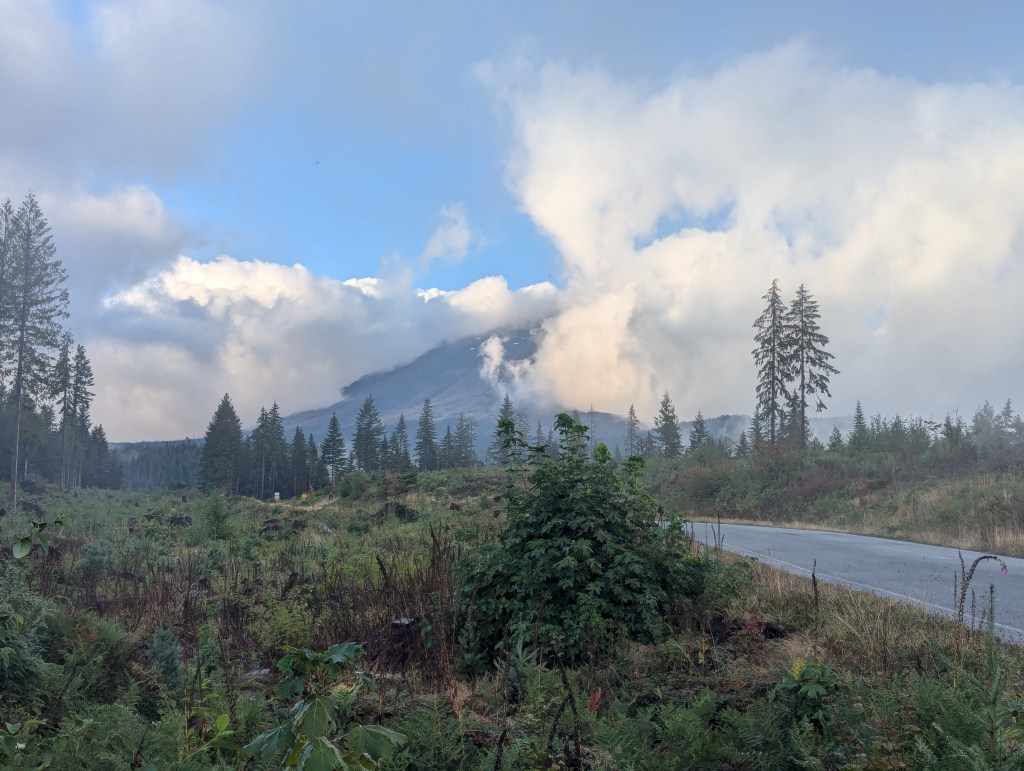 I awake early and check the weather. The weather window is shortening so I decide to head out earlier rather than later. I’m hoping to make it 12 trail miles to the South Fork of the Toutle River today. And then finish it all up tomorrow. I fill up on hotel breakfast of potatoes and eggs and pack a to-go lunch container of the same. I load up and check out by 9 am. I head South a short distance and get gas before turning East towards Loowit.