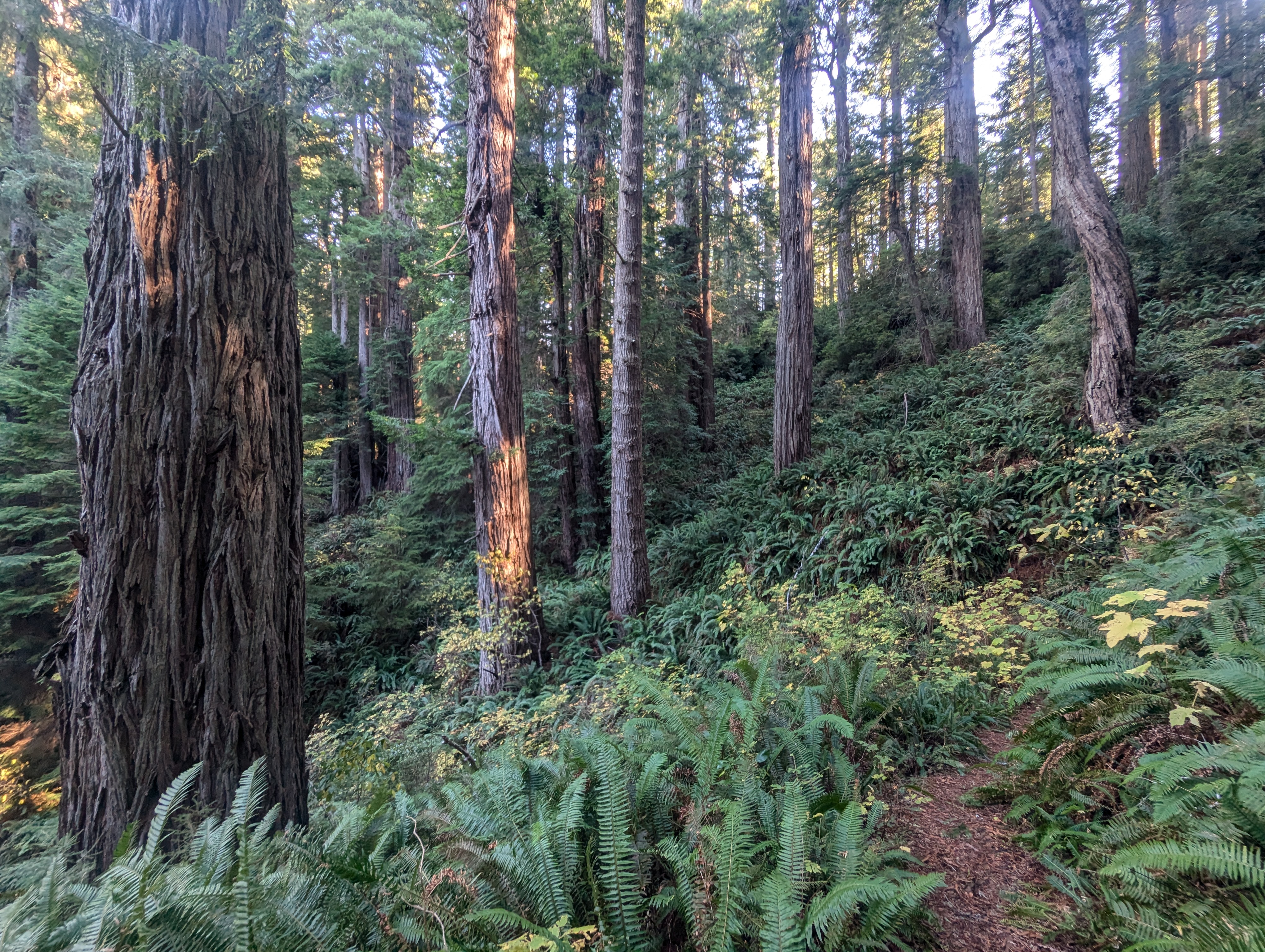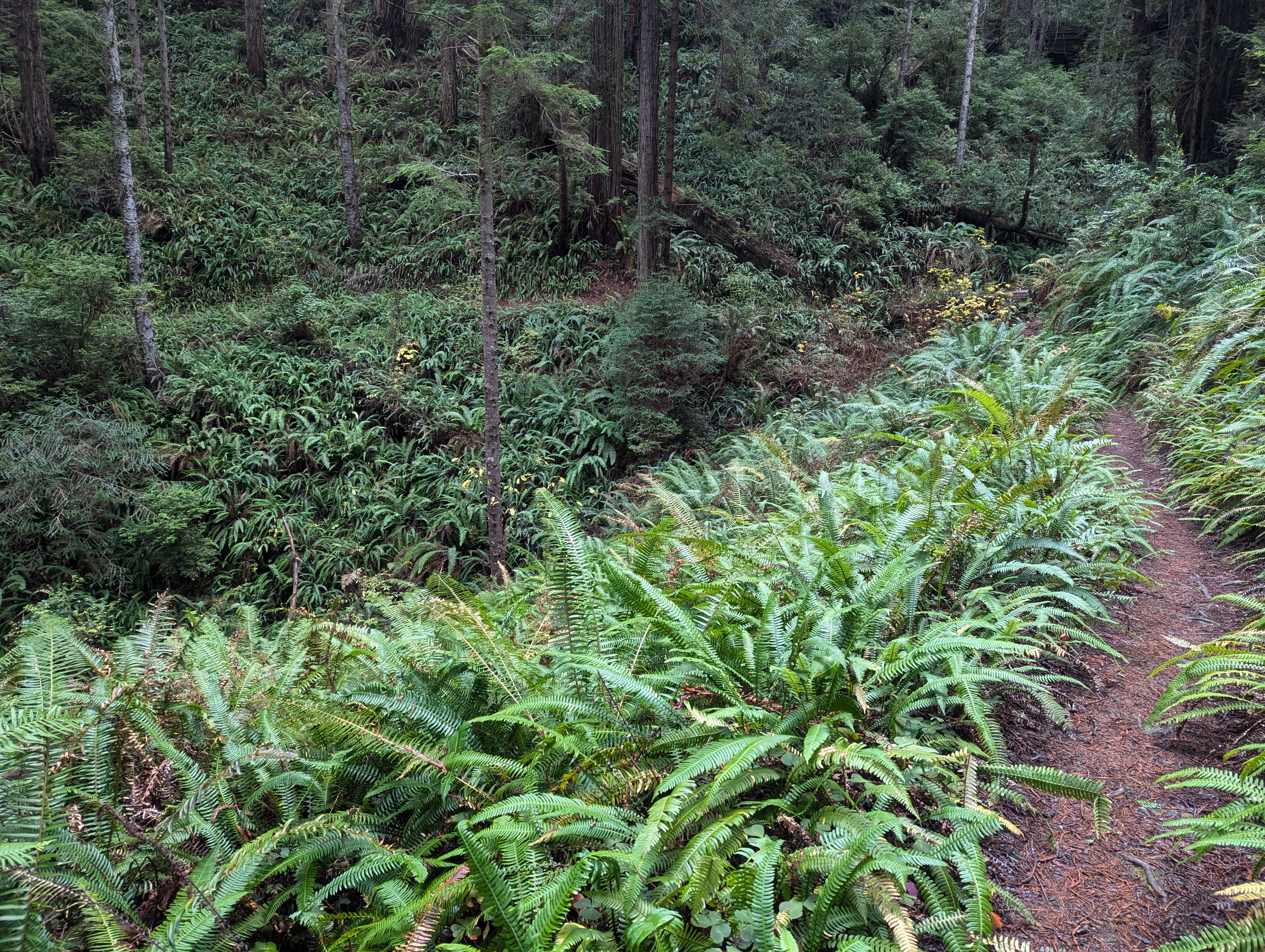 I drive all the way to Clam Beach before I miraculously realize that I have forgotten my trekking poles. The return home adds at least 20 minutes to my morning. I’m on trail by 8:10am with the plan to go check out Fern Canyon.