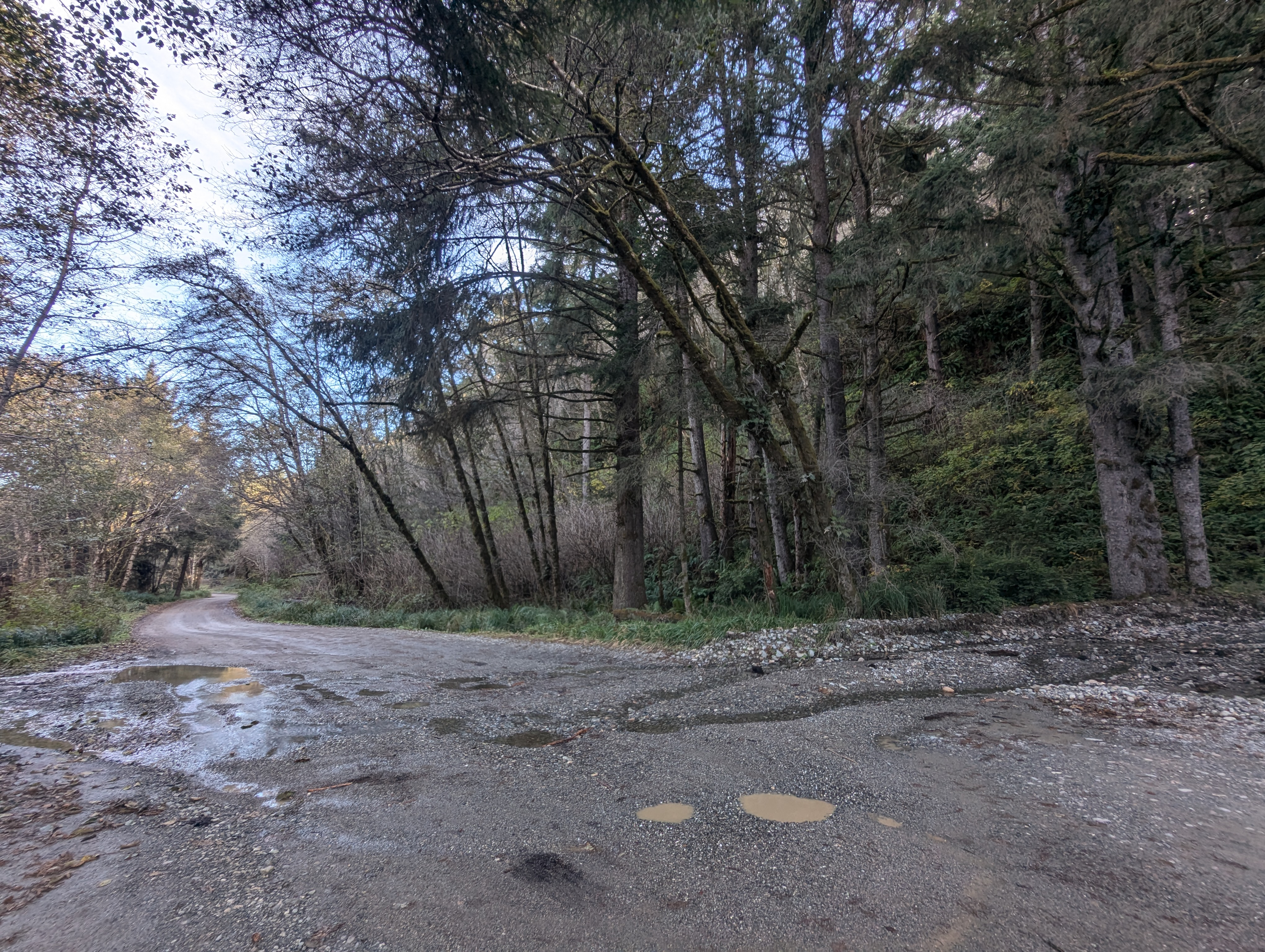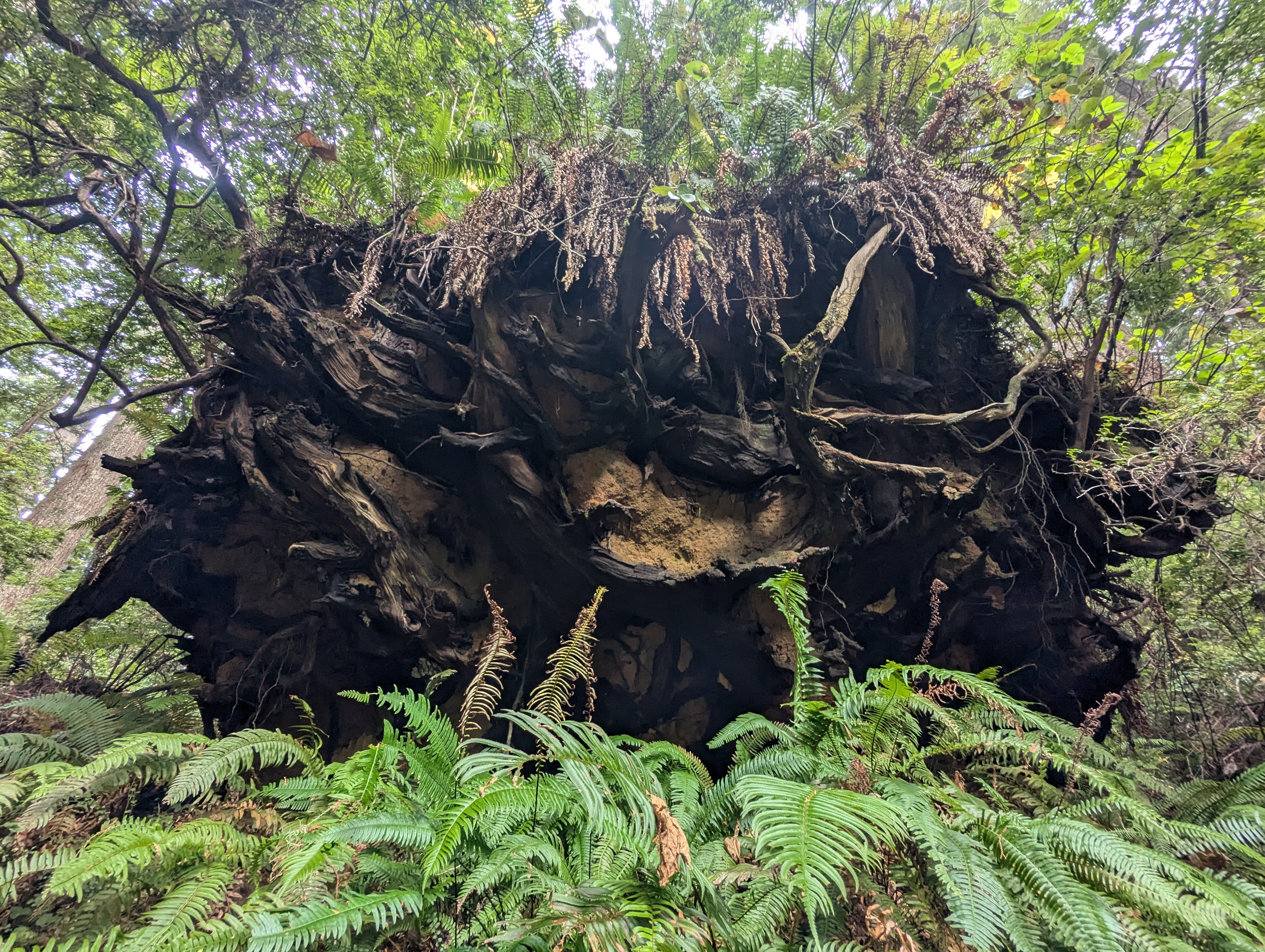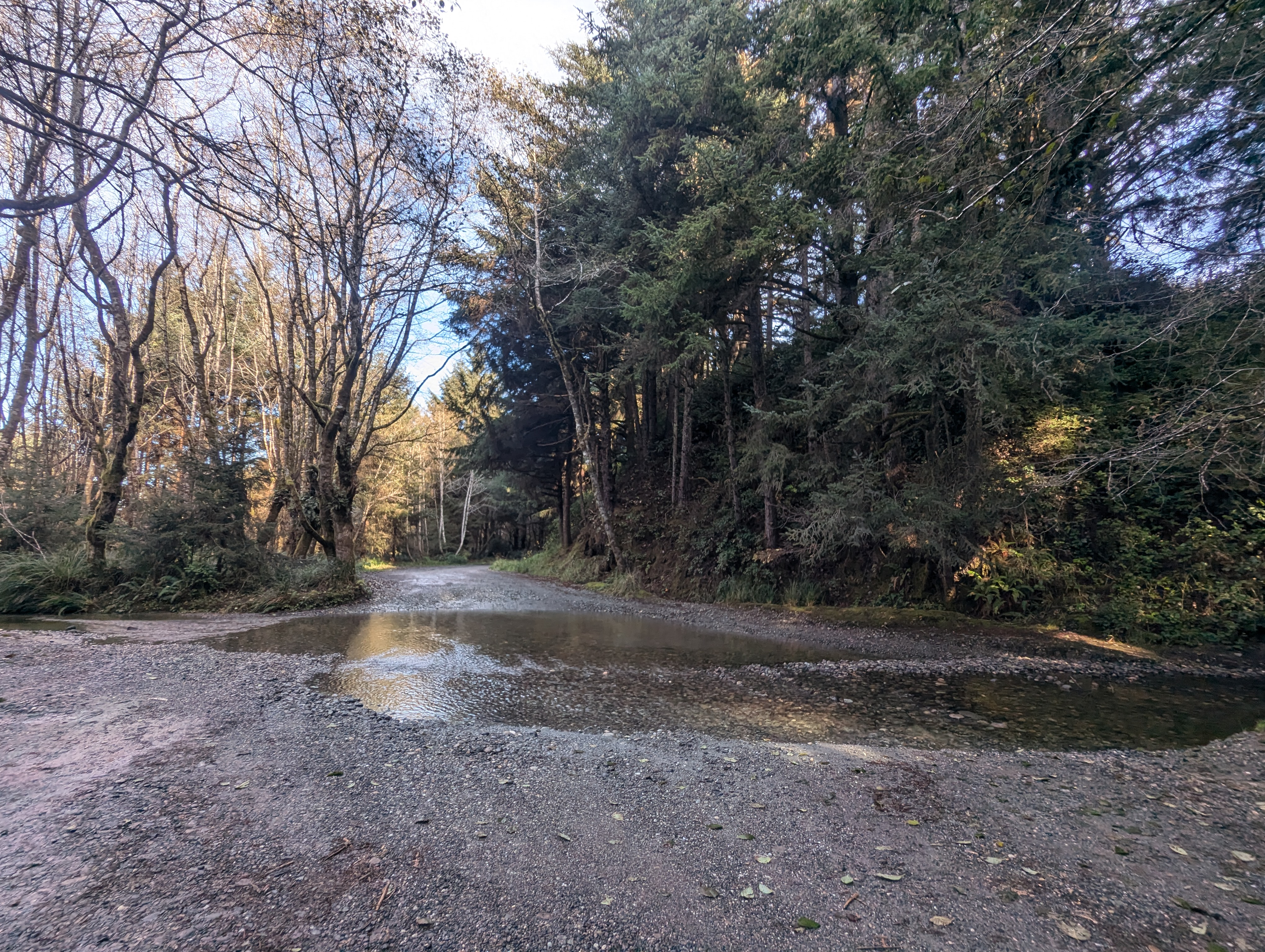 Gold Bluffs Beach Road doesn’t look too bad after the recent rains. To my surprise, several cars pass me on the road. Dang, I really thought Fern Canyon was closed. I walk the road to the parking lot where there’s a bunch more cars. I have second breakfast at the picnic tables and finish my mocha.