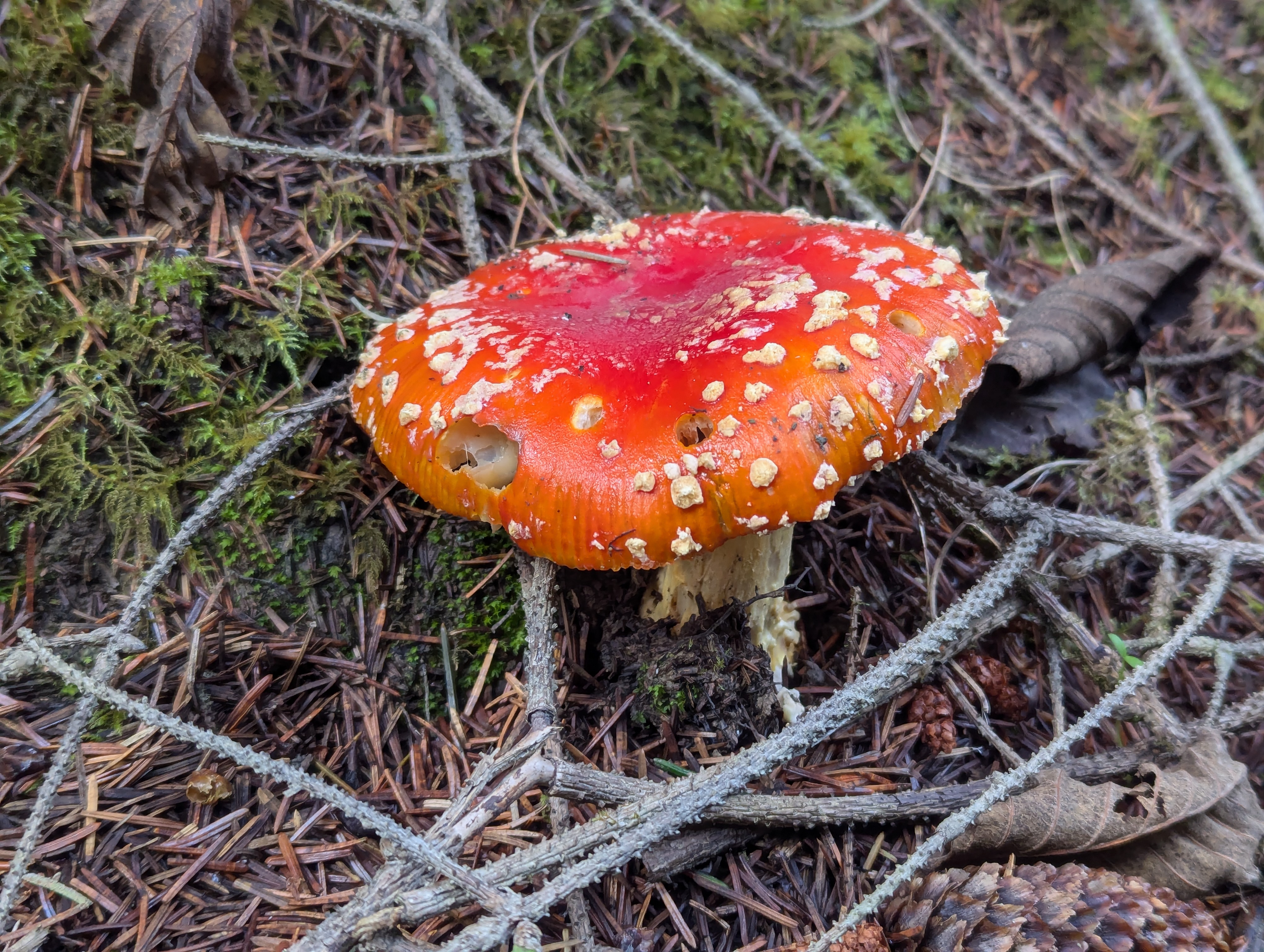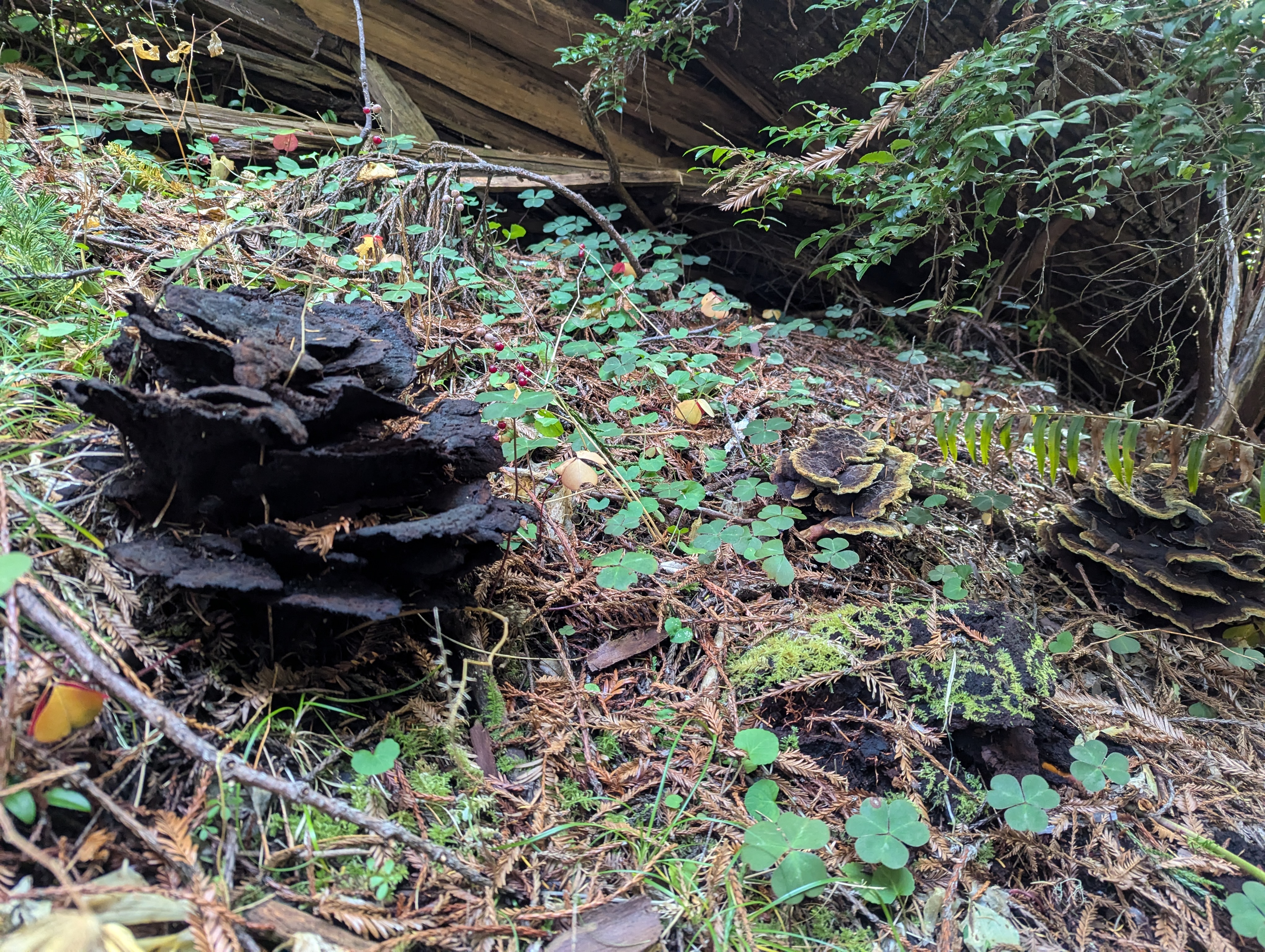 I trace the ridge, pushing the pace. There’s a new tree down across the trail but it’s easy to maneuver around it. Just after I pass a redwood tree with fungi growing out of it, I meet a couple ladies on the trail. I can tell that they don’t hear me approaching. They definitely think they are the only ones out here. It kinda looks like they’re searching for a spot to pee. I zip by and get on my way.