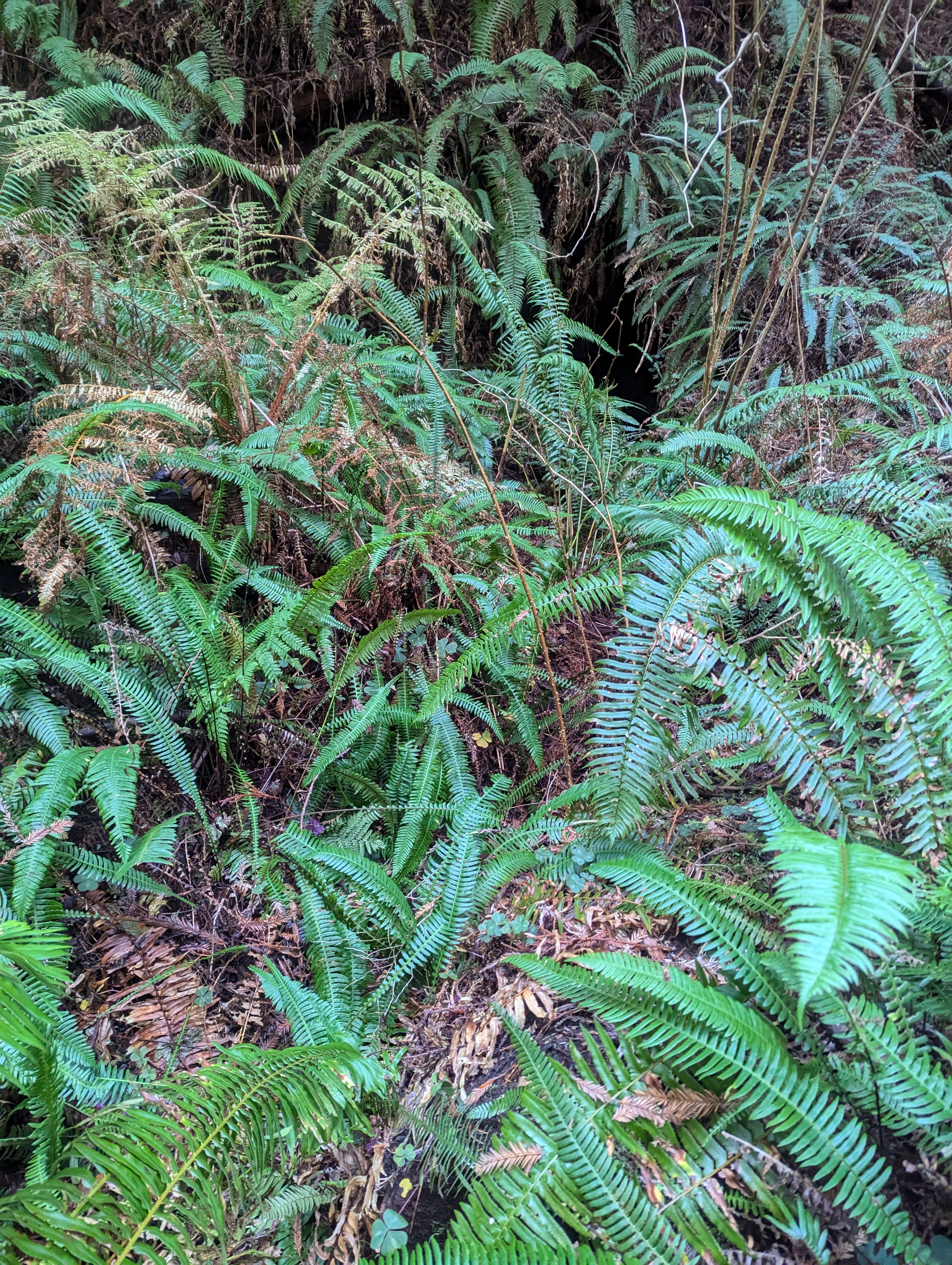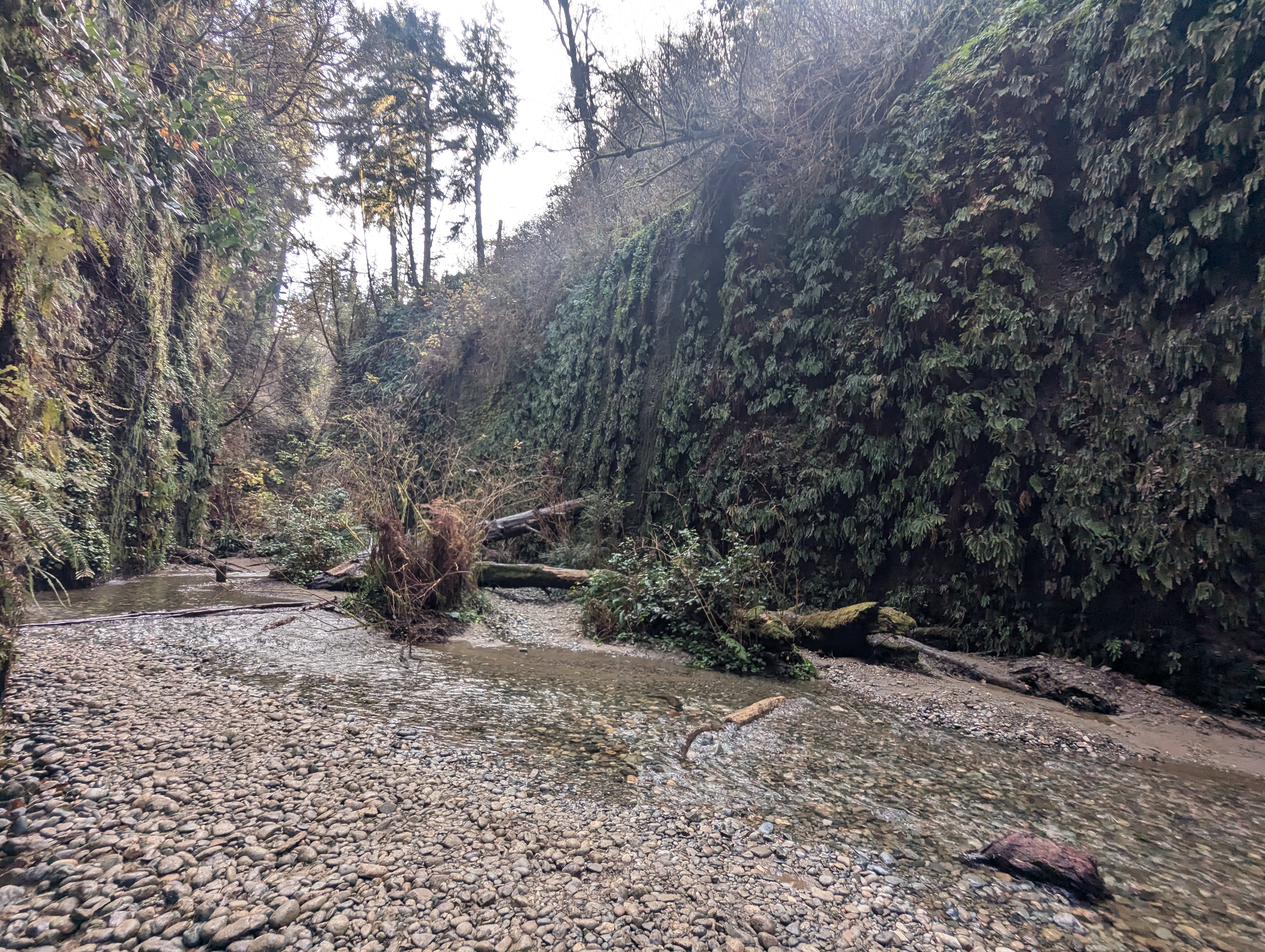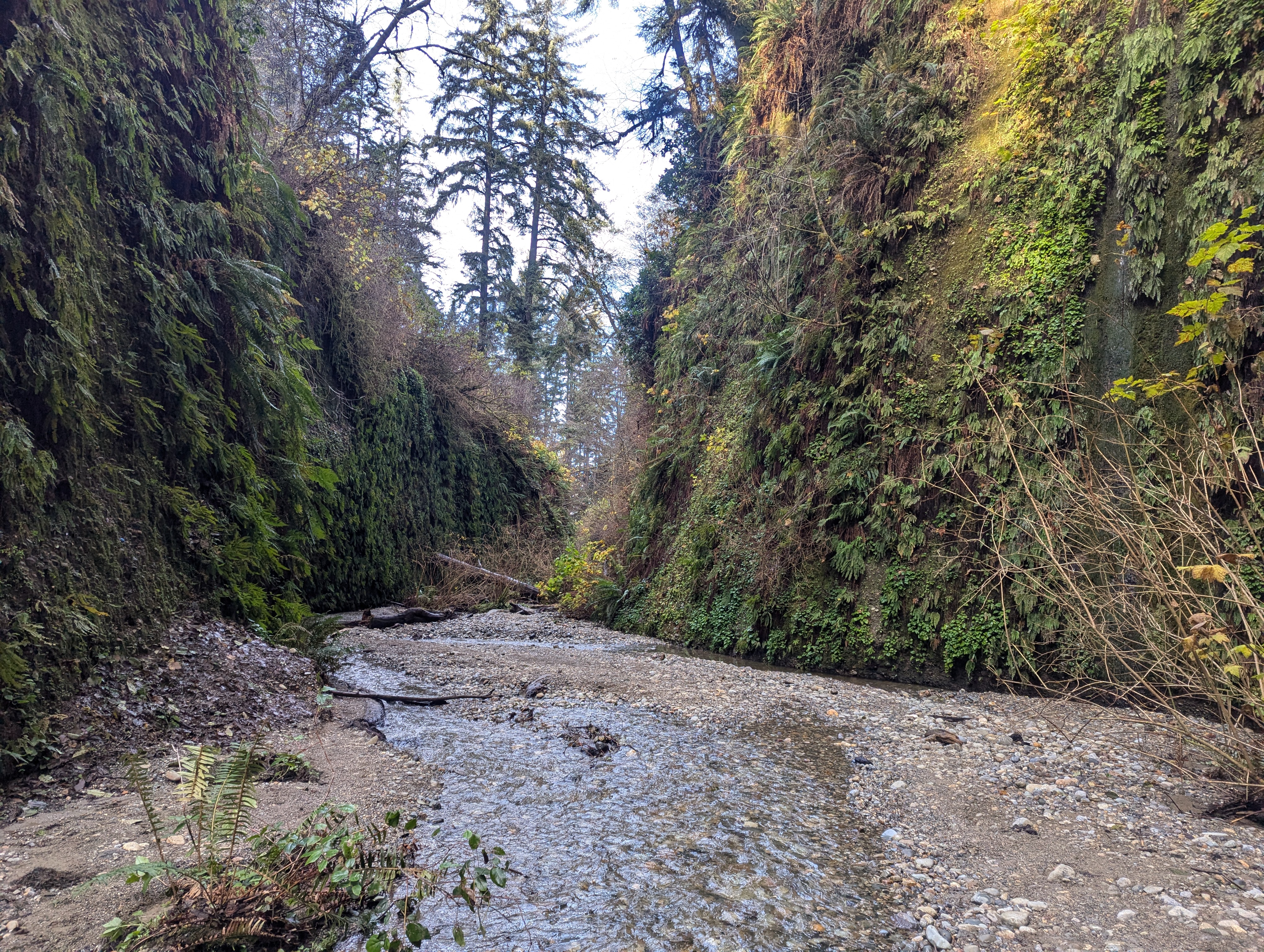I pass at least 10 people on the trail to Fern Canyon. Near the mouth of the canyon, I stand back and wait for a lady to take a picture. As I start to walk past her she asks me if I know the trail. She’s got her phone in her hand and states that the Alltrails maps won’t load. I ask her if it works without the internet. She says “oh I know I should have downloaded it.” I tell her it’s pretty clear and easy to follow the trail up the canyon. I start to walk off and she says she’ll just follow me. I easily navigate the channel with my waterproof boots and trekking poles. I get the sense she’s having a hard time keeping up with me so I stop and chat with her a little more. I bid her well and happy adventuring and round the corner.