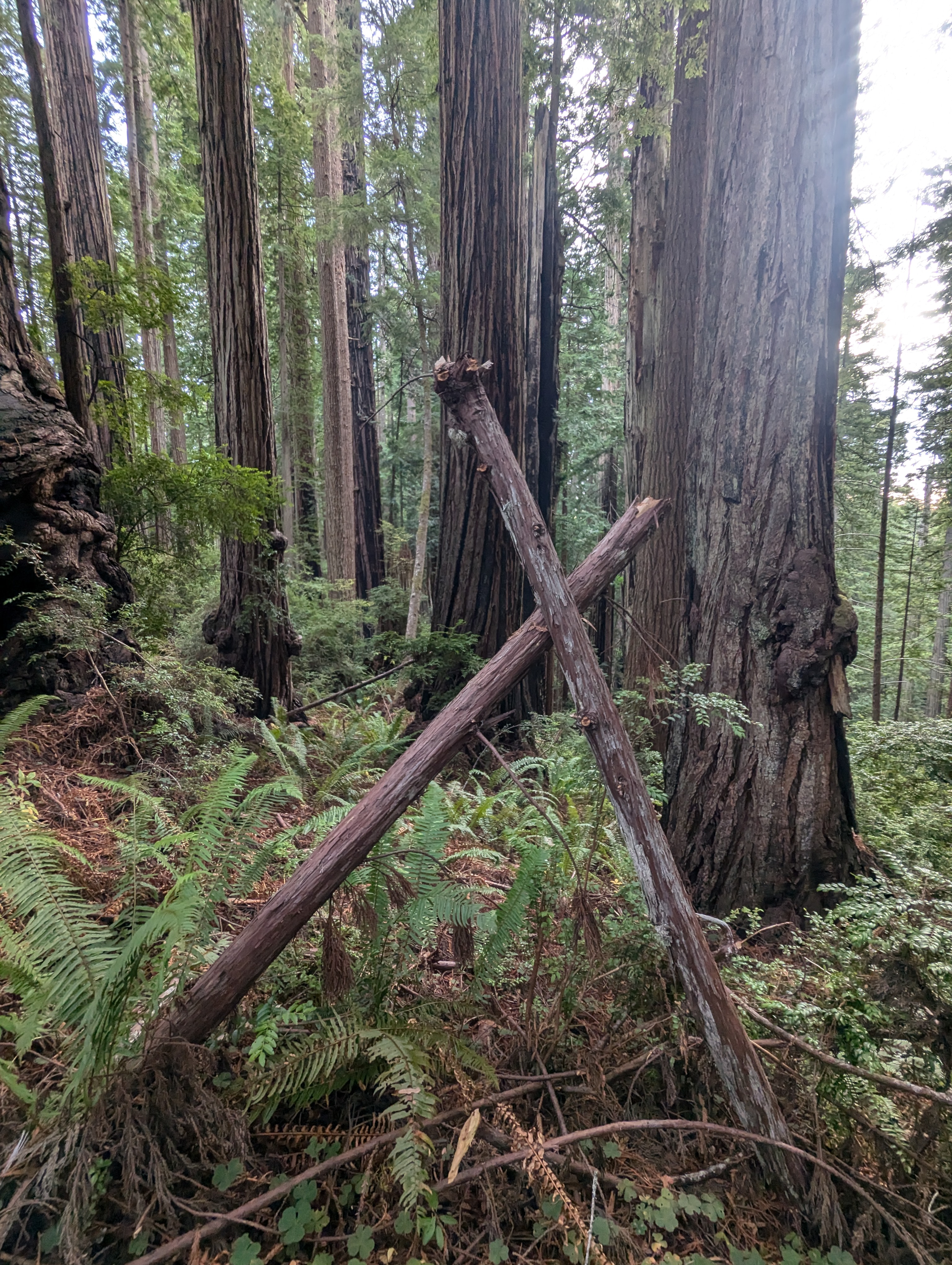 I have a faint recollection of a trickle of water somewhere along the Friendship Ridge Trail. I always try to make mental notes where I hear or see water. If I remember correctly, I’ve only ever been able to hear this water. It’s about 12:30pm as the trail approaches the trickle. I drop my pack and push through the ferns toward the sound of the water. I approach a dark hole which is actually the underside of a redwood log. I make a lot of noise in case there’s anything in there I need to scare off. And there flows my precious, ice-cold water. I fill up my bottle as far as I can and drink. I refill and climb out.