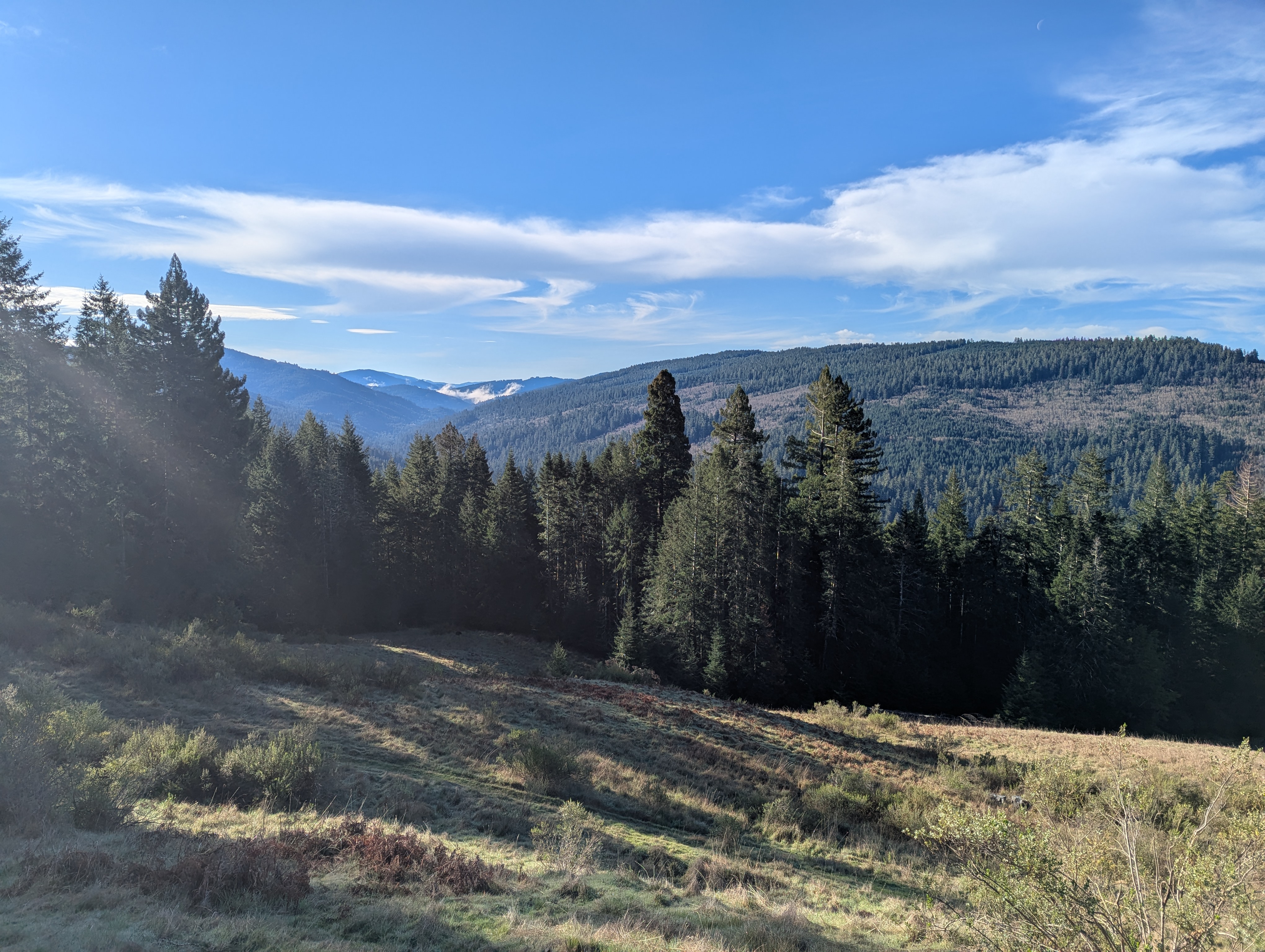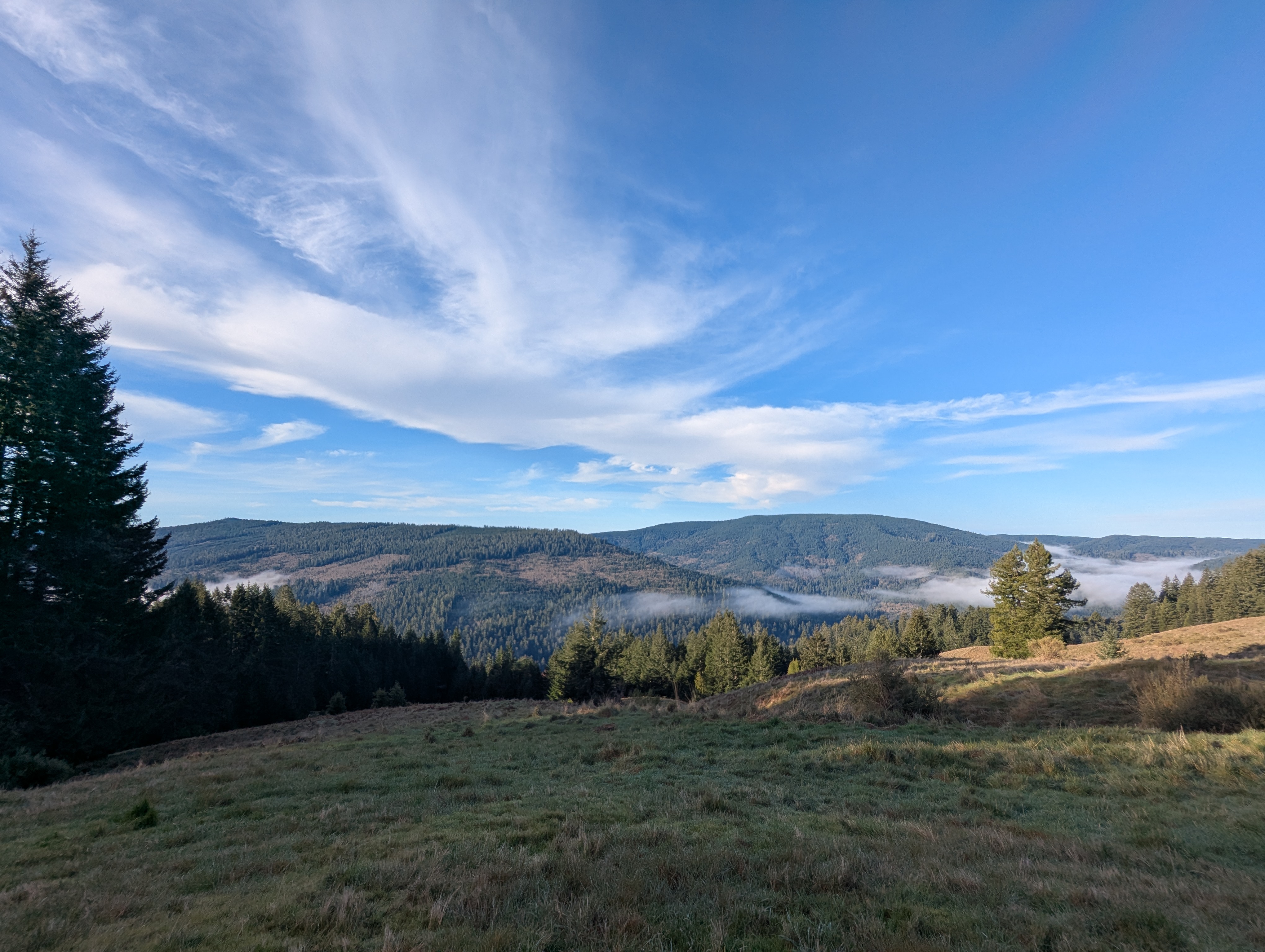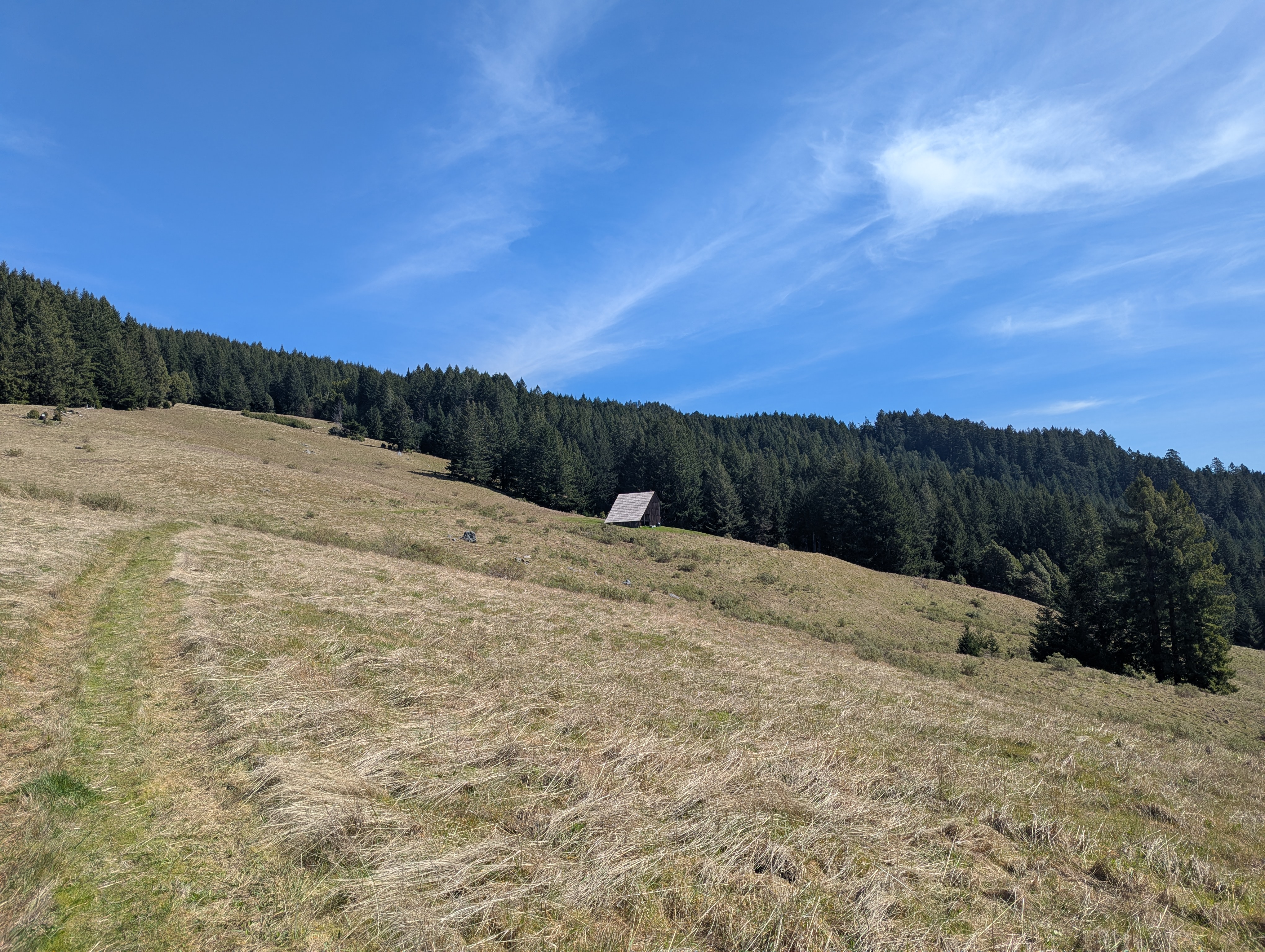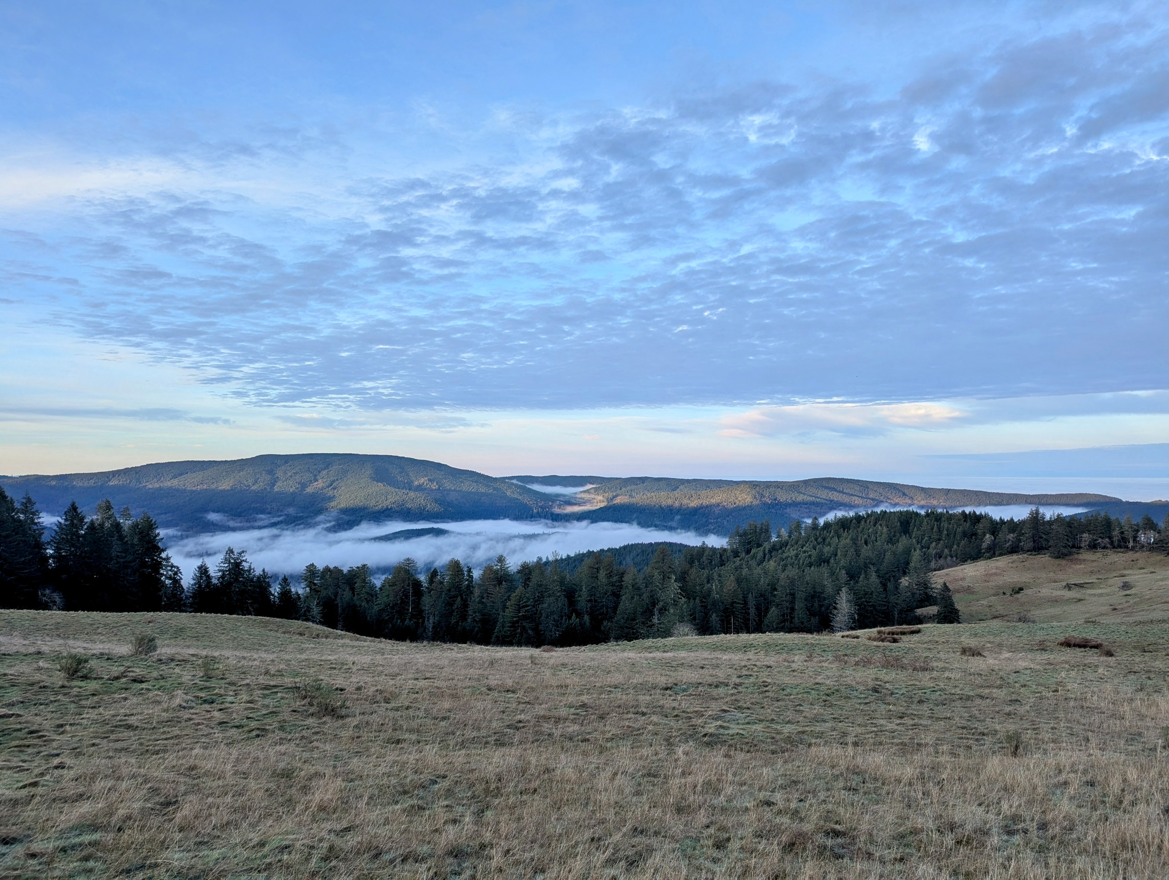 Sections of fog sit down in the Redwood Creek drainage but the 1960s clearcuts are still visible. The trail heads out across the prairie away from the barn before dipping back into the fir forest again. Sooty grouse calls nearby to a distant friend. I look for the grouse who sounds so close and yet its location is not revealed.