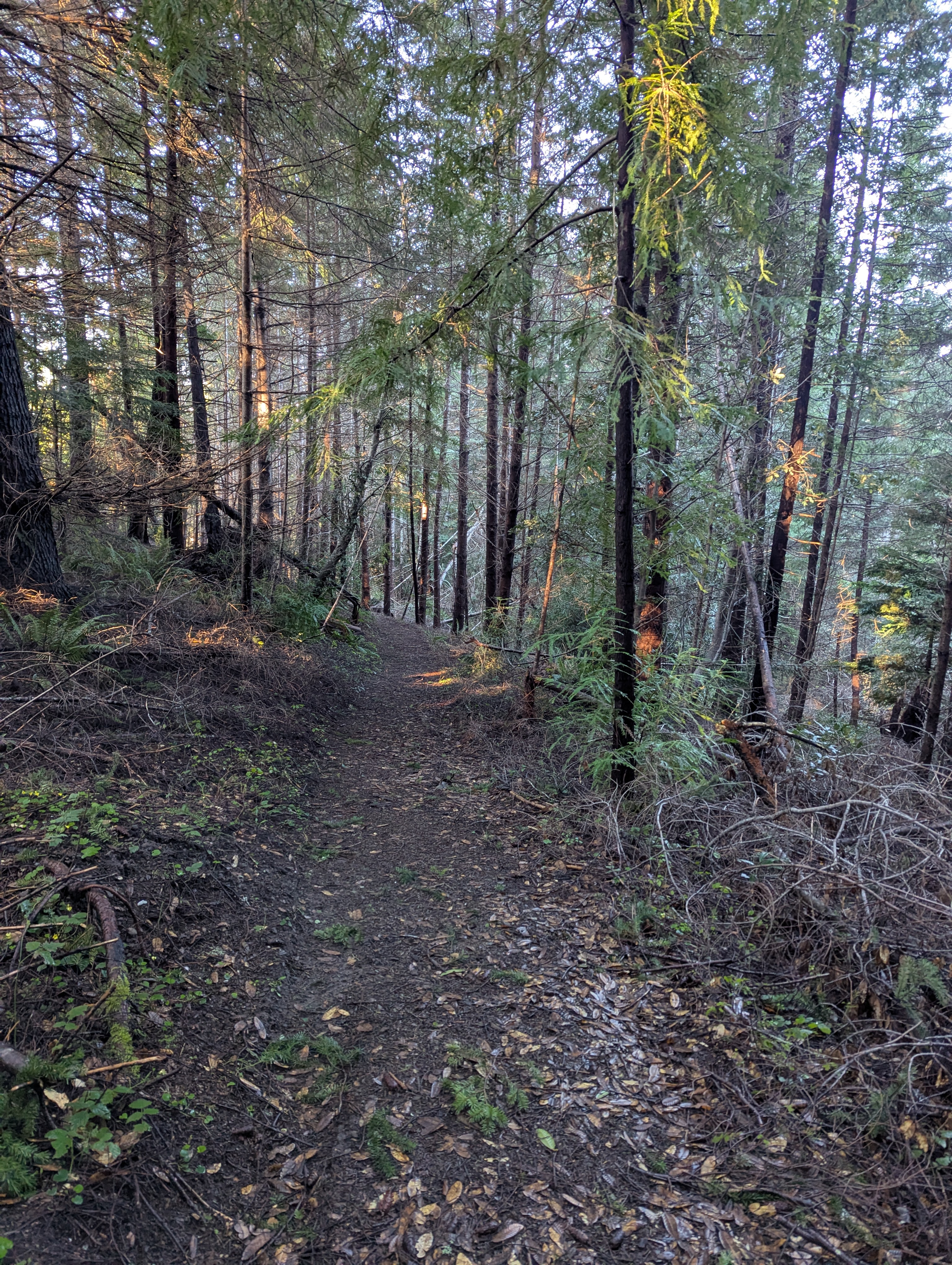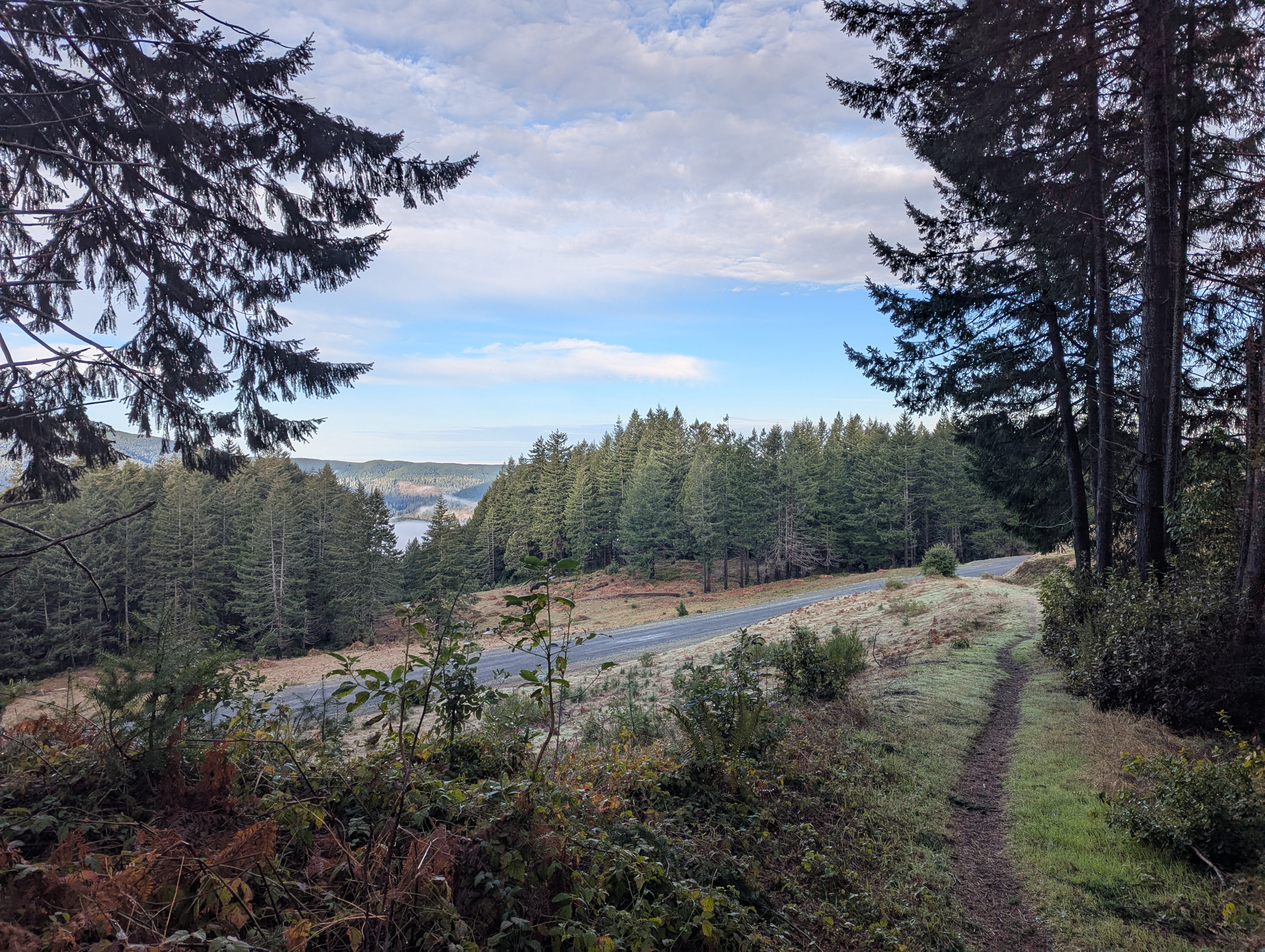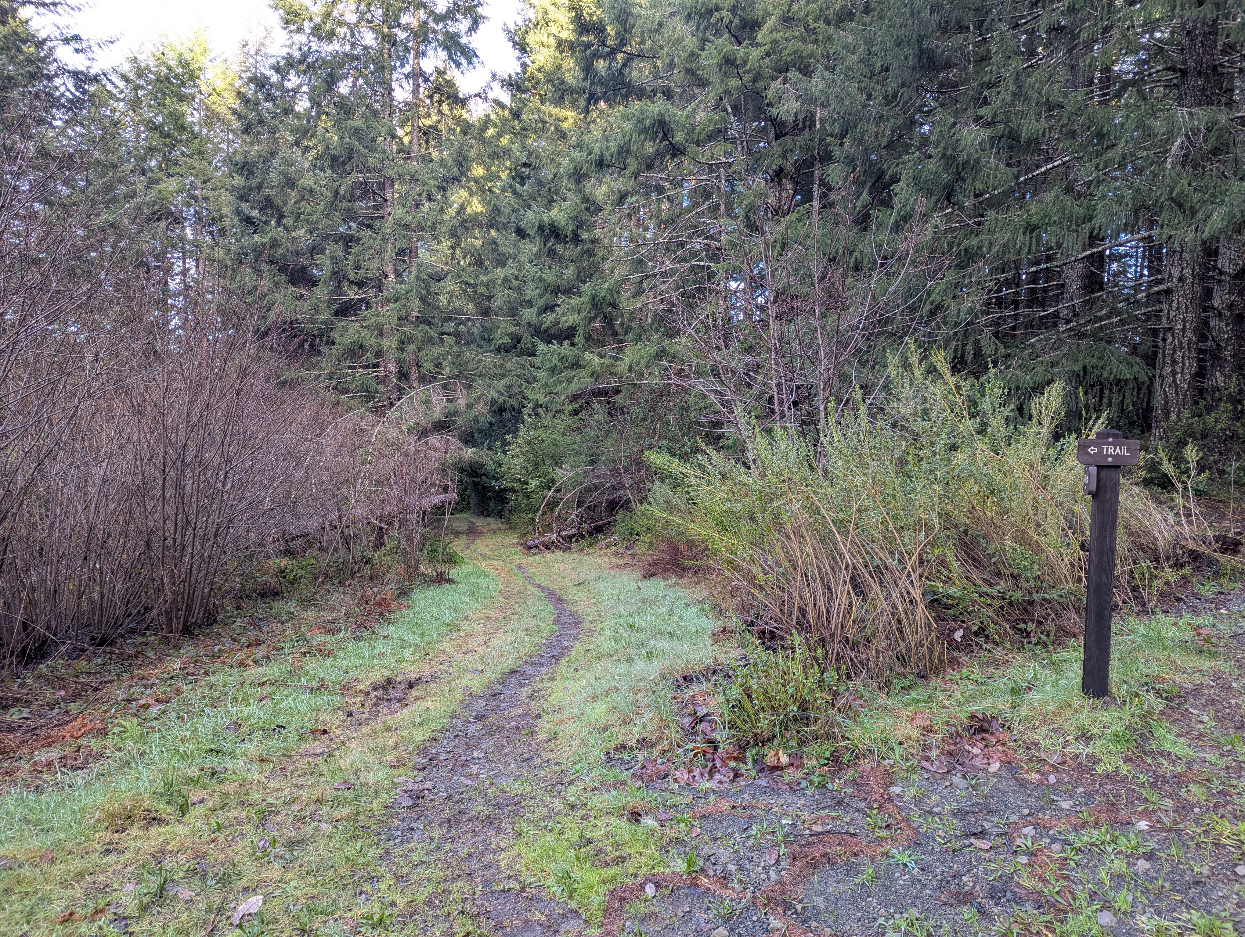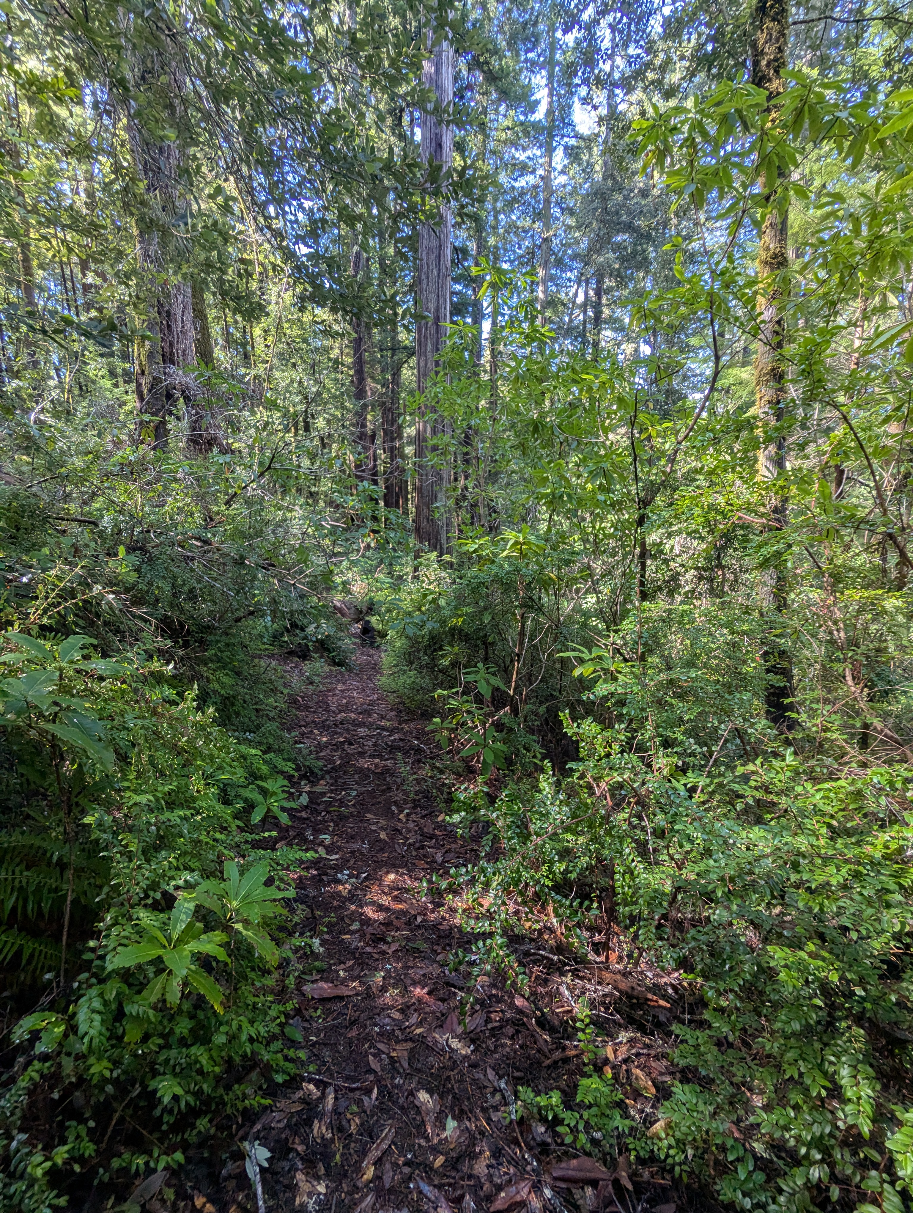 A few minutes before 8 am, I set off down the trail. My hands are still so icy that I can’t even set my trekking poles to their correct length. I skirt the edge of a prairie and immediately head into the trees. Water seeps out of the trail as I wind down to a gravel road that’s nicer than Bald Hills Road. I follow the road for a quarter mile before turning left back into the forest.