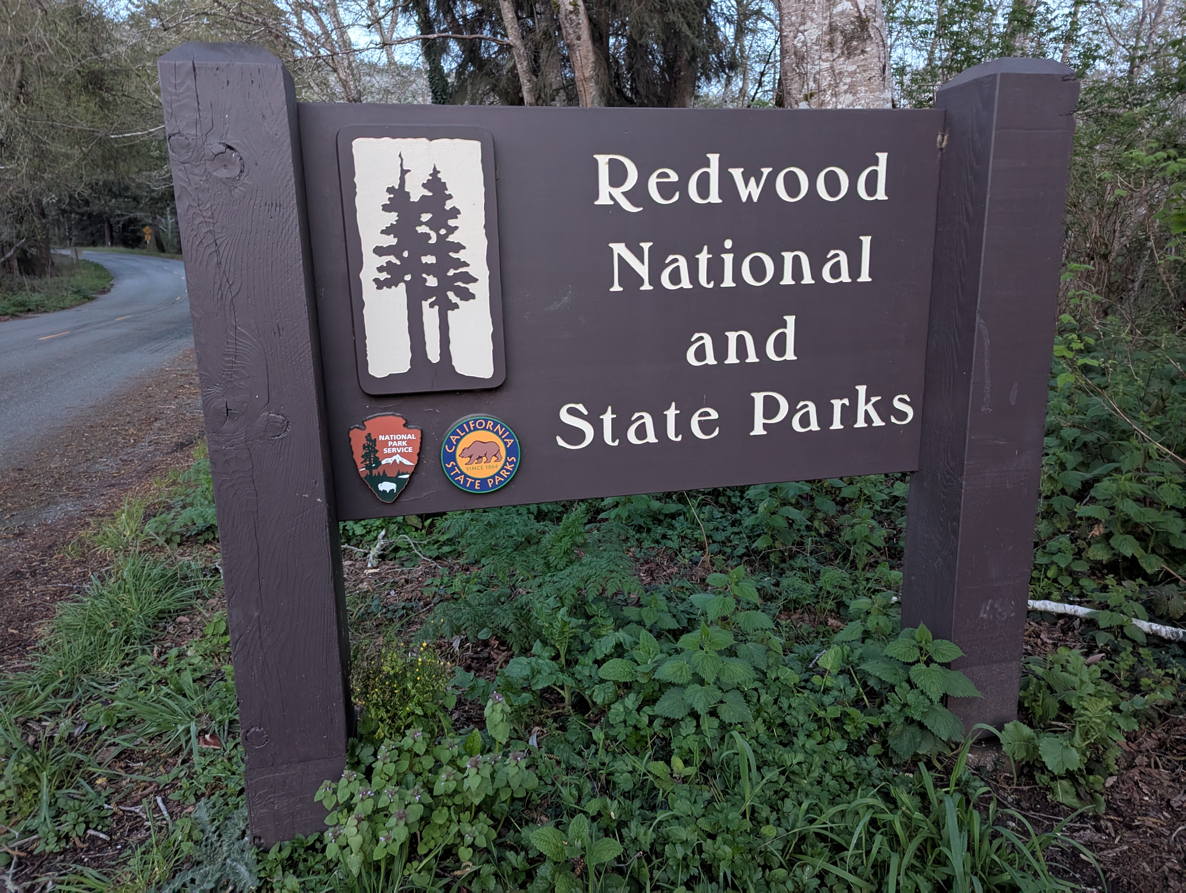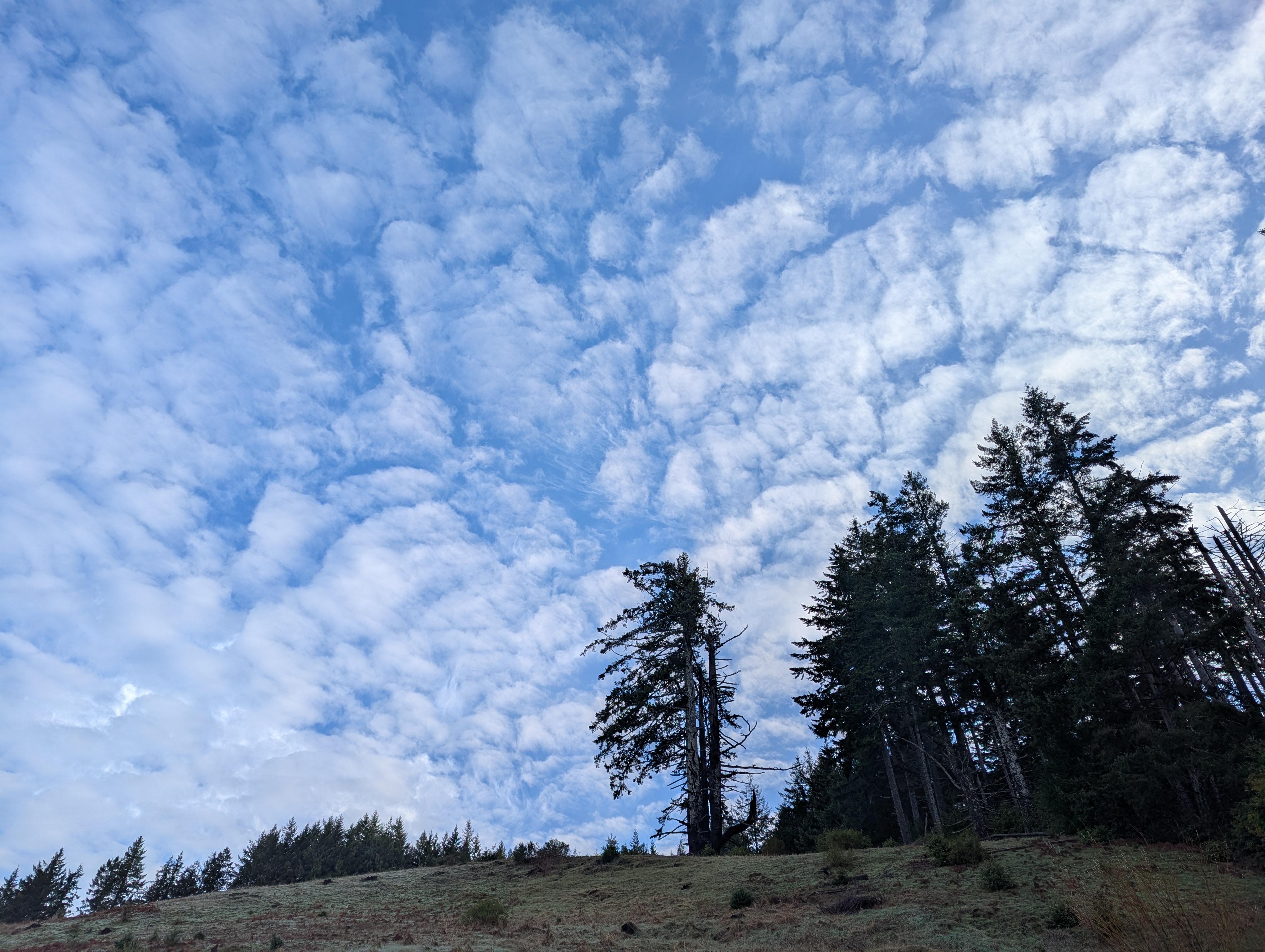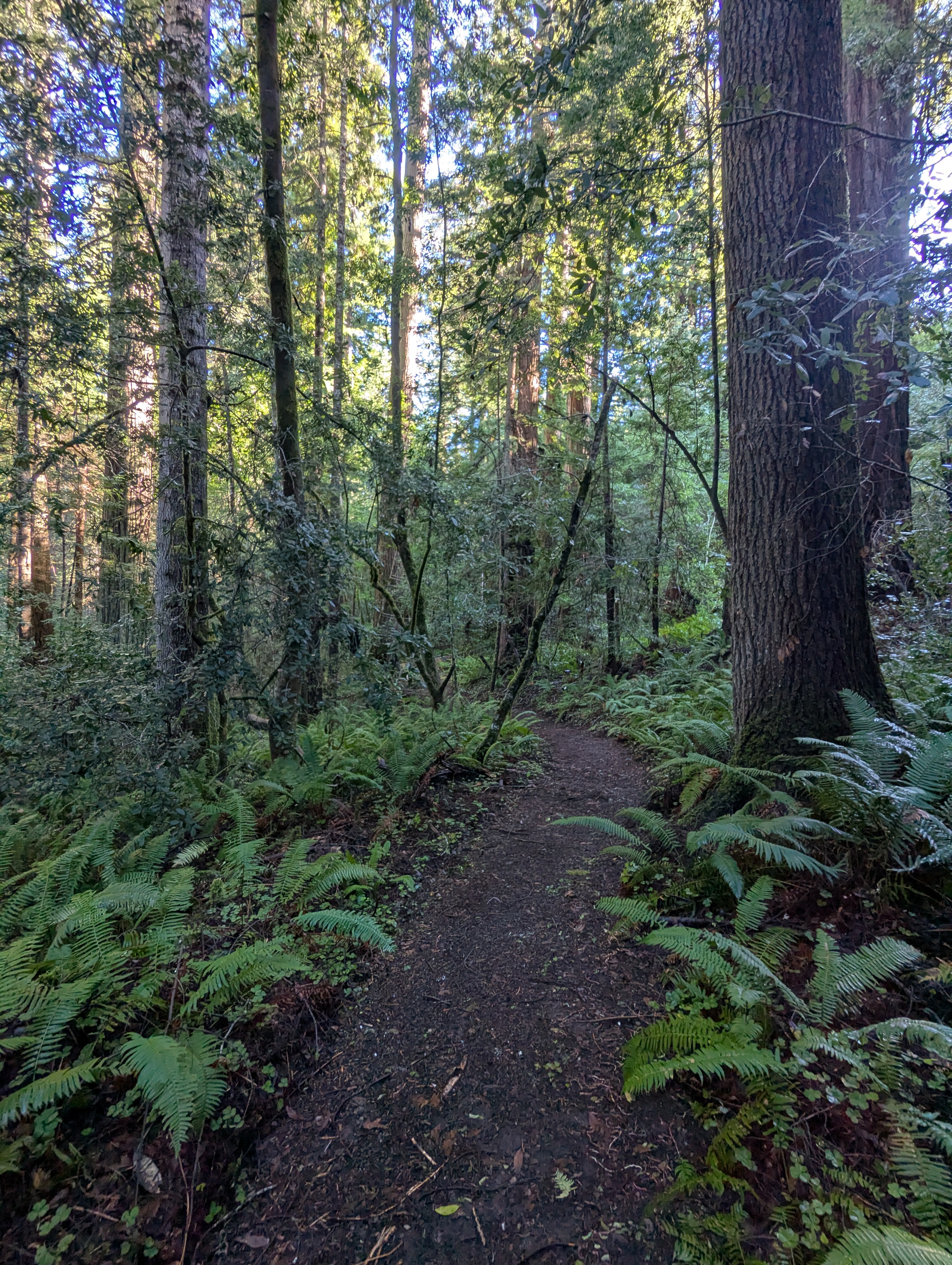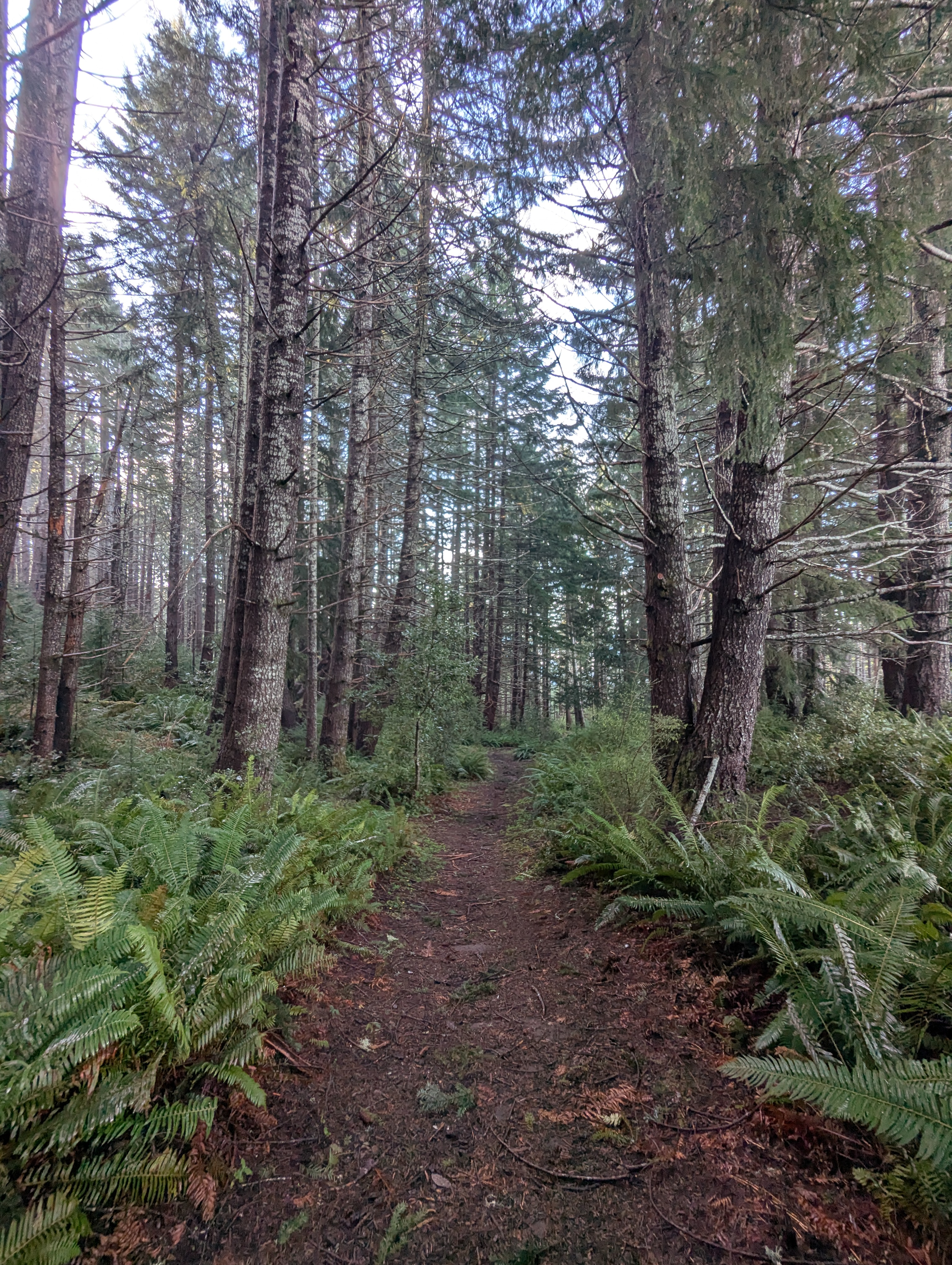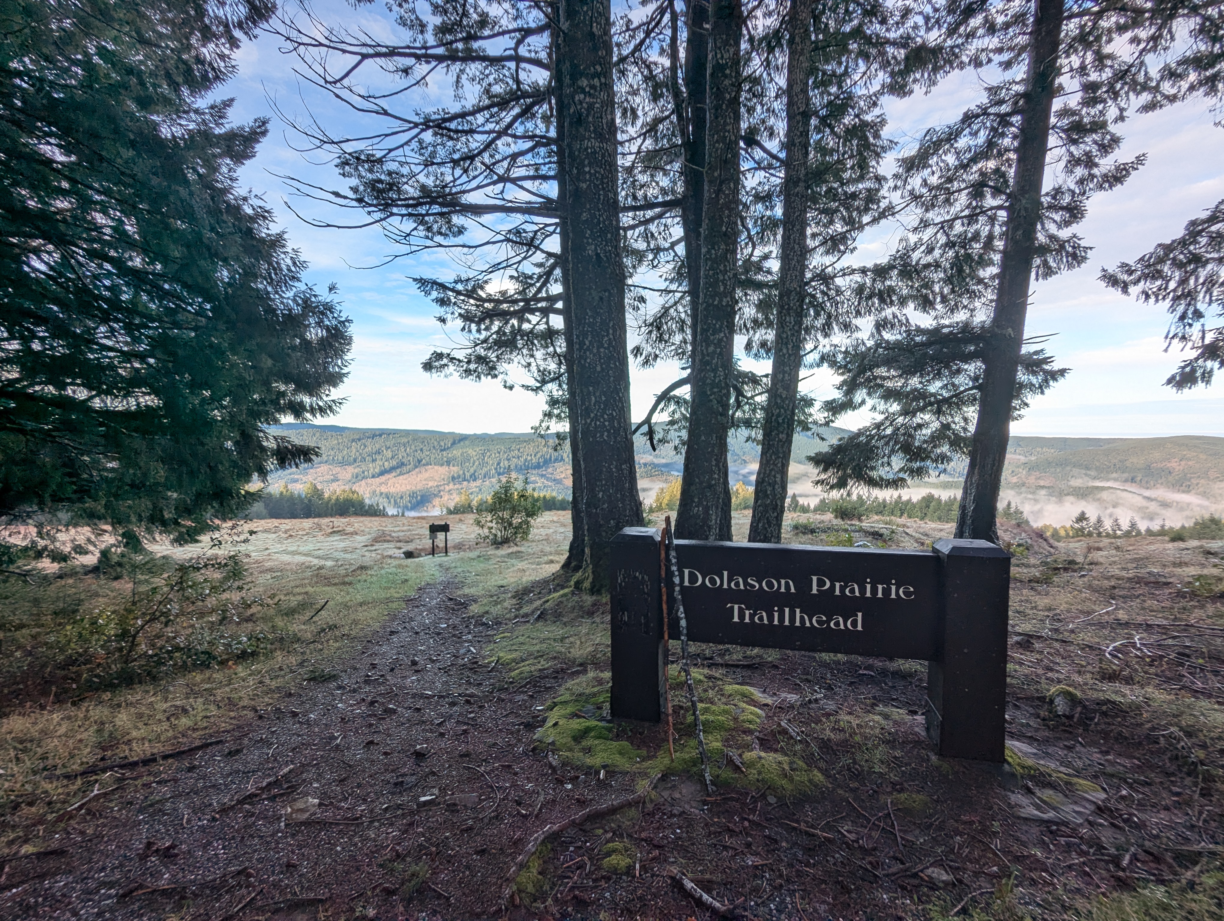 A few minutes before 8 am, I set off down the trail. My hands are still so icy that I can’t even set my trekking poles to their correct length. I skirt the edge of a prairie and immediately head into the trees. Water seeps out of the trail as I wind down to a gravel road that’s nicer than Bald Hills Road. I follow the road for a quarter mile before turning left back into the forest.