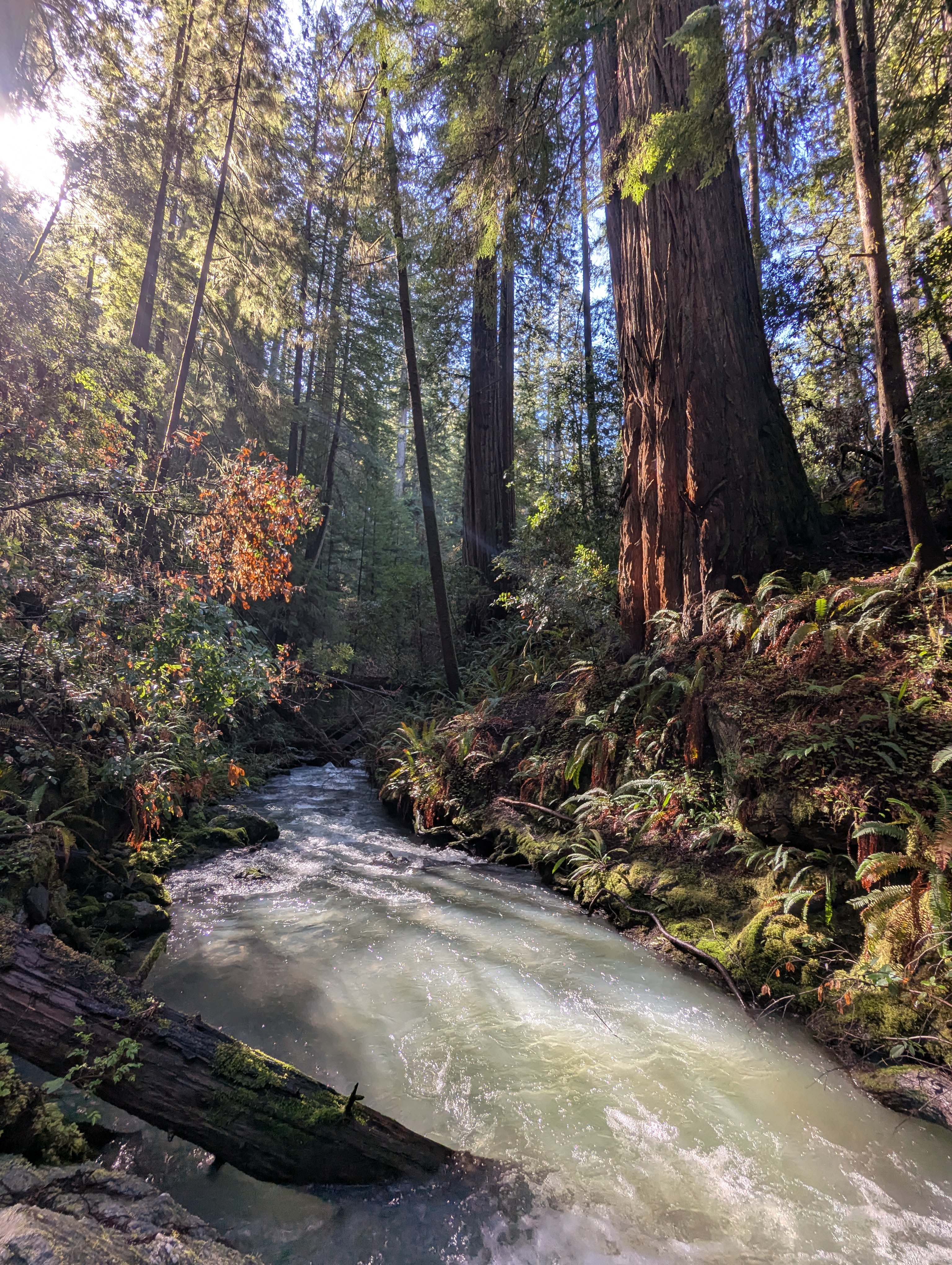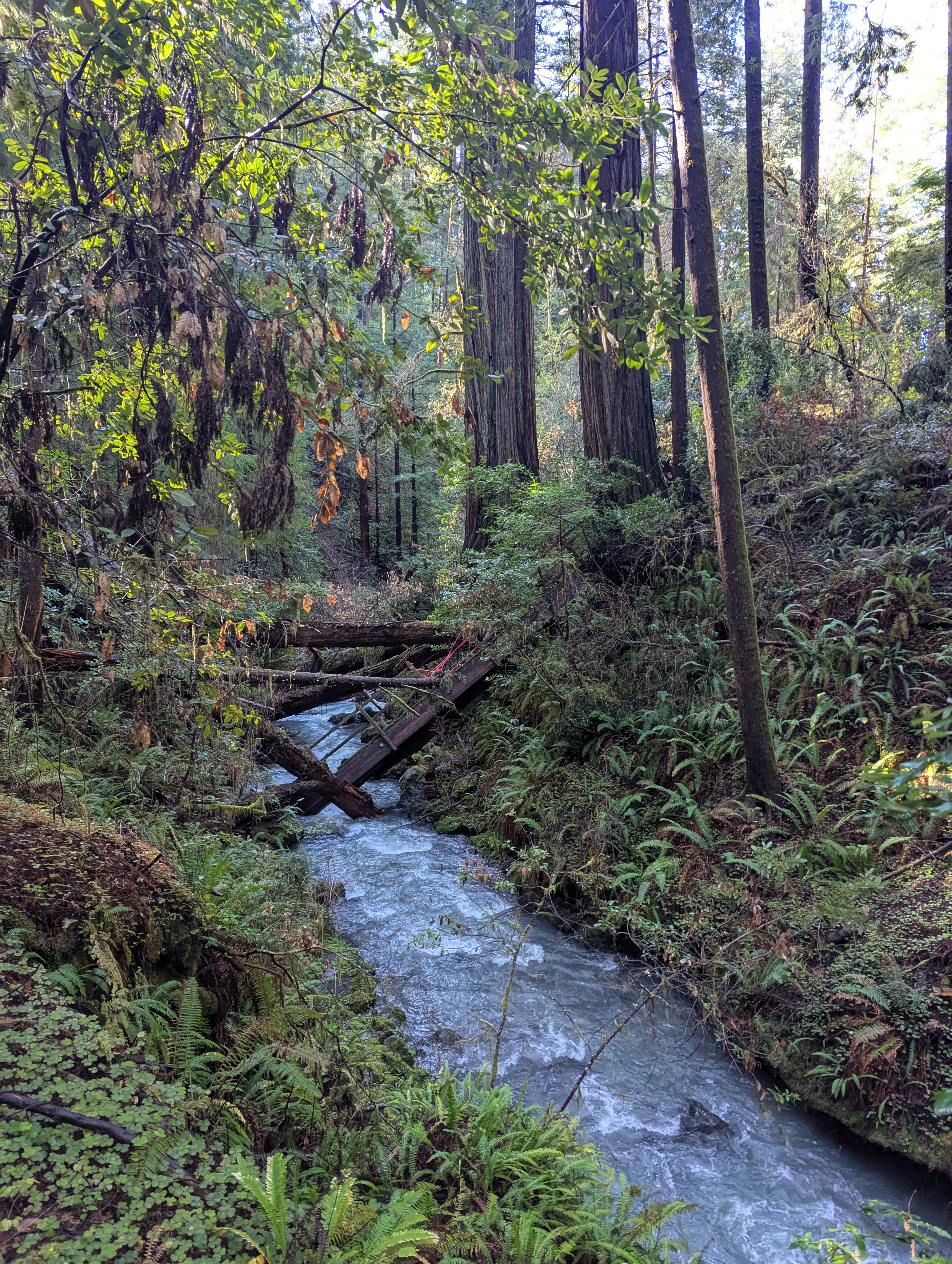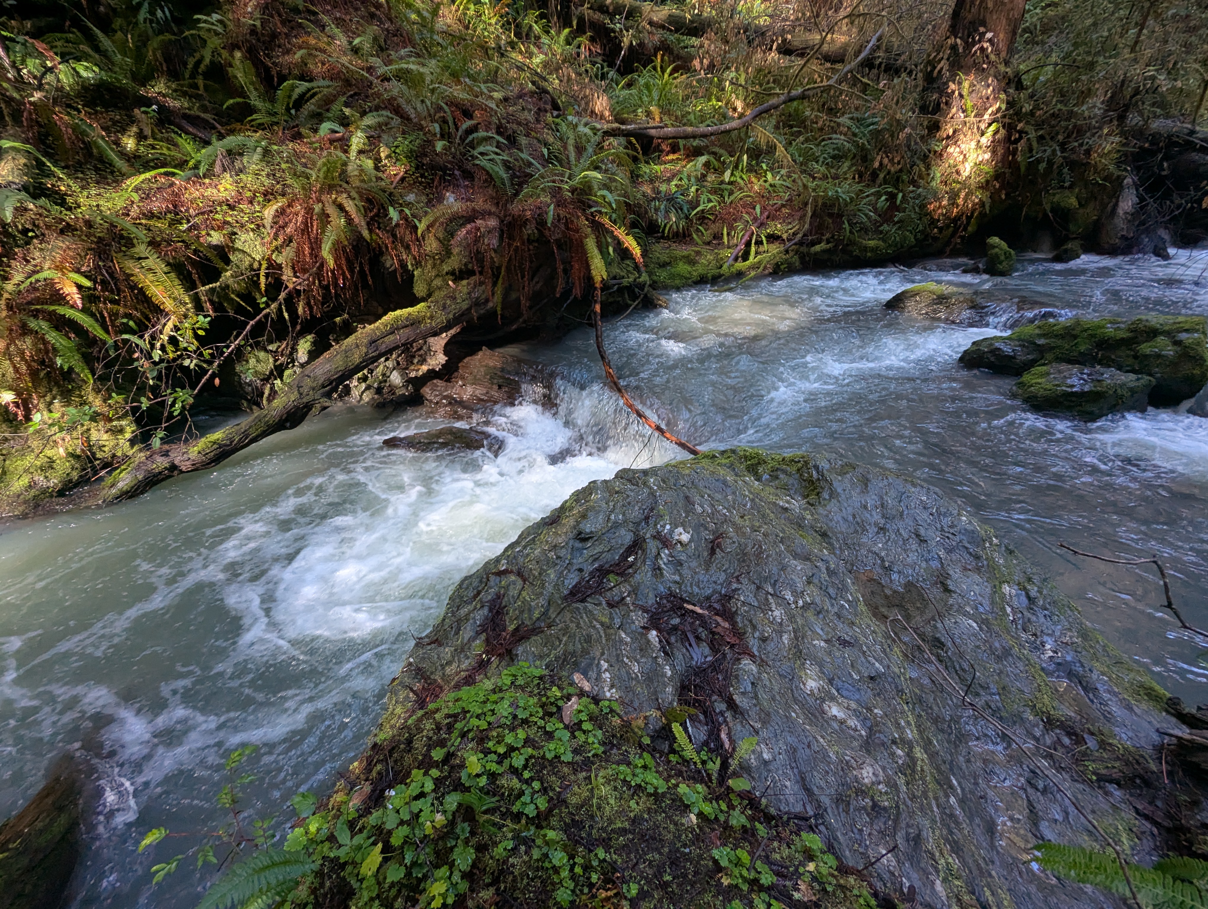 I backtrack to where there’s a faint footpath headed over the edge and make my way down to the creek’s edge. The creek has exposed some lovely Redwood Creek Schist. I look down the creek and can see a giant tree spanning high above the water. It seems like there might also be a small tree to cross upstream but I don’t bother checking it out. There’s a tricky rock hop in front of me but I decide to head back and check on the giant tree.