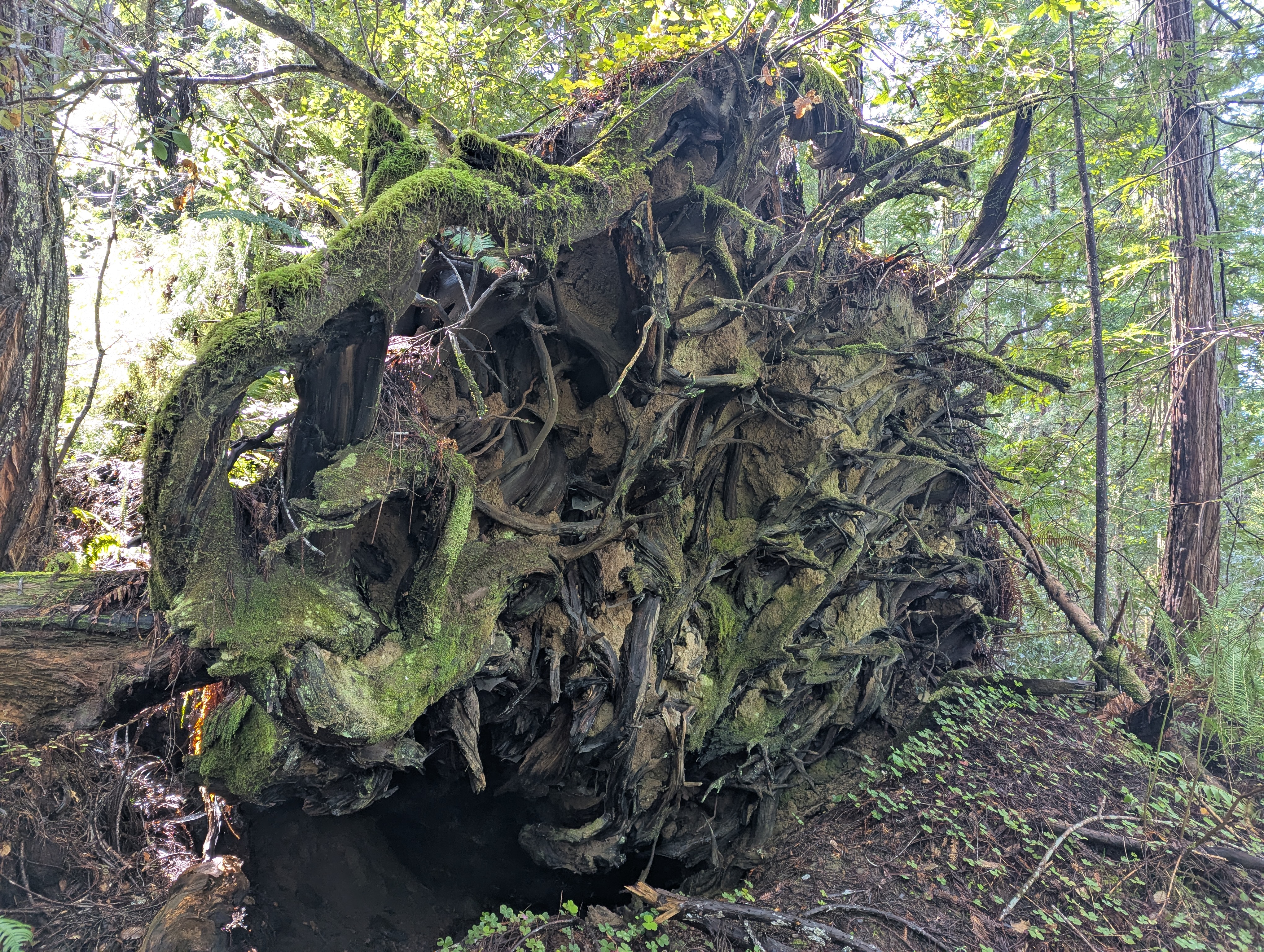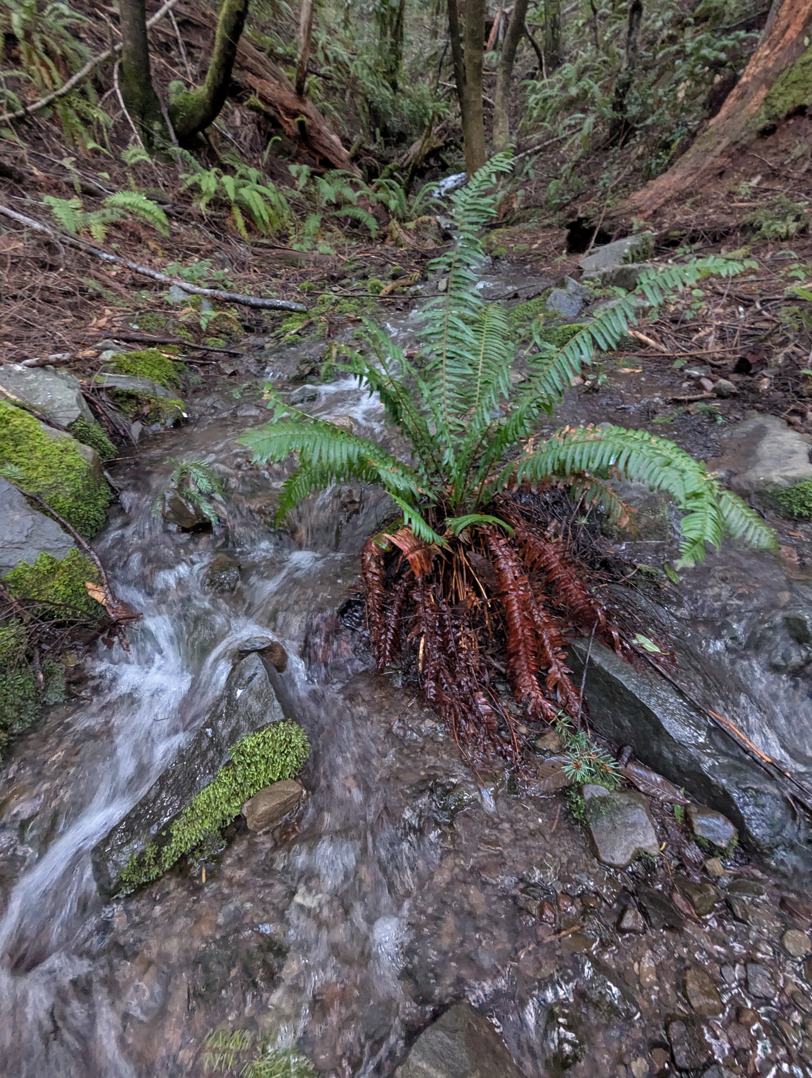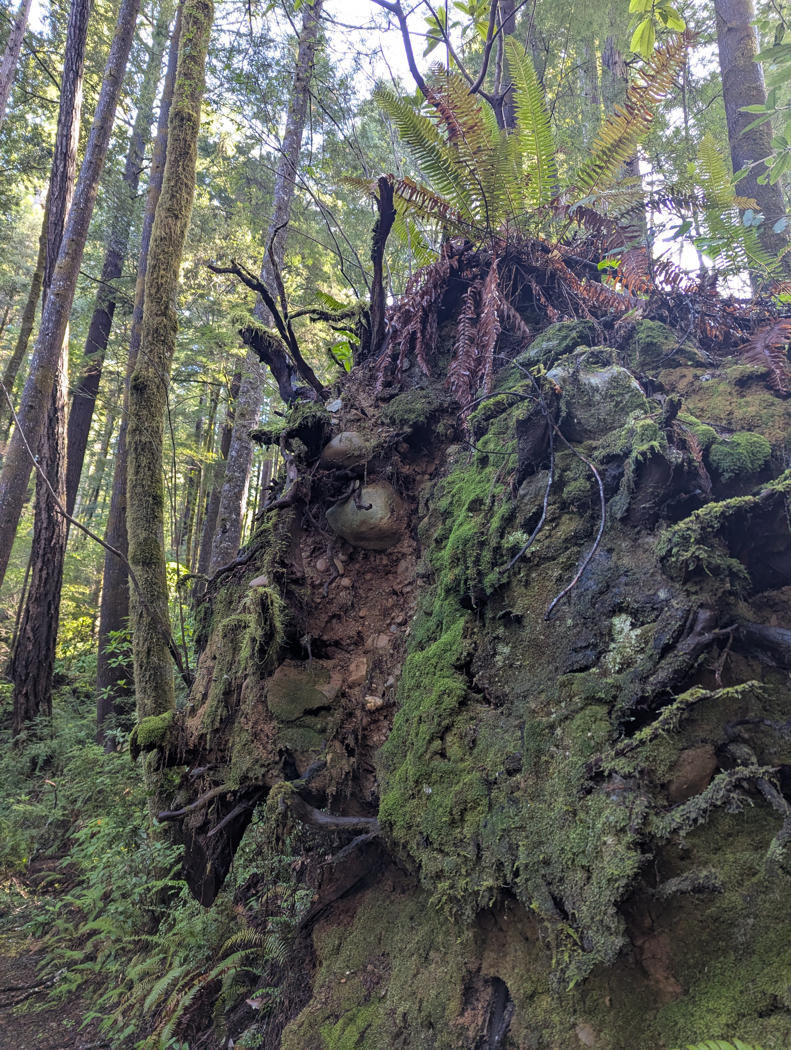 I backtrack to where there’s a faint footpath headed over the edge and make my way down to the creek’s edge. The creek has exposed some lovely Redwood Creek Schist. I look down the creek and can see a giant tree spanning high above the water. It seems like there might also be a small tree to cross upstream but I don’t bother checking it out. There’s a tricky rock hop in front of me but I decide to head back and check on the giant tree.