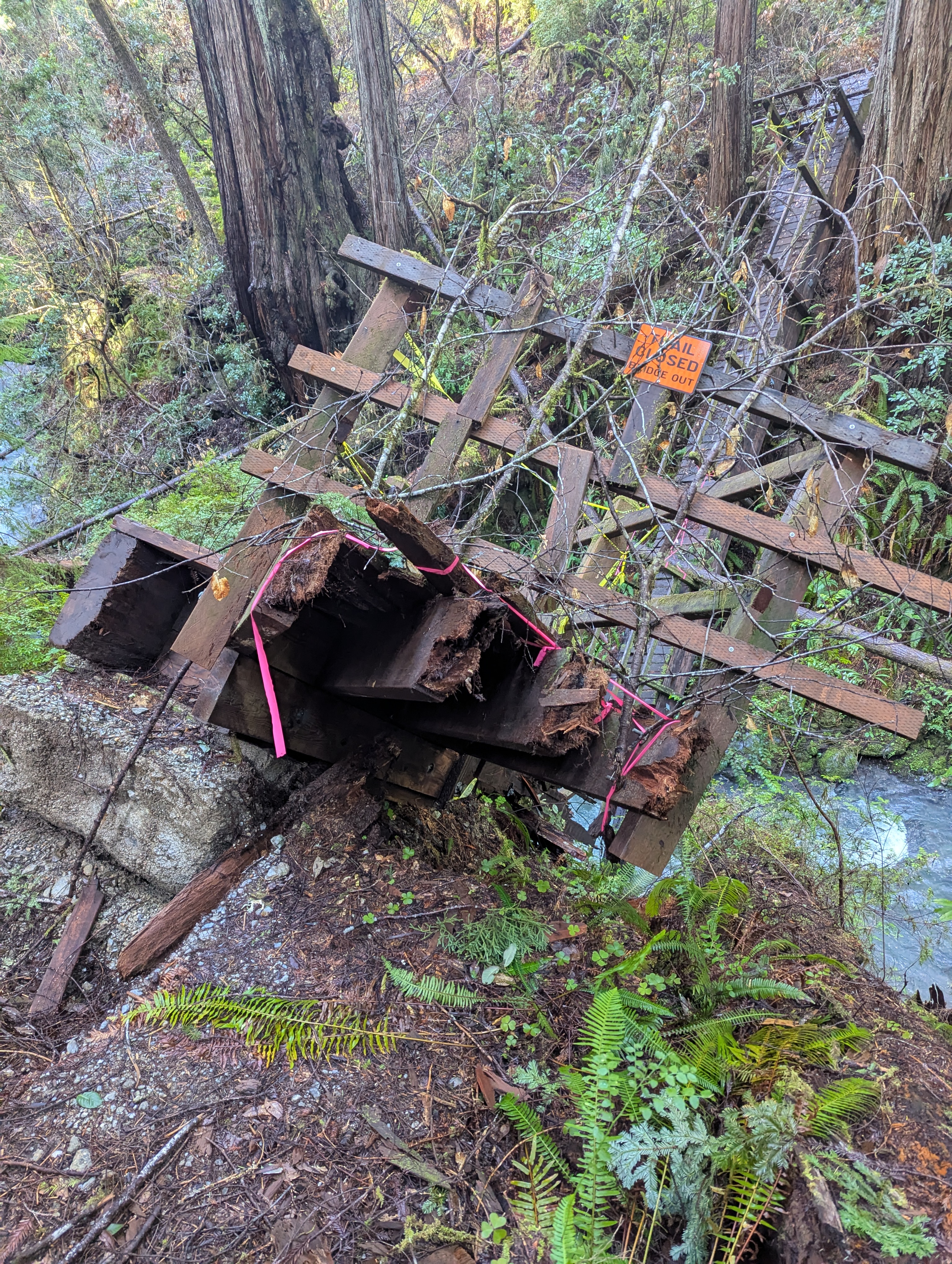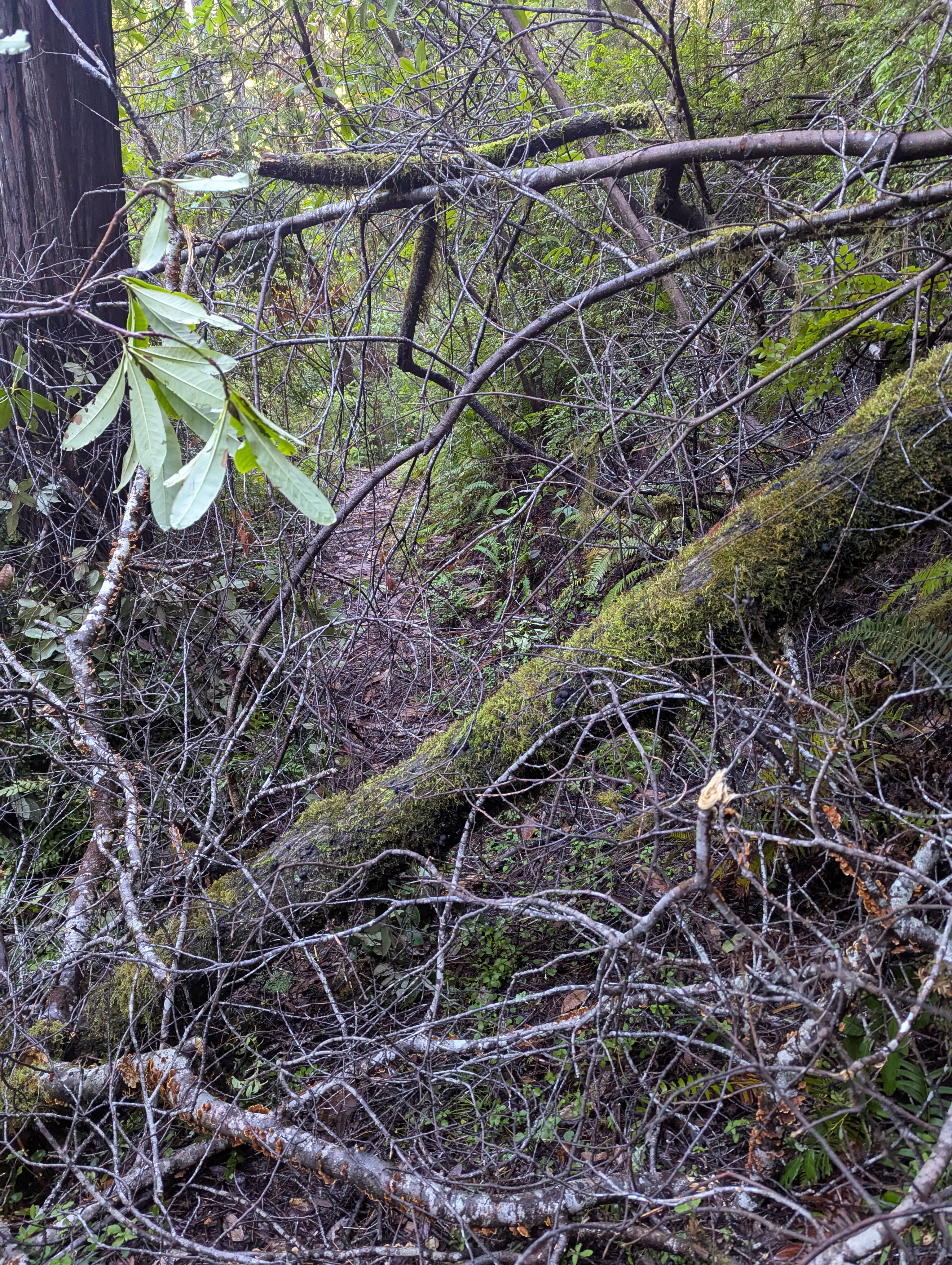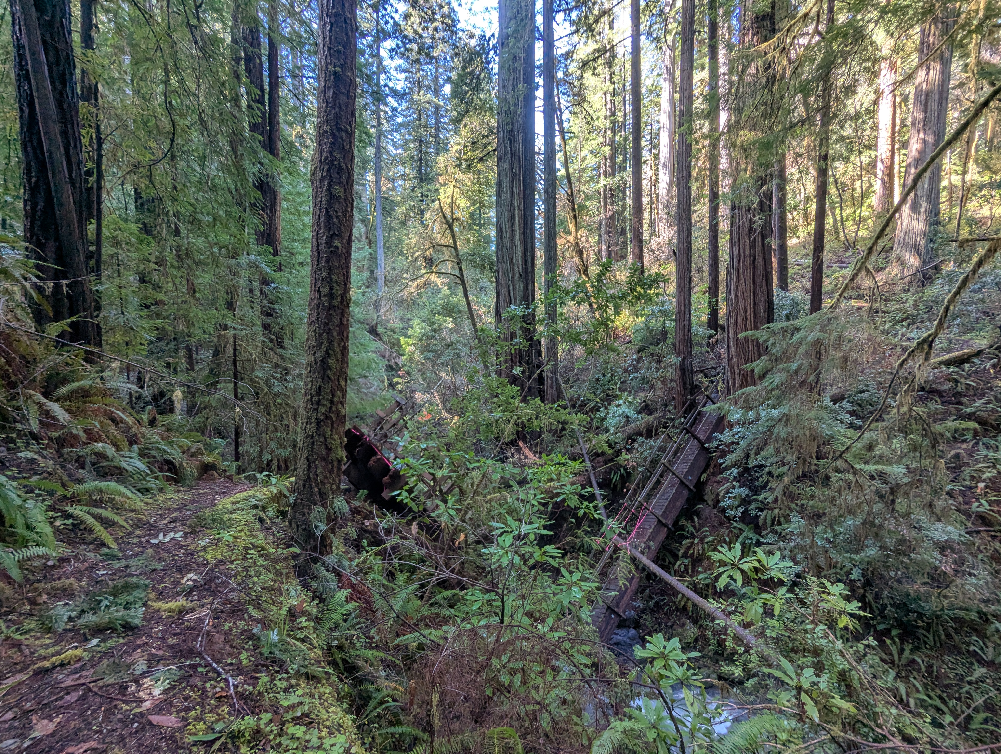 I scramble over the old bridge’s crumbling foundation down to the giant tree. I step on it and its wood is soft under my boots. I give a little bounce to check its sturdiness. I go half way across to where a huckleberry is growing and check out the scene. There’s a steep scramble up the slope on the other side but it seems to be a totally doable crossing. Plus, I have a great view of the collapsed bridge from here! Given the unknown trail conditions down to Redwood Creek, and that it’s almost 11 am, and that I plan to hike the Lyons Ranch Loop today, I reluctantly opt to turn around.
