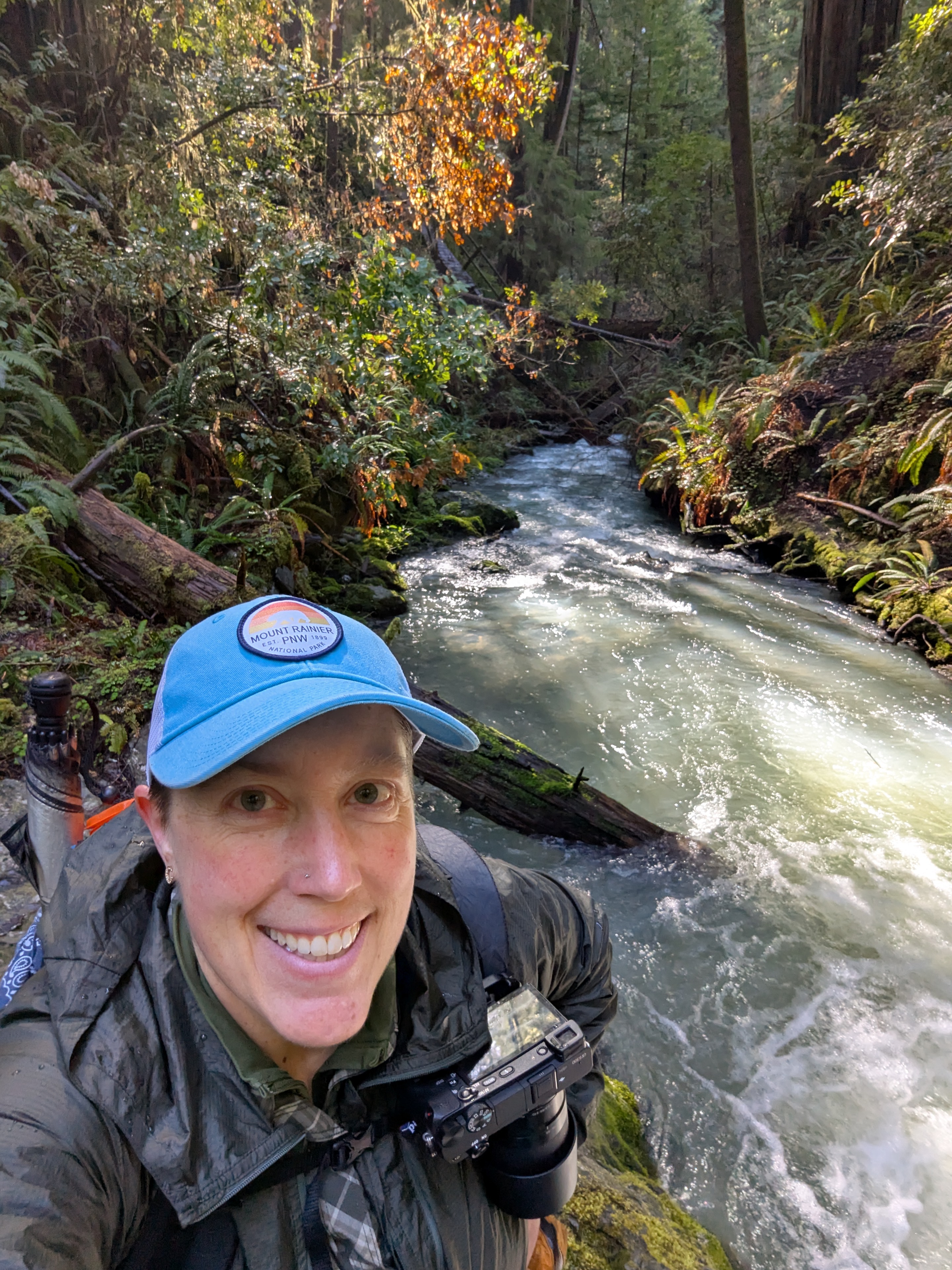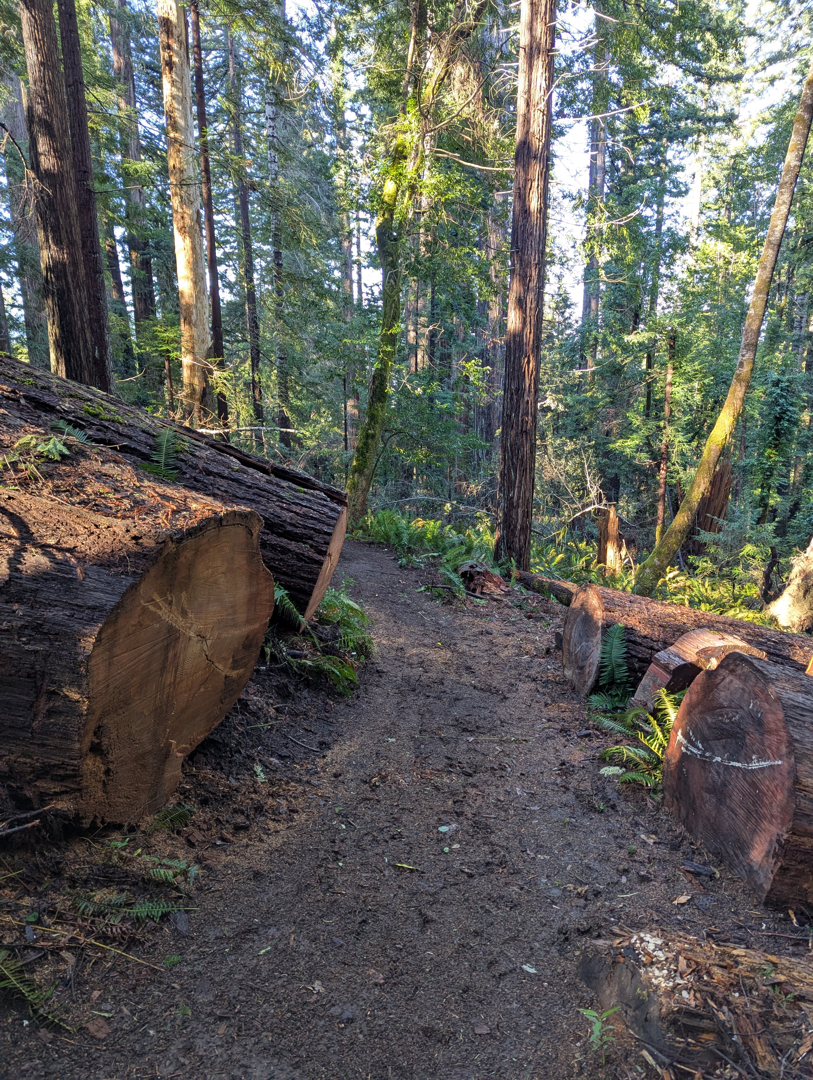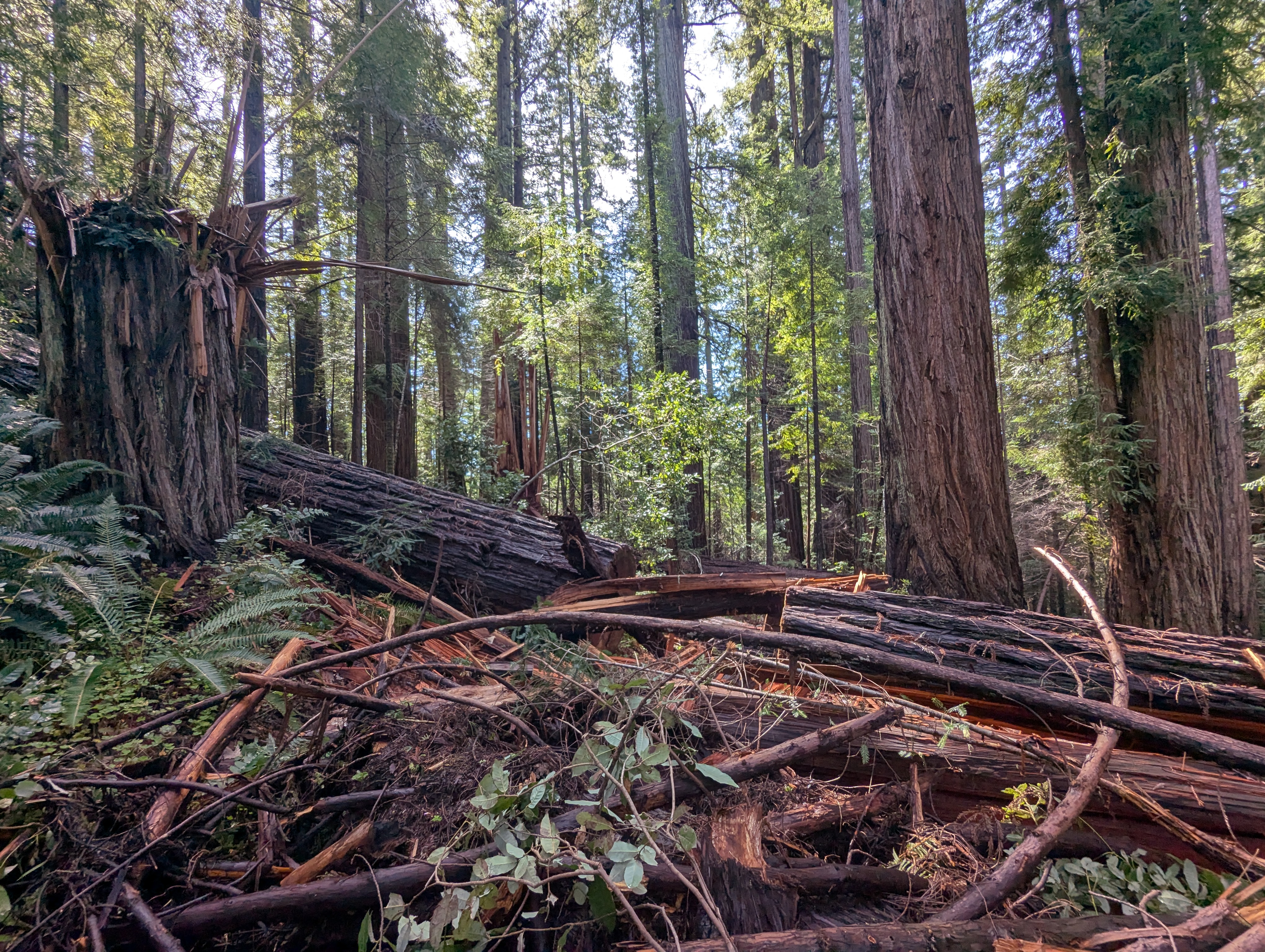 I scramble over the old bridge’s crumbling foundation down to the giant tree. I step on it and its wood is soft under my boots. I give a little bounce to check its sturdiness. I go half way across to where a huckleberry is growing and check out the scene. There’s a steep scramble up the slope on the other side but it seems to be a totally doable crossing. Plus, I have a great view of the collapsed bridge from here! Given the unknown trail conditions down to Redwood Creek, and that it’s almost 11 am, and that I plan to hike the Lyons Ranch Loop today, I reluctantly opt to turn around.