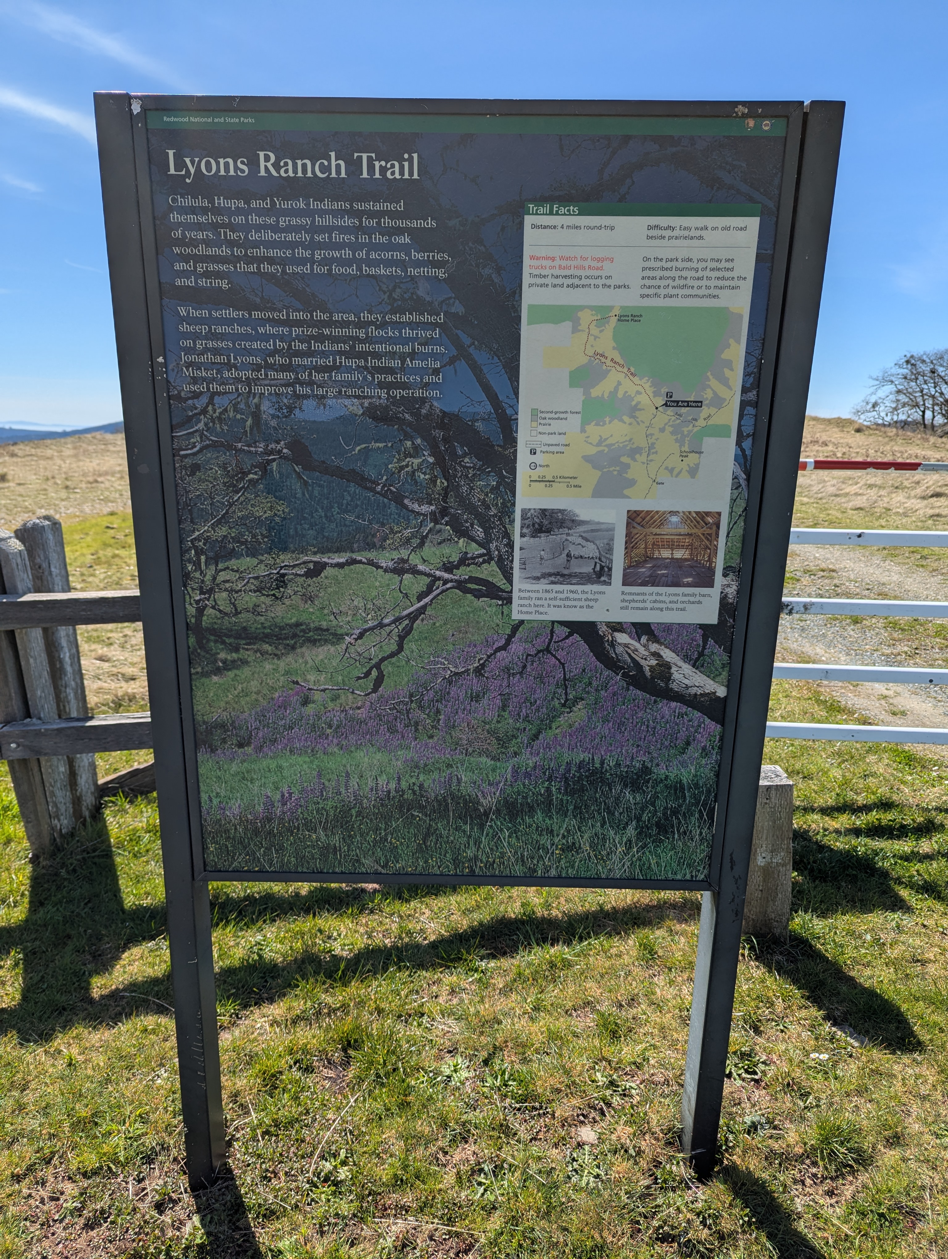 When settlers moved into the area, they established sheep ranches, where prize-winning flocks thrived on grasses created by Indians’ intentional burns. Jonathan Lyons, who married Hupa Indian Amelia Misket, adopted many of her family’s practices and used them to improve his large ranching operation.”